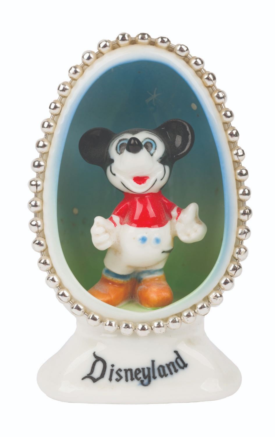 (Disneyland, 1950s-60s) A ceramic egg souvenir of Disneyland featuring Mickey Mouse. Measuring 2.75” tall and 1.75” at its widest, the souvenir displays in very good condition.