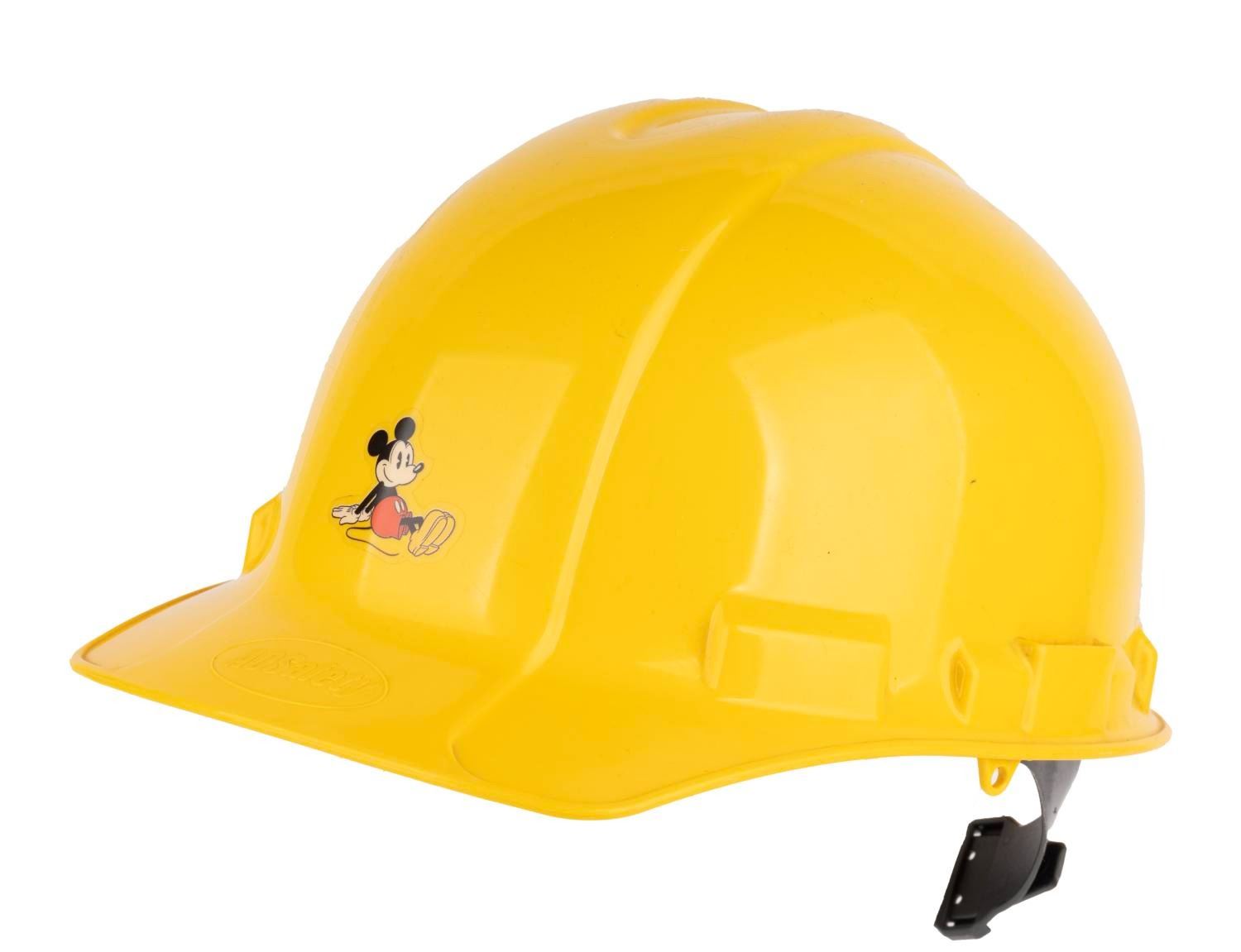 (Disneyland) A Disneyland hard hat with a Mickey Mouse decal, worn in select backstage areas, during attraction maintenance or construction. Measuring 11.5" x 8.5" x 8", the adjustable hard hat is in very good condition with scuffs, and wear to padding on straps.