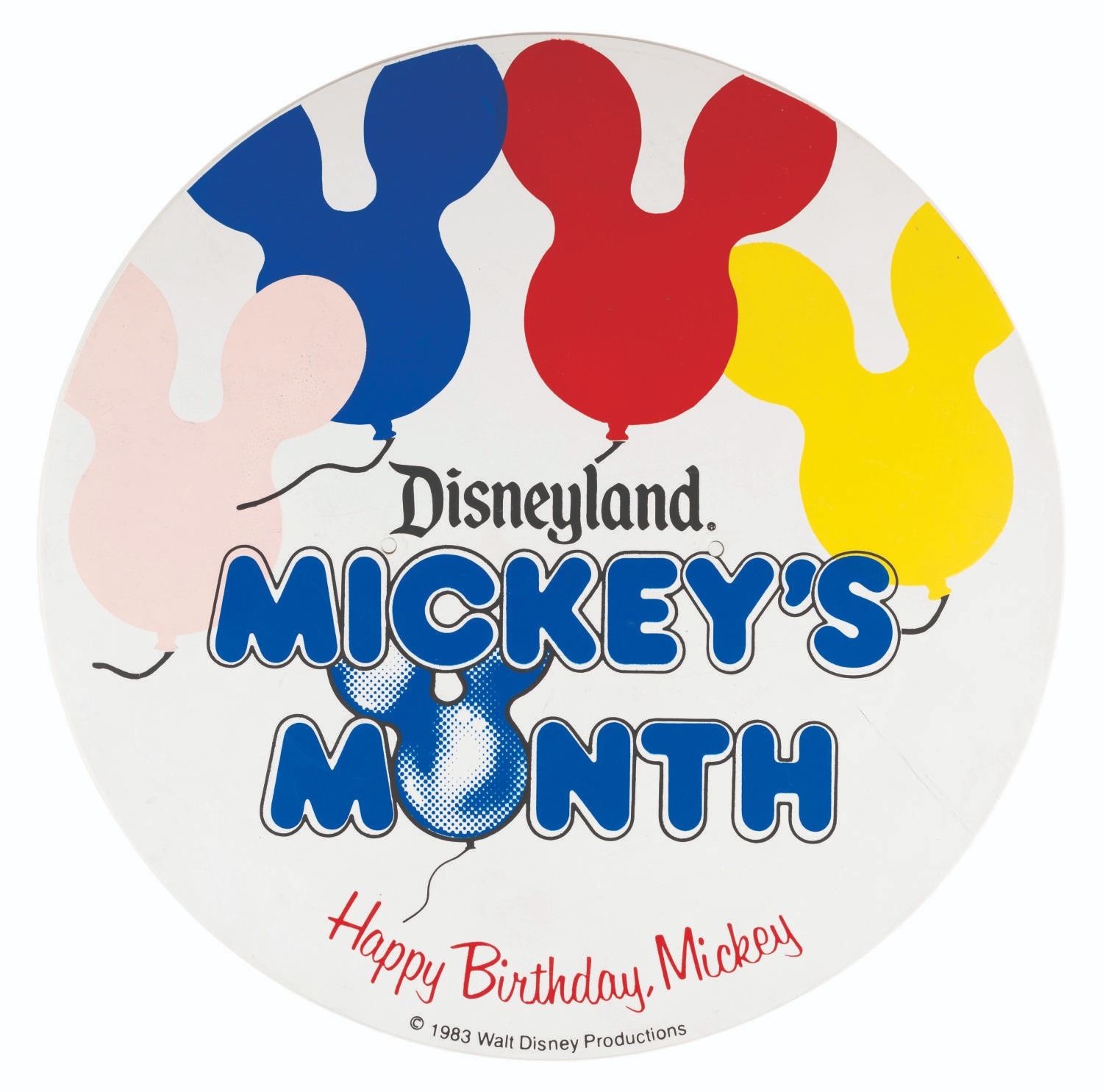 (Disneyland, 1983) A Park-used Mickey's Month lamppost sign from Disneyland’s celebration of Mickey’s birthday. Measuring 15.75" in diameter, the PVC board sign is in good condition with light scuffs, scratches and overall wear from Park display.
