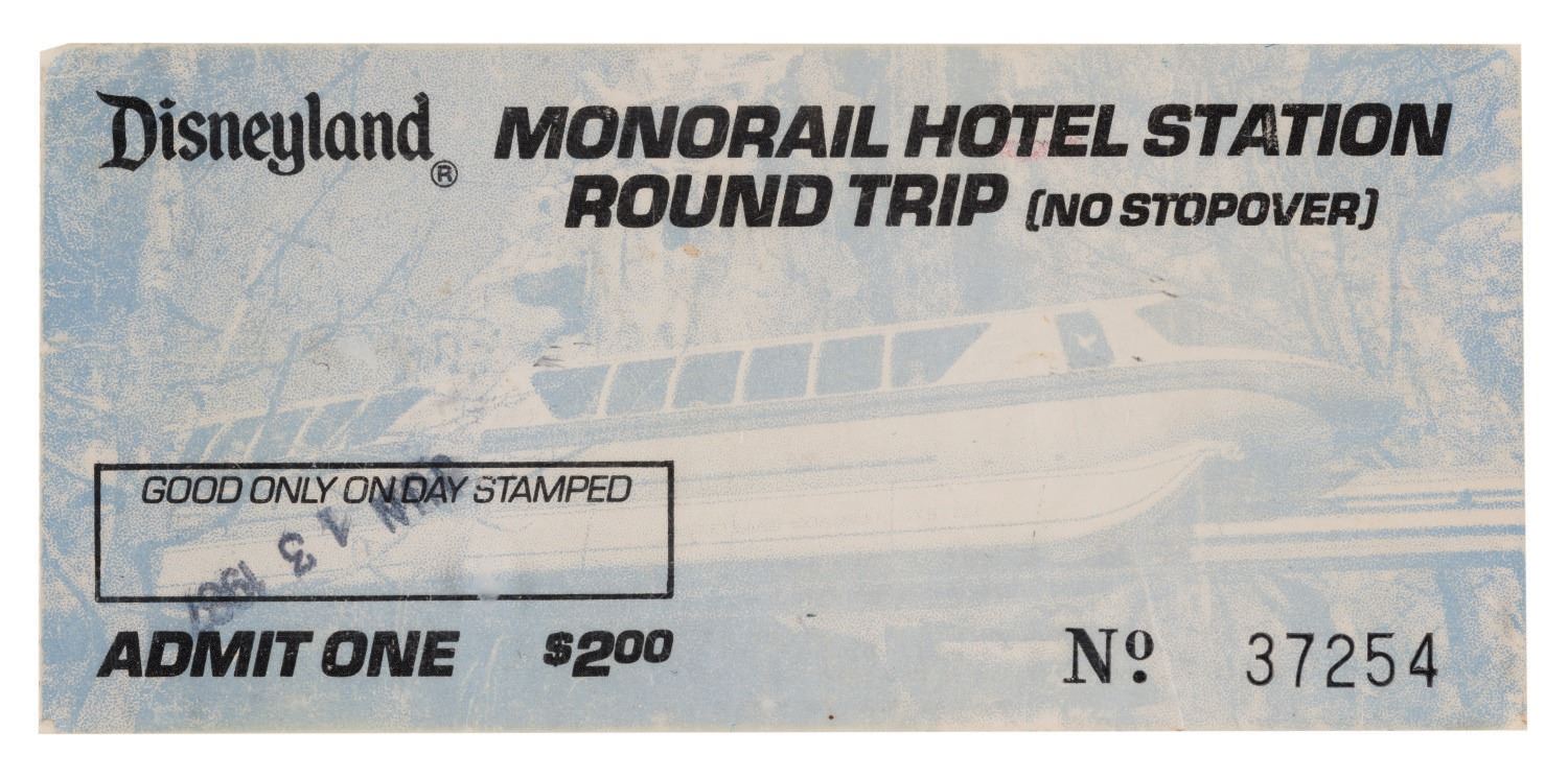 Disneyland, 1987) A Disneyland Monorail Hotel Station Round Trip ticket. The ticket, numbered "37254" is stamped with the date "Jun 13, 1987." Measuring 2.25"x4.75", the vintage ticket is in good condition, exhibiting a few creases, minor indentations, and wear to edges and corners.