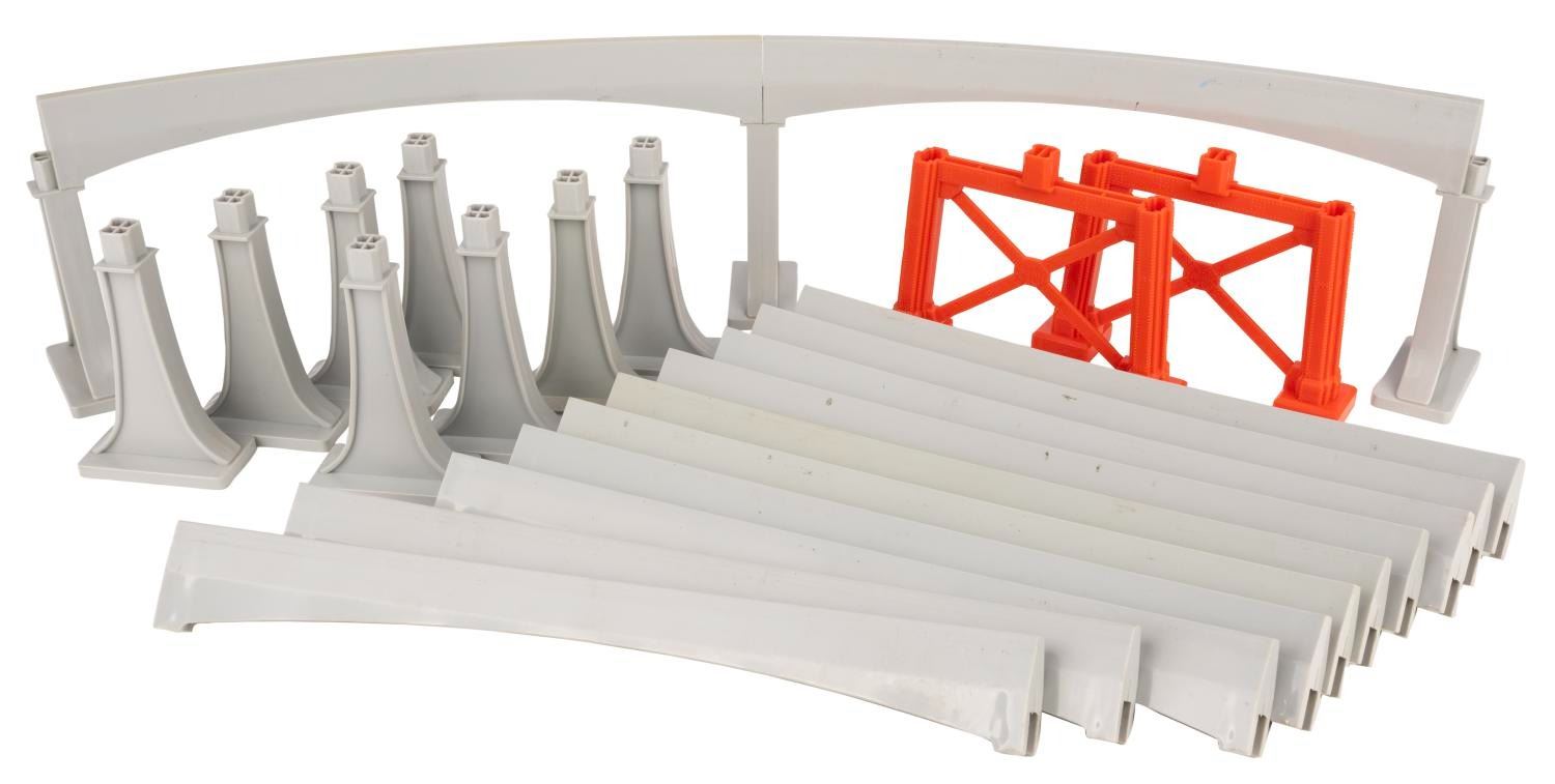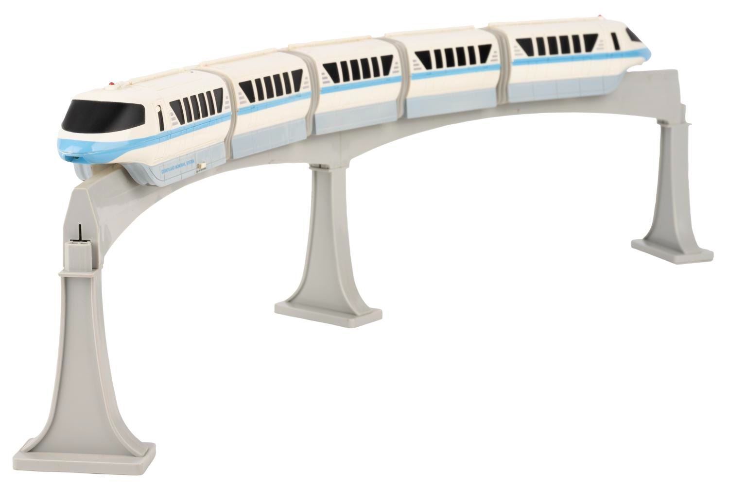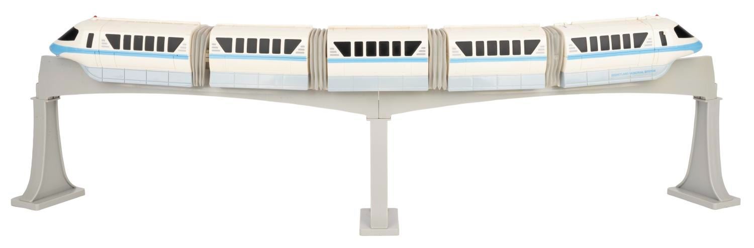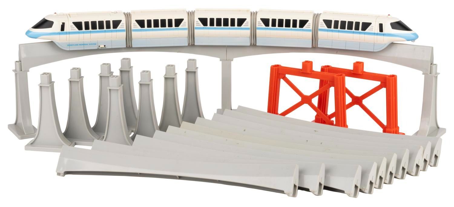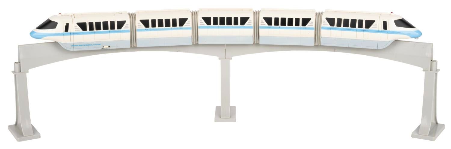 (Disneyland, 1990s-2000s) A toy monorail with track. The set includes a two-engine three-car monorail. With two “AA” batteries (not included) one engine operates to push or pull the 24” train. Included are the train, 12 curved track pieces, 11 single supports, and two wide orange supports. The set functioned when tested and is in good condition, with light wear overall from age and use.