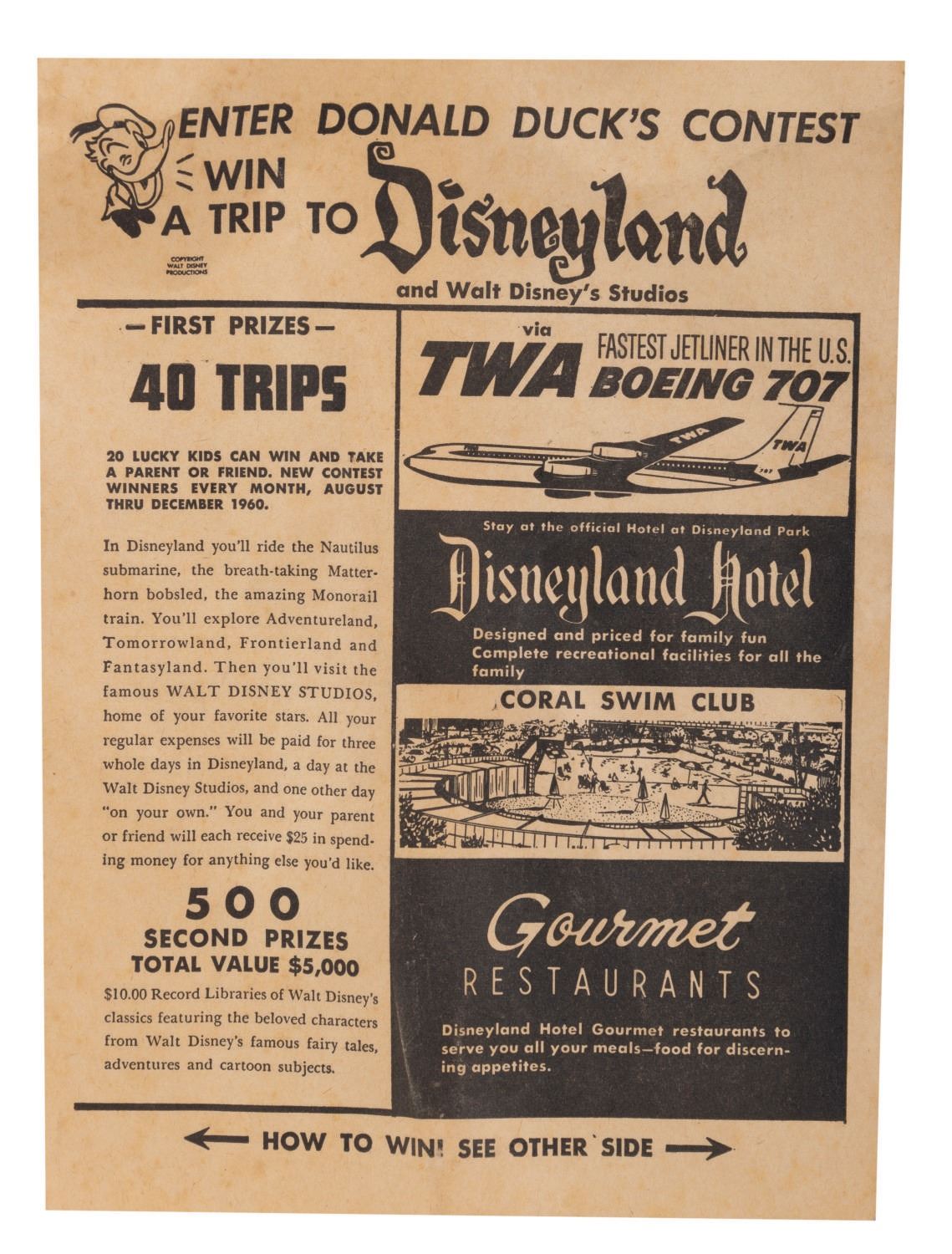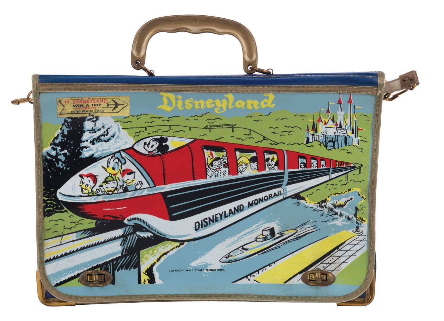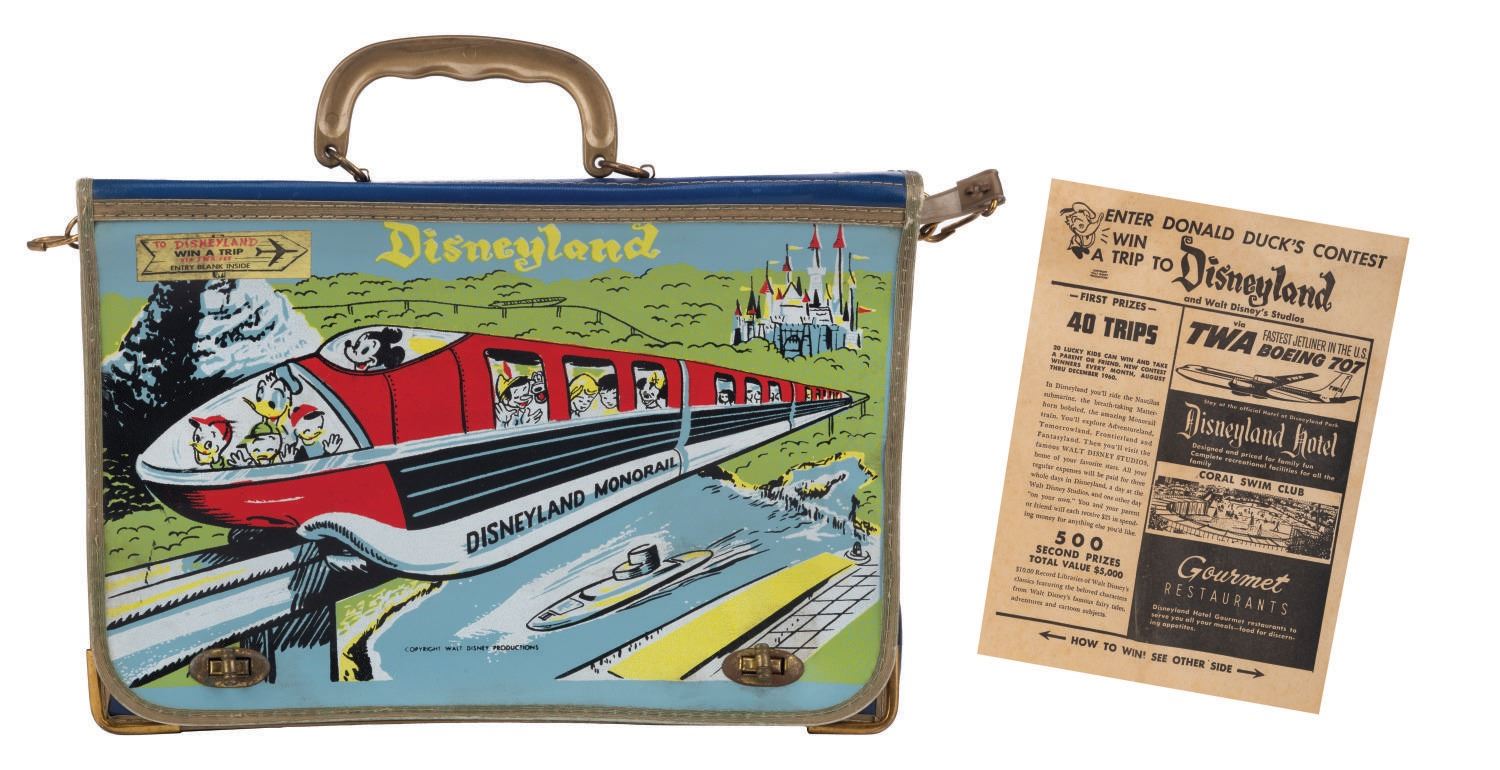 (Disneyland, 1960s) An early Monorail Travel Bag, with plastic handle, vinyl strap, and screen-printed imagery of Disney characters aboard the Monorail soaring over the Submarine Lagoon and Matterhorn Mountain in Tomorrowland. The bag also notably retains a "To Disneyland Win A Trip" signpost contest sticker and entry form (applied to most Walt Disney Productions merchandise between September and November of 1960). Measuring 9.5" tall and 14.5" wide, the bag is in very good shape, with light scuffs, minor warping from age, and ink staining to the interior.