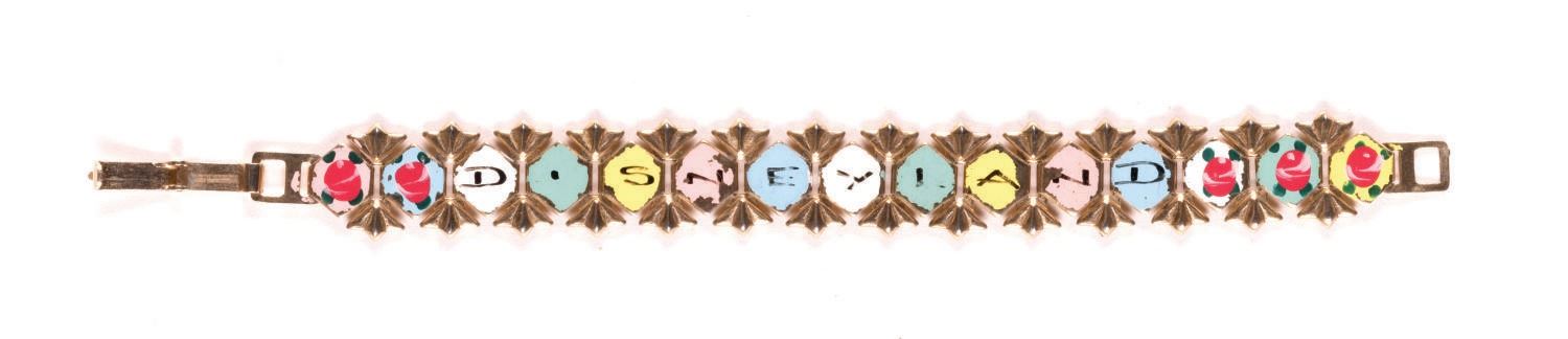 (Disneyland, 1950s-1960s) A hand-painted metal bracelet from the earliest years of the Park. "Disneyland" is spelled out across the middle links, with roses painted on the outer (5). Measuring 6" long, the bracelet is in good condition with some paint loss to the lettered links.