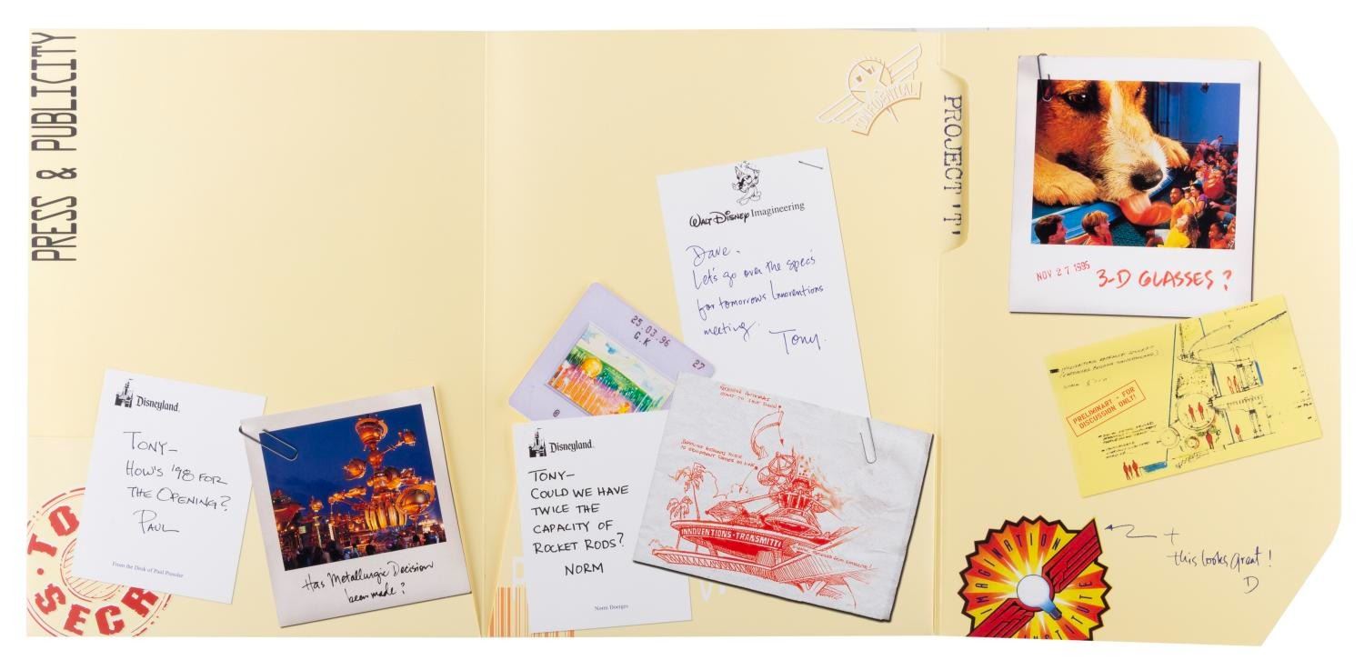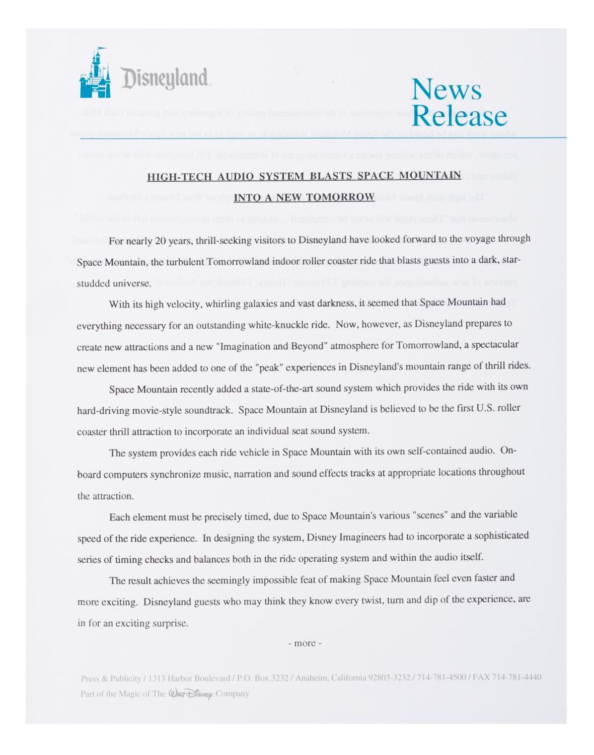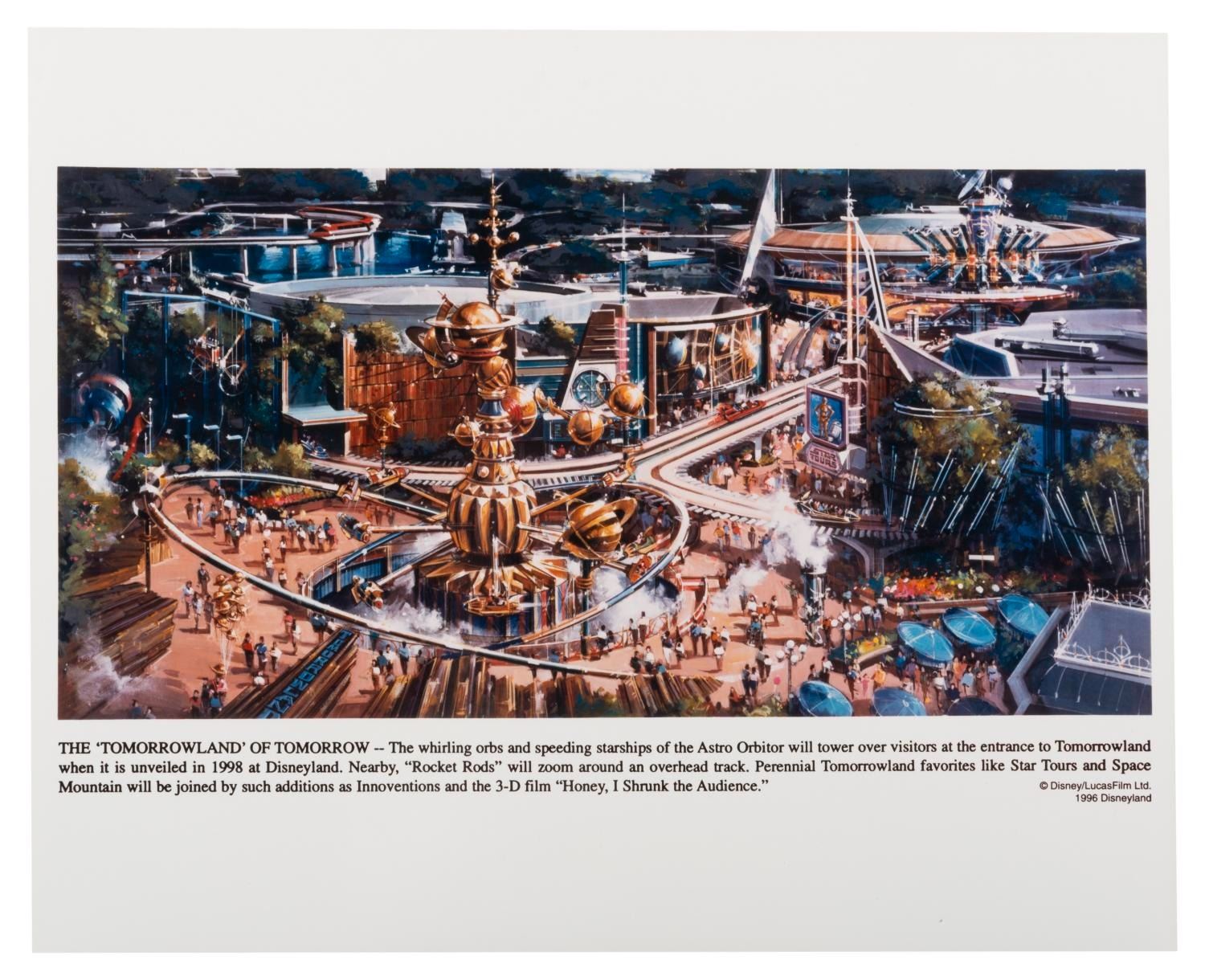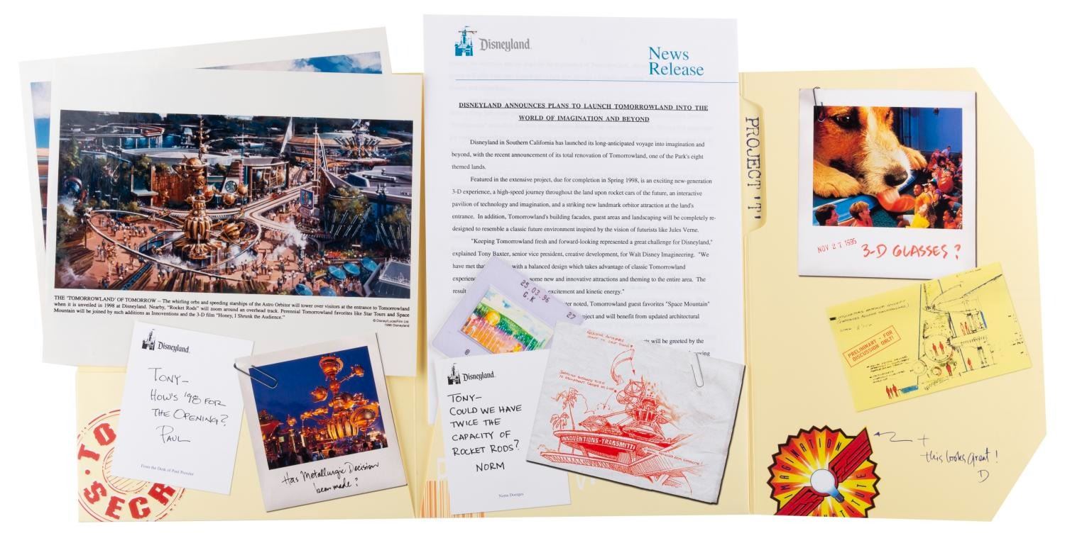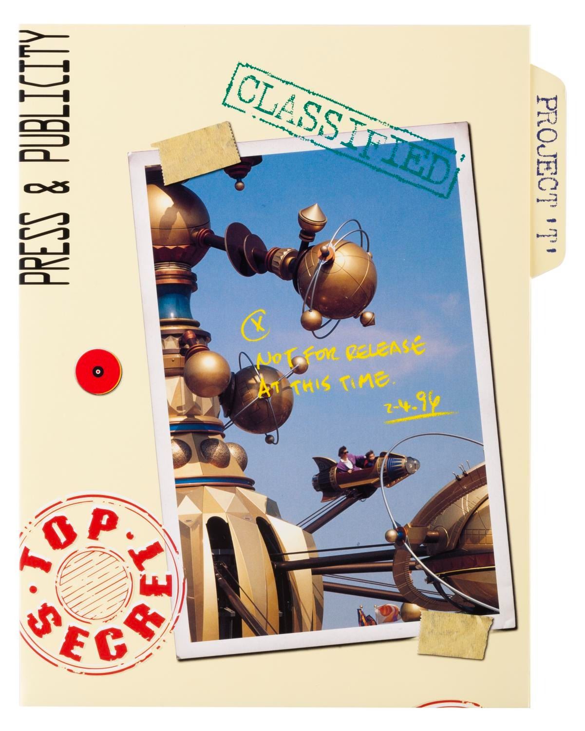 (Disneyland, 1998) A press kit promoting the New Tomorrowland refurbishment at Disneyland. Included are two color concept art photos of the new land and two press release documents about updated Space Mountain Audio and other upcoming attraction additions and changes. Measuring 10" x 13" in the original folder, the kit is in very good condition with creasing, soiling, and one staple that has oxidized and fallen out.