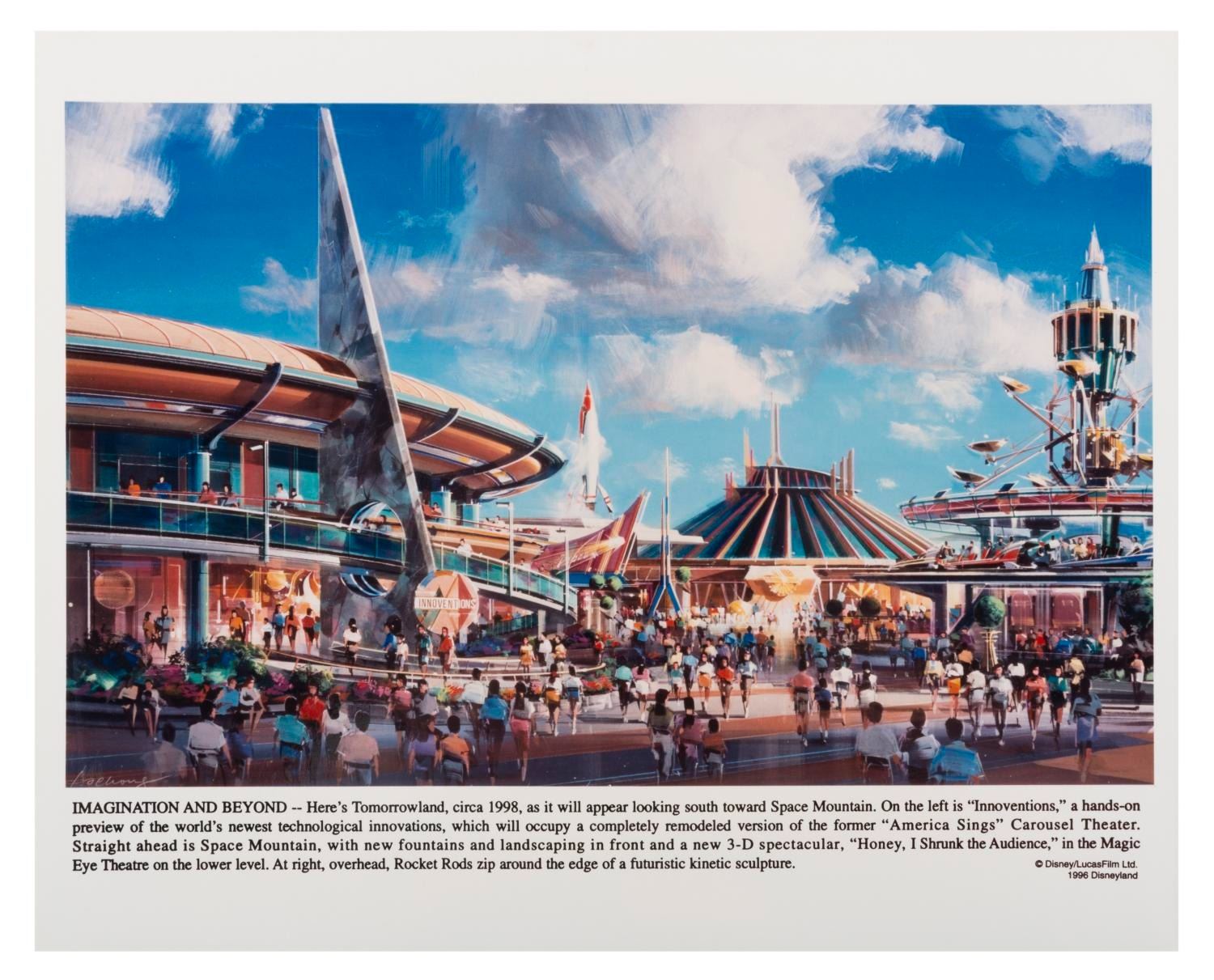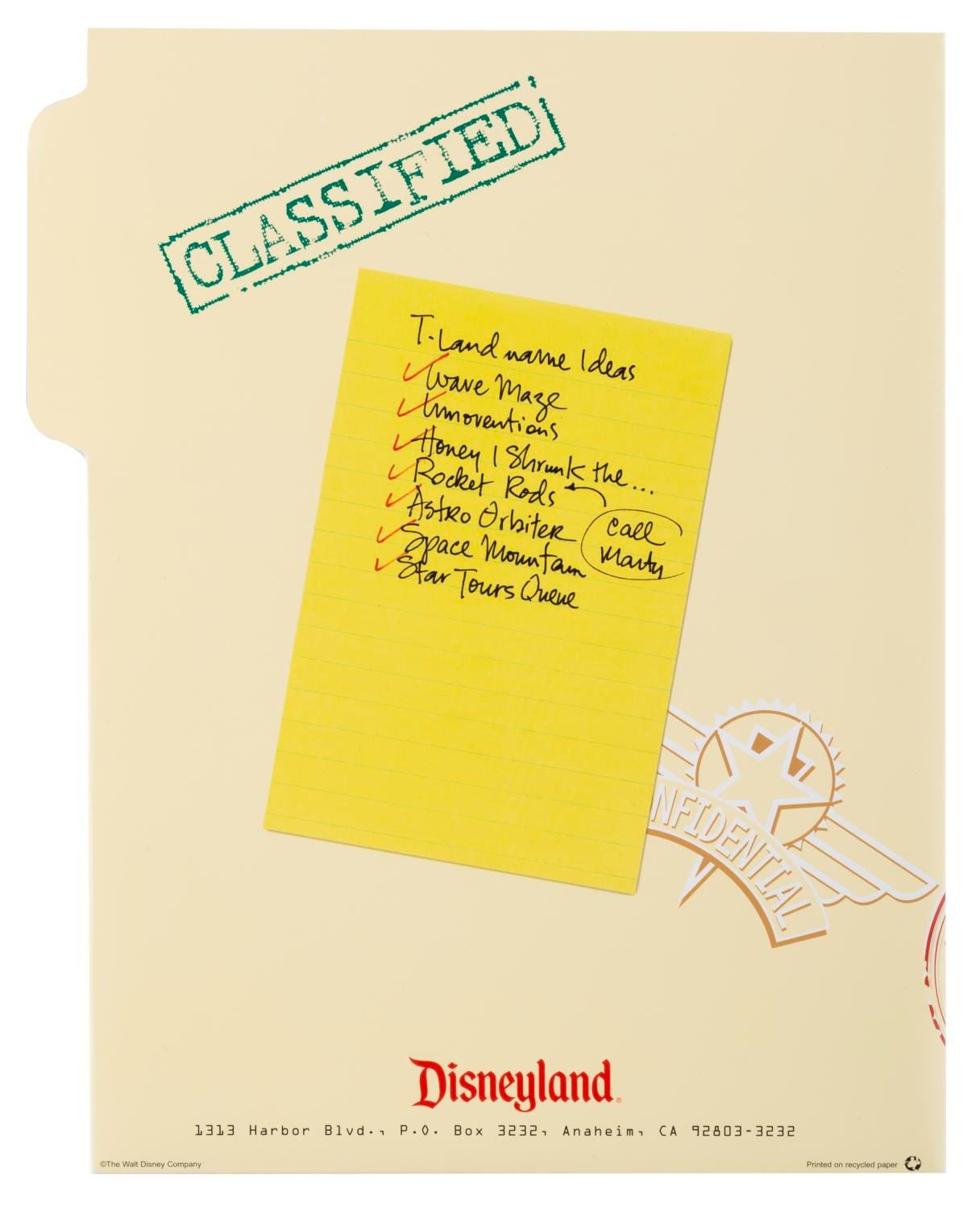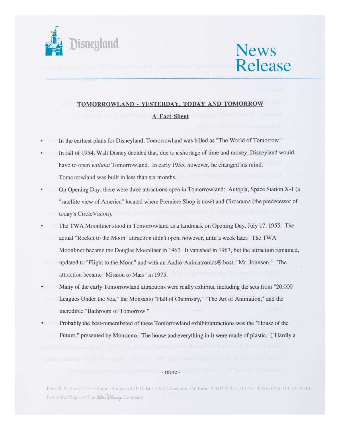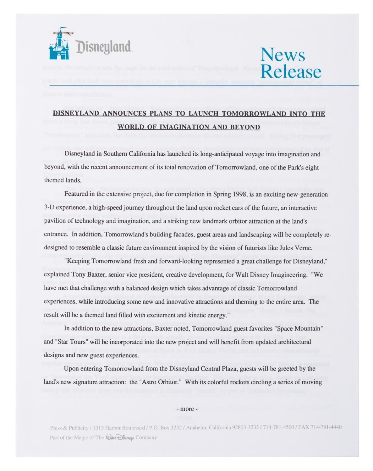 (Disneyland, 1998) A press kit promoting the New Tomorrowland refurbishment at Disneyland. Included are two color concept art photos of the new land and two press release documents about updated Space Mountain Audio and other upcoming attraction additions and changes. Measuring 10" x 13" in the original folder, the kit is in very good condition with creasing, soiling, and one staple that has oxidized and fallen out.