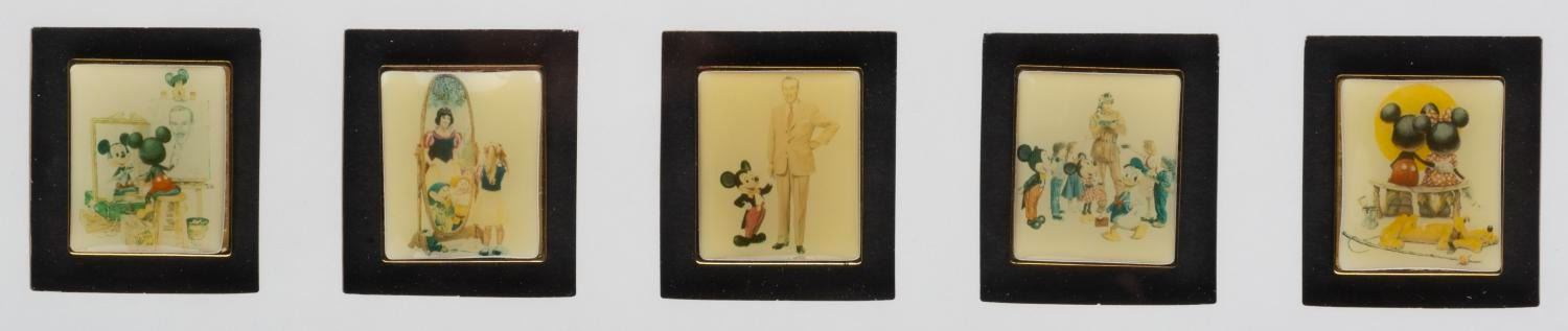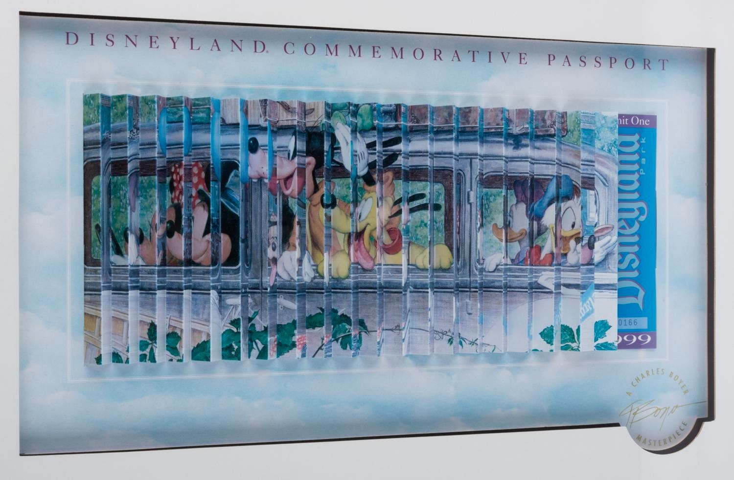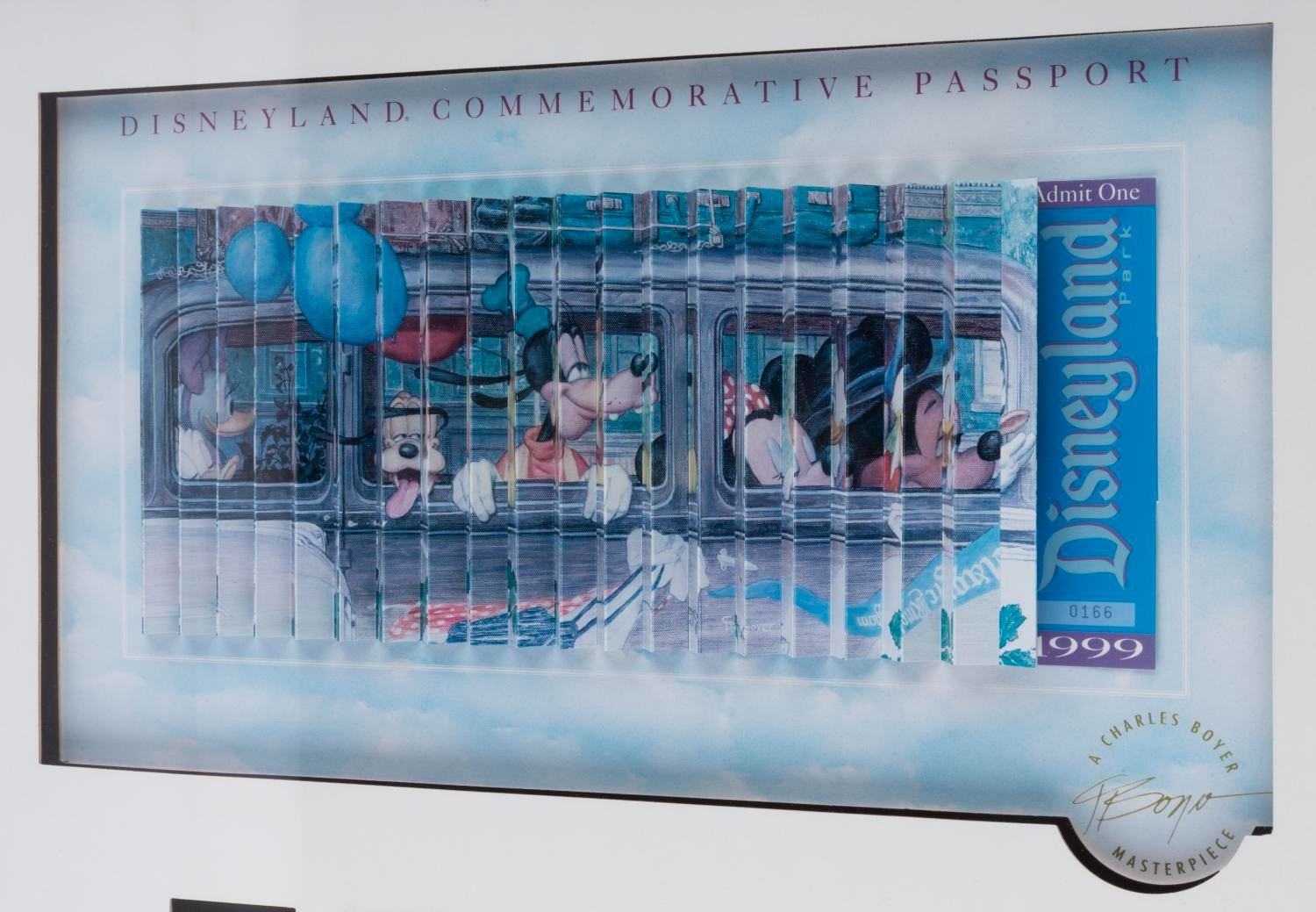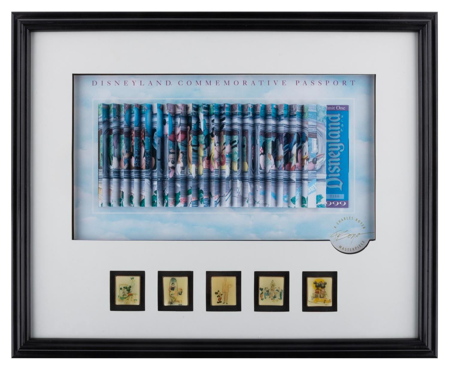 (Disneyland, 1999) A Disneyland Commemorative Passport and pin set. The passport features the artwork "A Disneyland Outing" by Charles Boyer with accordion-style folds, allowing it to be viewed from two angles. The view from the left depicts Mickey and Friends arriving at the Park, and from the right, leaving the Park. The print is framed with five pins featuring images of additional Disney paintings by Boyer and is number 166 of 1999. The passport measures 5” x 12.25” on a 9” x 15” visible print and the pins measure 1.25” x 1.5”. The entire matted framed piece measures 17.5” x 21.5”. The artwork is in good to fair condition with light discoloration to the print, the images on the pins have warped and partially peeled from the backing, and light scuff to the frame. $200 - $400