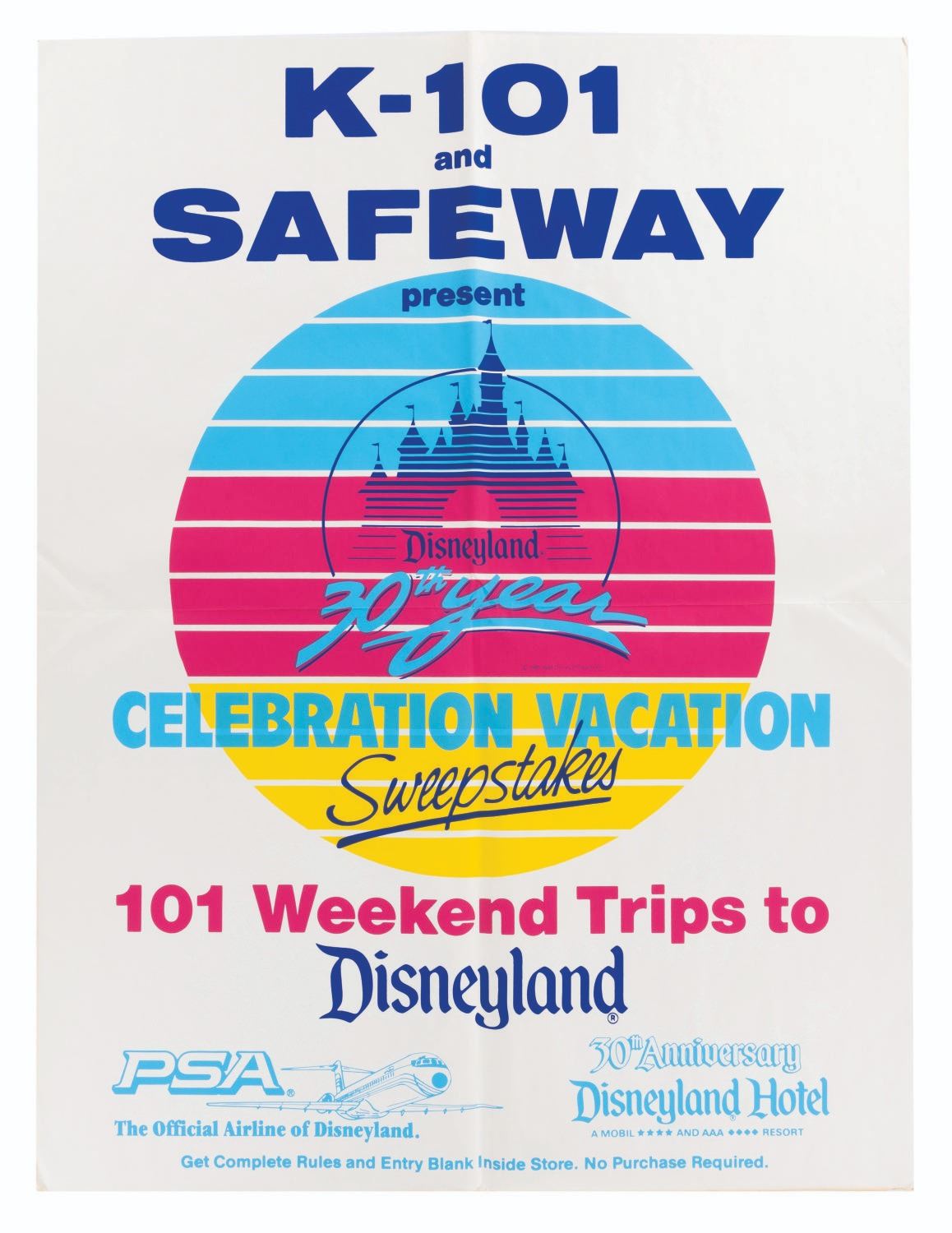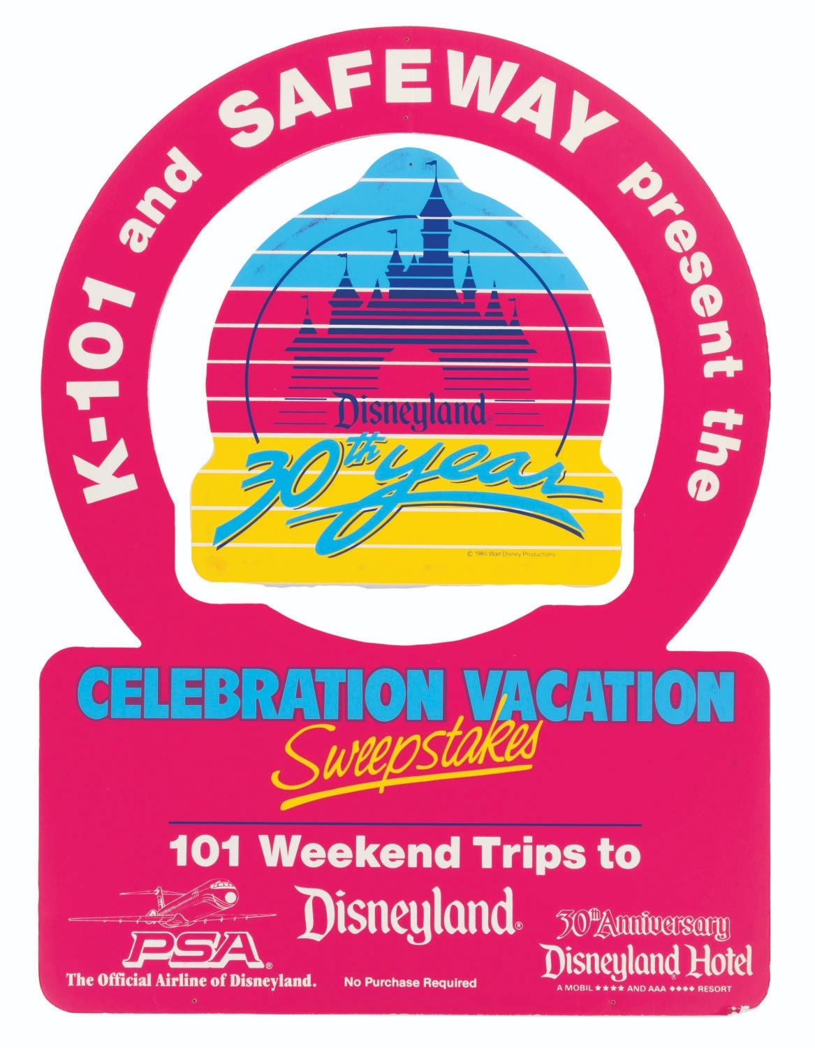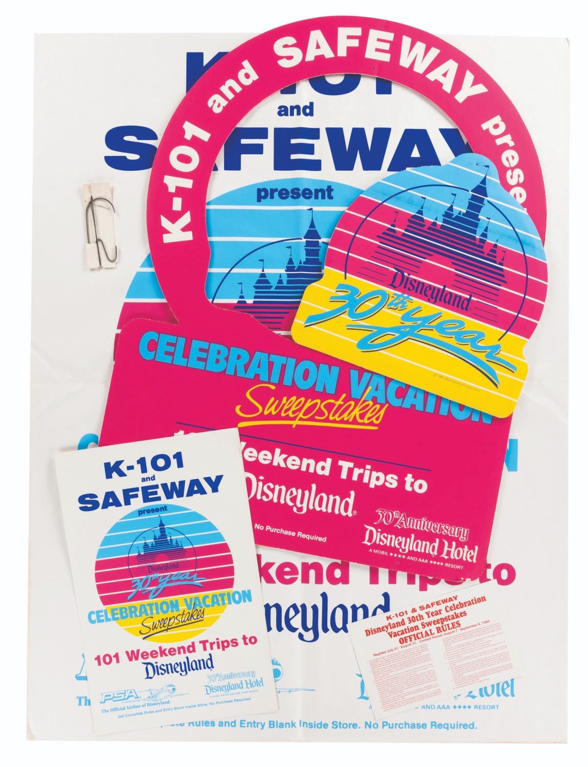 (Disneyland, 1985) A Disneyland 30th Anniversary PSA Airlines Mobile presented by K-101 & Safeway. The Celebration Vacation Sweepstakes set includes one 28" x 38" sweepstakes mobile, one 7" x 11" official sweepstakes rules card, one hook with string and barbettes, one small 13" x 20" sweepstakes poster, and one giant 37.75" x 49.5" sweepstakes poster. The set is in good to very good condition with wear, creases, edge wear, and light discoloration from age.