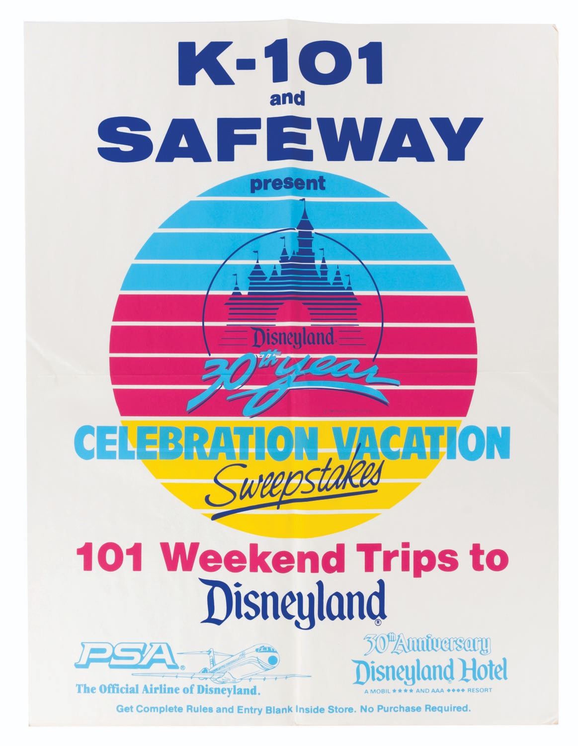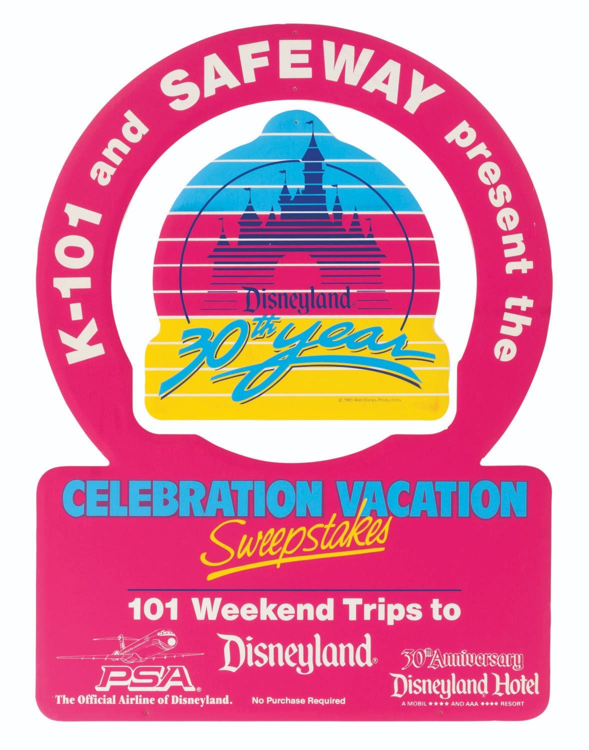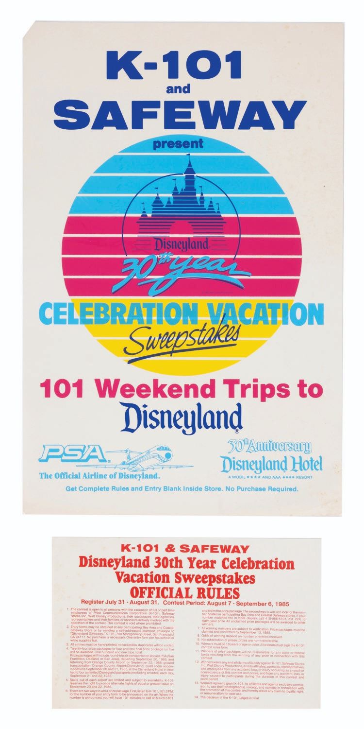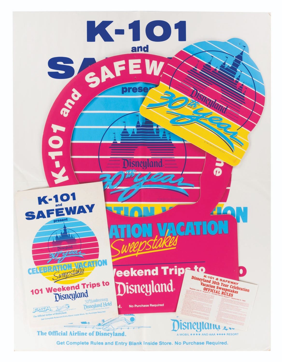 (Disneyland, 1985) A Disneyland 30th Anniversary PSA Airlines Mobile presented by K-101 & Safeway. The Celebration Vacation Sweepstakes set includes one 28" x 38" sweepstakes mobile, one 7" x 11" official sweepstakes rules card, one small 13" x 20" sweepstakes poster, and one giant 37.75" x 49.5" sweepstakes poster. The set displays in good to very good condition with wear, creases, edge wear, light discoloration from age, spotting, and a top left corner fold on the smaller poster.