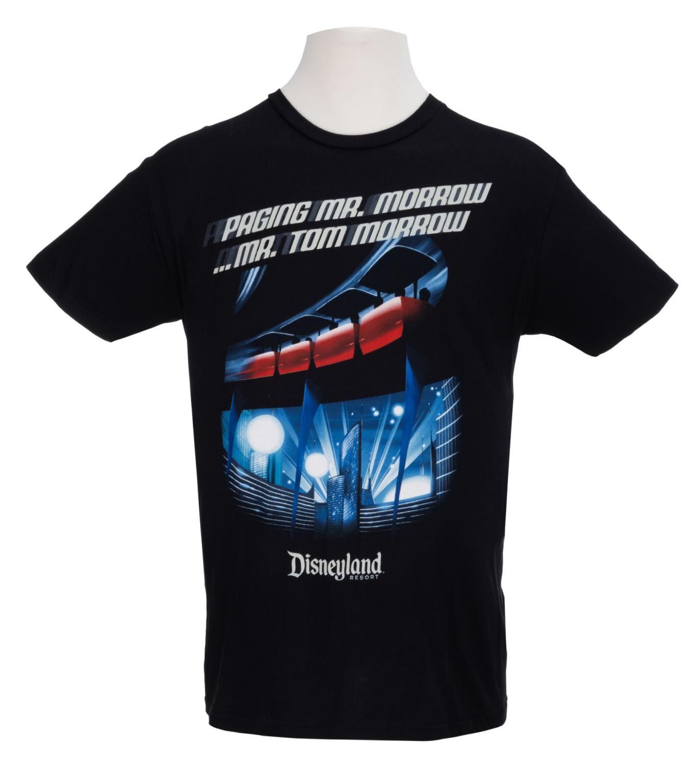 (Disneyland, 2000s) A “Paging Mr. Tom Morrow” t-shirt in homage to the announcement heard while in line to board Space Mountain. The shirt's graphics bring to life the PeopleMover attraction that closed in 1995. Labeled a size “L”, the 100 percent cotton shirt is in fine condition.