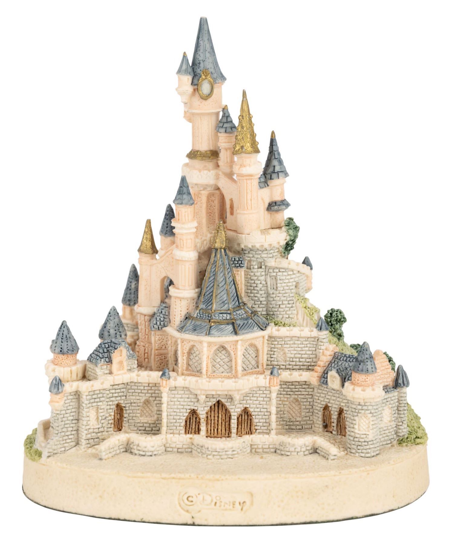 (Disneyland Paris, 1994) A limited edition Sleeping Beauty Castle by John Hine Studios. The Le Château de la Belle au Bois Dormant of Disneyland Paris with its surrounding landscape and forecourt has been delicately crafted by Bob Russell for Bob Hine Studios in England. This statue features "Euro Disney" debossed on the front of the base. Measuring 3.25" x 3.5" x 4" tall, the castle displays in very good condition with a missing spire and chips at the tops of several spires.