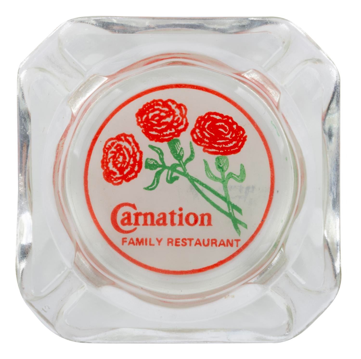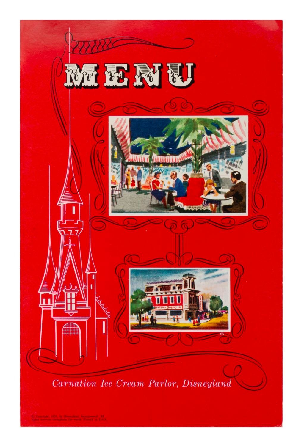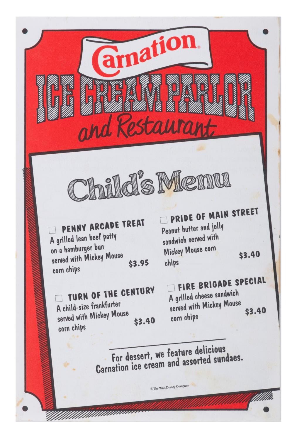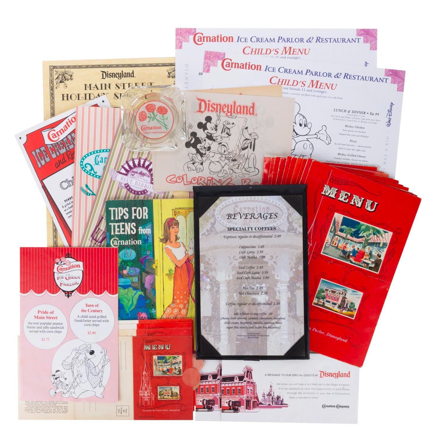 An impressive collection of Disneyland Carnation menus and souvenirs spanning over 50 years. Included is the "Tips For Teens from Carnation" booklet, twelve large menus (representing 10 editions), six small complimentary menu mailers, placemat menus, a 1990s A-frame tabletop menu, two complimentary ticket envelopes, coloring books, a rare 1980s Carnation Family Restaurant ashtray, and more from the Ice Cream Parlor and the Blue Ribbon Bakery. Measuring various sizes, these 35 Carnation restaurant souvenirs are in good-to-fine condition, with wear to some pieces and horizontal folds to four menus. Measuring 3.5"x3.5"x.75", the ashtray is in good condition with some fading and faint yellowing to the glass.