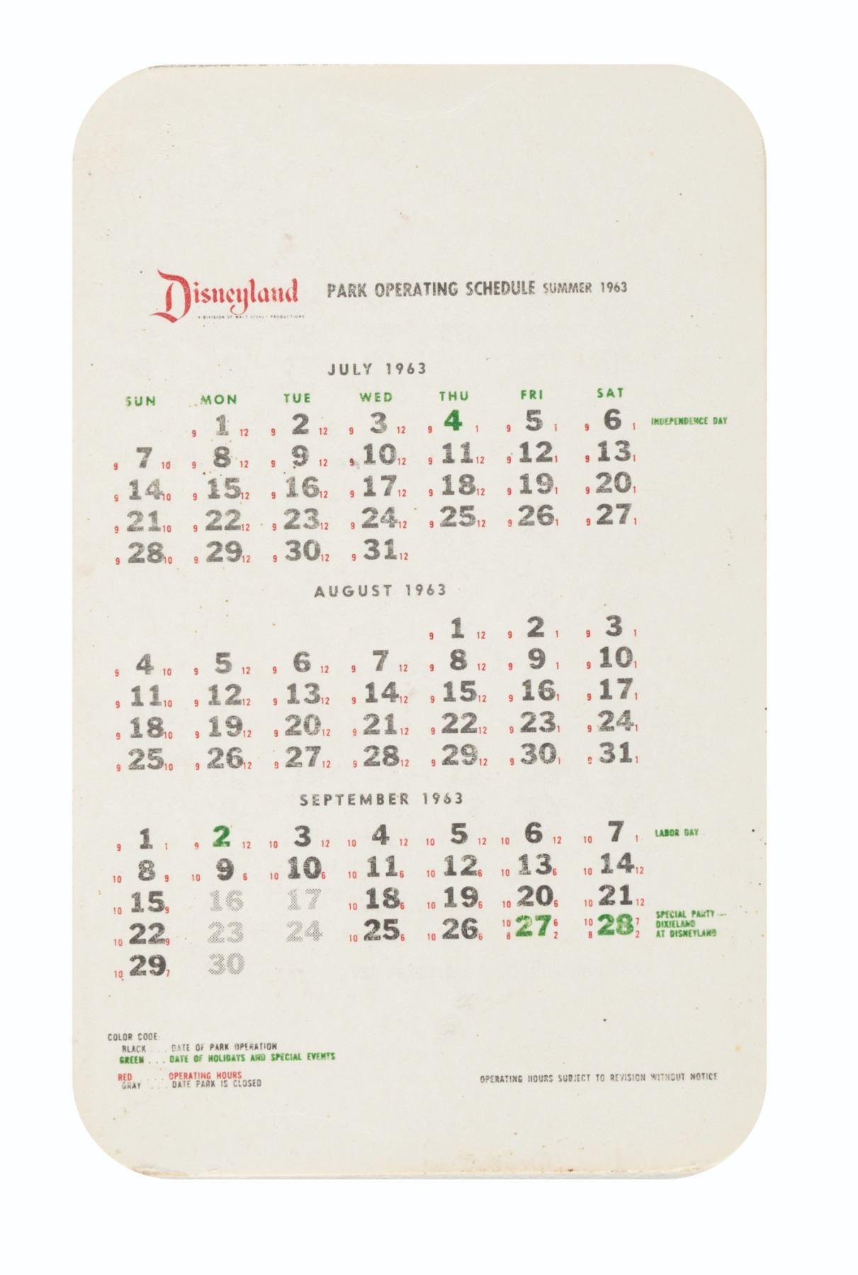 (Disneyland, 1963) A Disneyland Park Operating Schedule Card for the Summer of 1963. Measuring 2.5" x 4", the card is in very good condition with yellowing and minor wear.