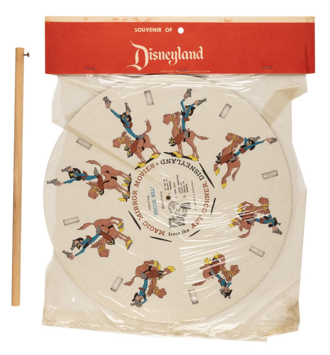 (Disneyland, 1950s) A rare souvenir of Disneyland Magic Mirror Movies toy from the Art Corner with its original bag. When looking through the spinner while standing in front of a mirror, the image of Pecos Bill will appear to move when spun. Measuring 10.75” in diameter, the toy is in very good condition with light indents, scuffs, and wear, while the opened bag exhibits wear and tear.