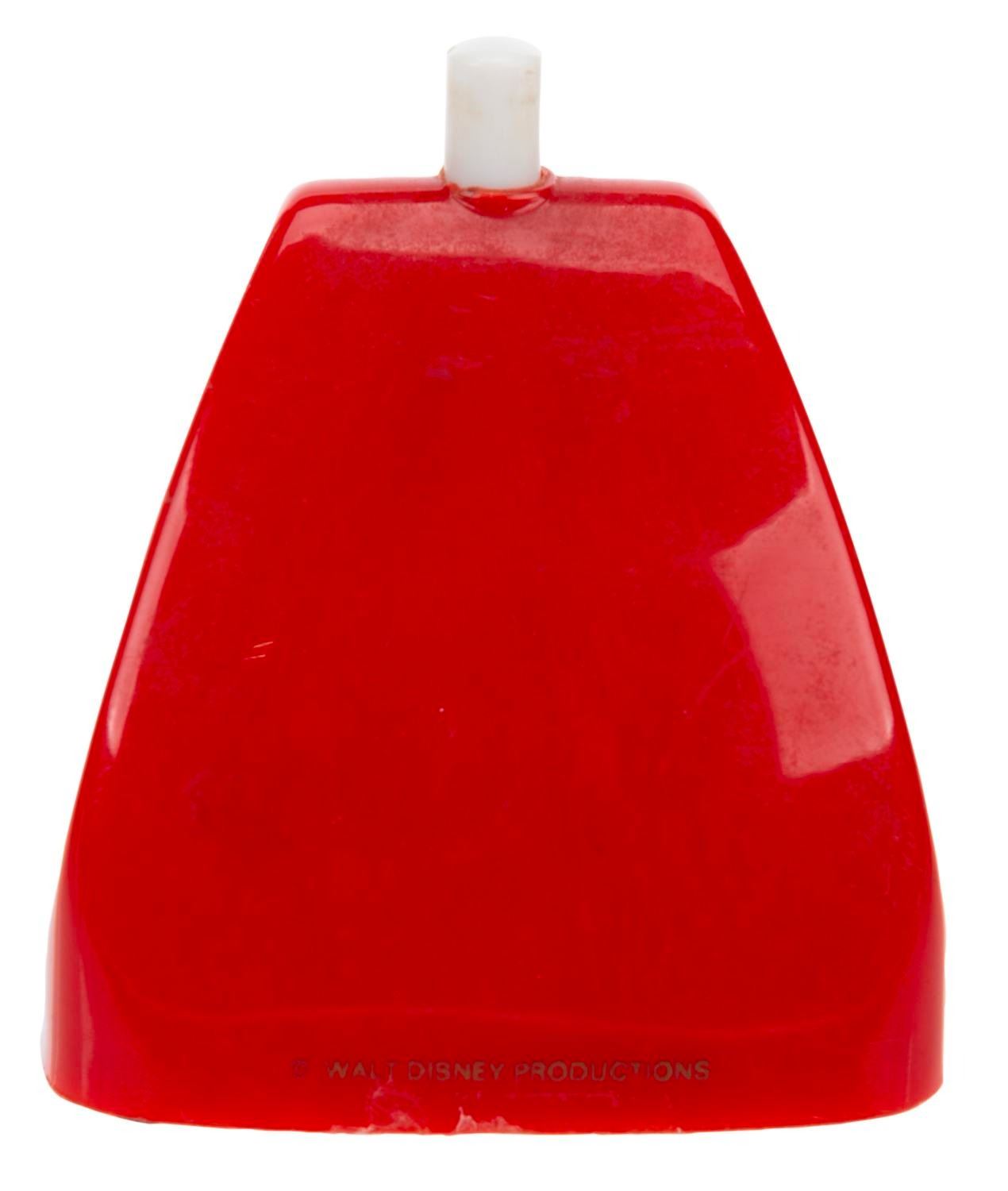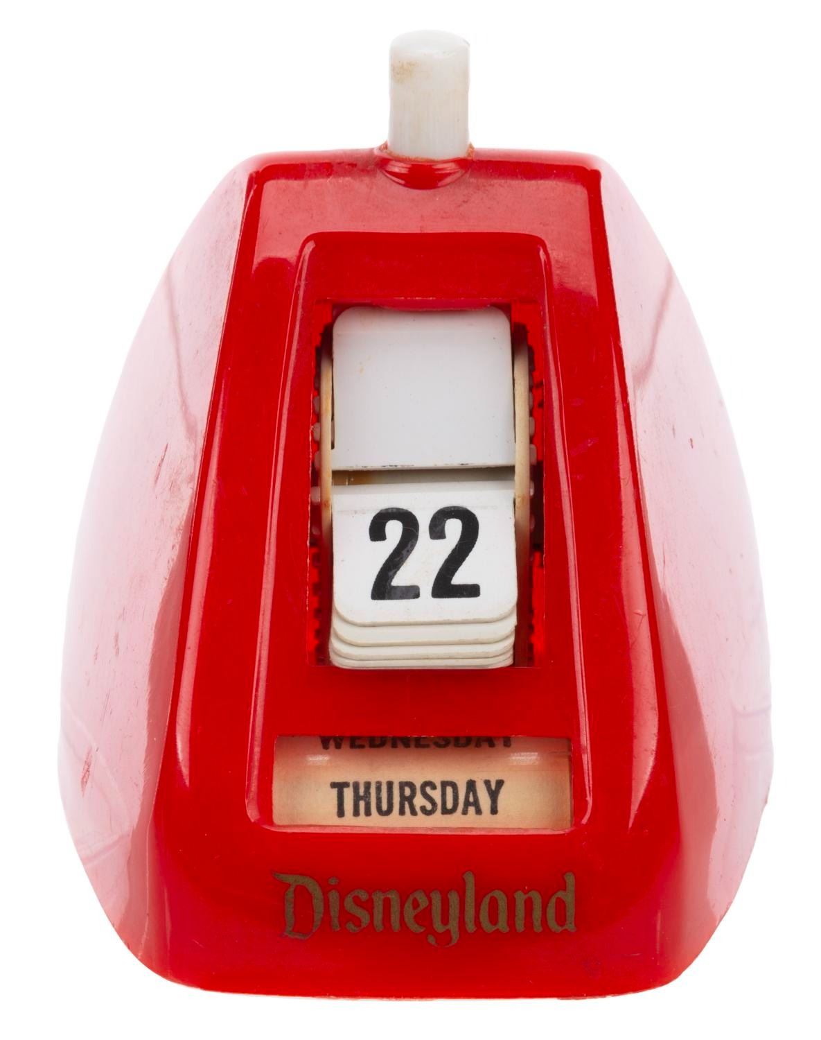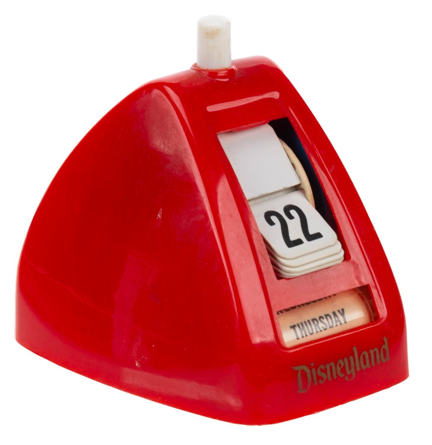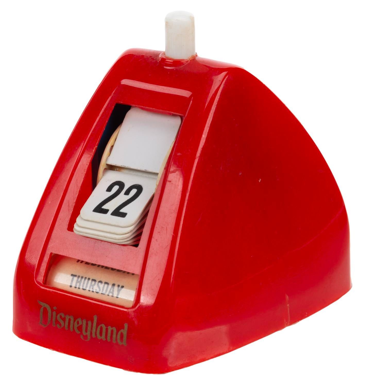 (Disneyland, 1960s) A red plastic Click-a-Day perpetual calendar from Disneyland. Measuring 2.75" tall, the calendar is in good condition with light discoloration, soiling and wear from usage.