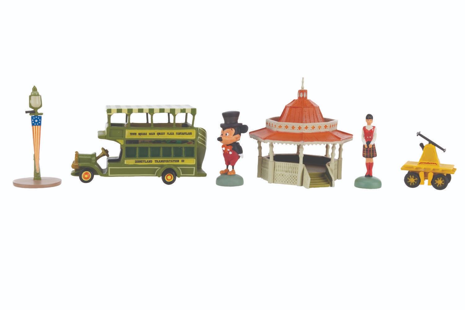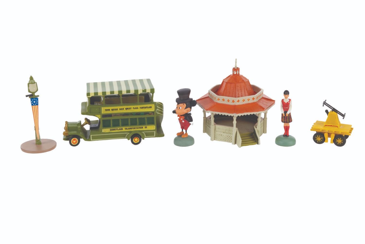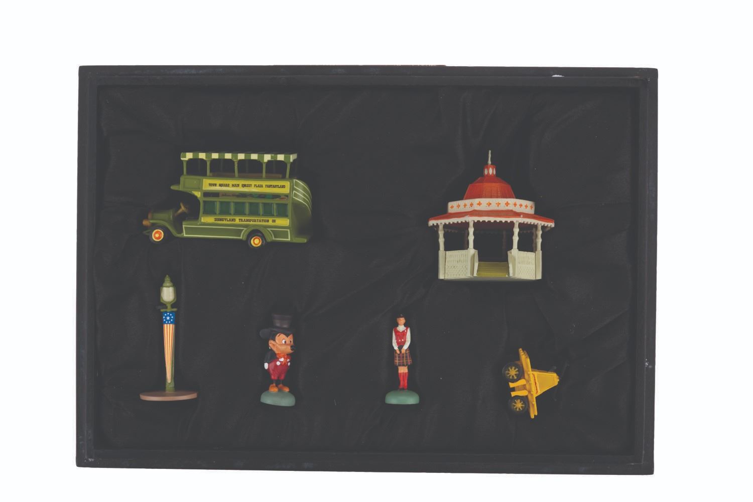 (Disneyland, 2005) A limited edition boxed set of Main Street pewter miniatures of the Omnibus, Bandstand, Lamppost, classic Mickey Mouse, a tour guide, and the railroad handcar. Created by Kevin Kidney and Jody Daily to commemorate Disneyland’s 50th Anniversary, the set was limited to 1500 pieces. The pieces standing 1.25 " to 2.25 " tall are in fine condition with a pinpoint of paint loss to the Bandstand that appears original to production, and small scuffs and scratches to the lid of the presentation box.