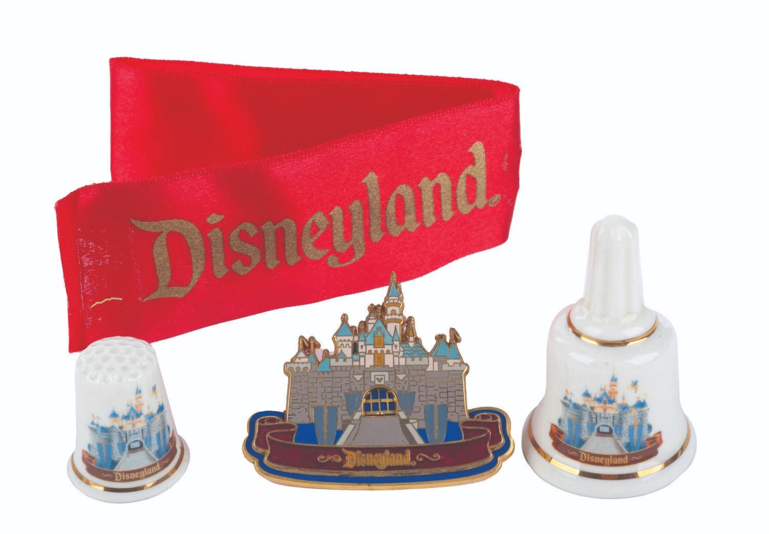 (Disneyland, 1990s-2000) A collection of four Disneyland souvenirs, including a ceramic bell, a matching thimble, a Sleeping Beauty Castle pin with a movable gate, and a satin ribbon. Each piece is in fine condition with some wear and fraying to the ribbon.