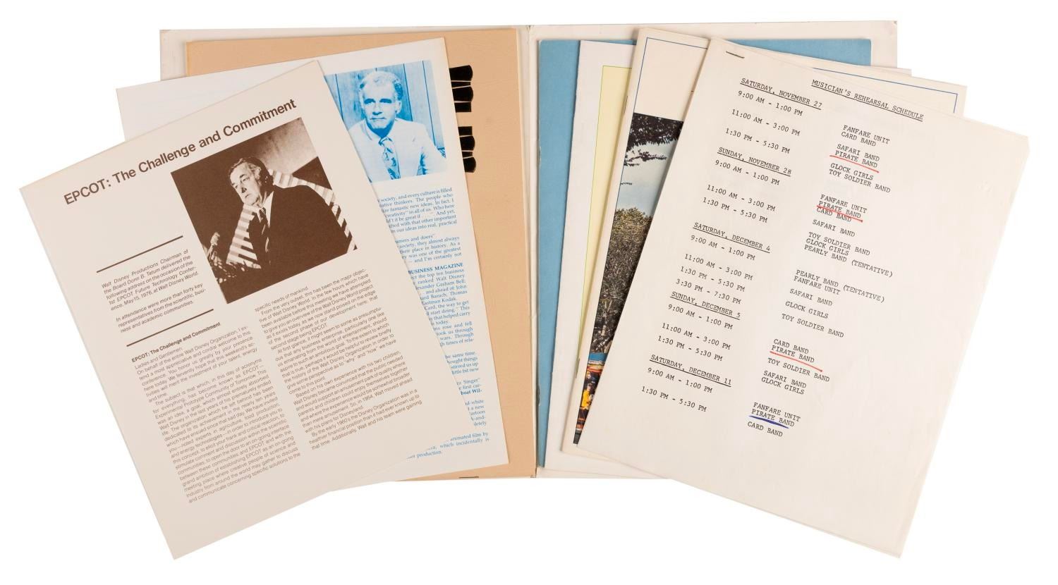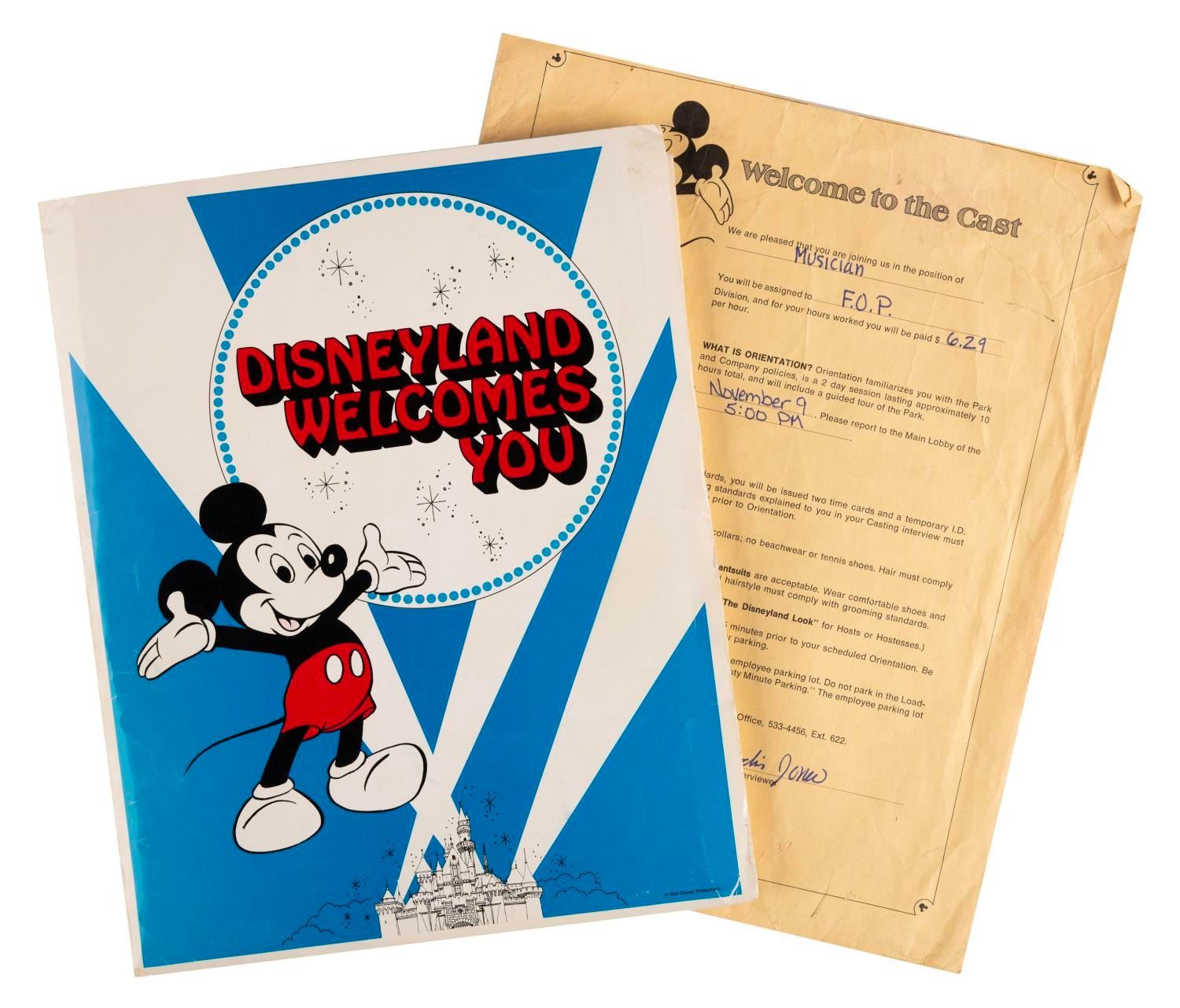 (Disneyland, 1978) A rare New Orleans Square Pirate Band new hire packet. The packet contains a "Your Role in the Disneyland Show" booklet, a "Disneyland and You" booklet, a "Working our Way" employee policy manual, a "The Disney Look" booklet, a payroll bulletin, a Wardrobe Department bulletin, a musician's rehearsal schedule and an “EPCOT: The Challenge and Commitment” booklet. Housed in a 10” x 12.25” envelope, the documents are in very good to good condition with light handling wear and a 1" tear along the bottom of the spine.