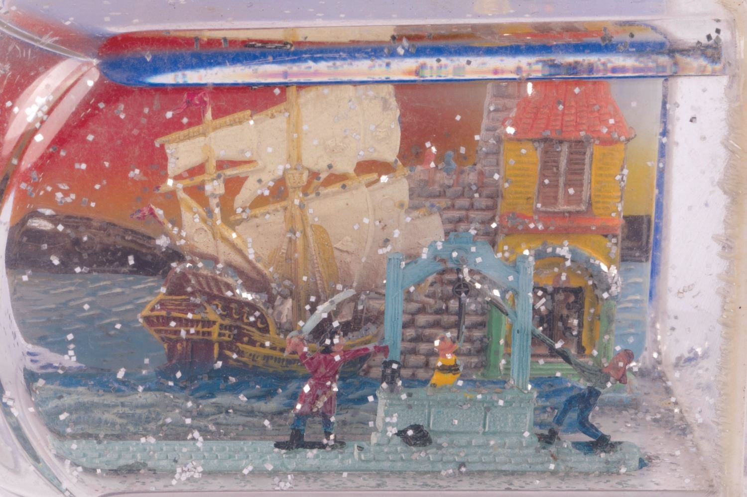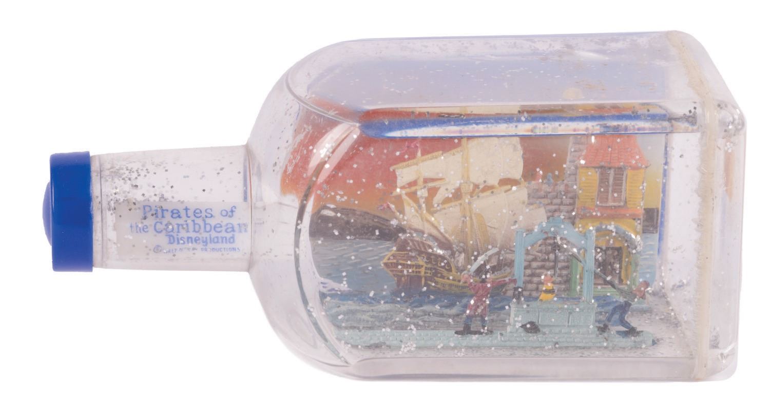 (Disneyland, 1967-70s) A vintage "ship in a bottle" style souvenir snow globe from Disneyland. The souvenir contains a miniature of the "Dunking the Mayor" scene from the Pirates of the Caribbean and the neck of the bottle features a plastic label that reads "Pirates of the Caribbean Disneyland." The water has been removed from the snow globe for preservation. Measuring 5" long and 2.25"x2.25", the piece is in very good condition, with slight haziness to plastic, and few scuffs from handling and age.