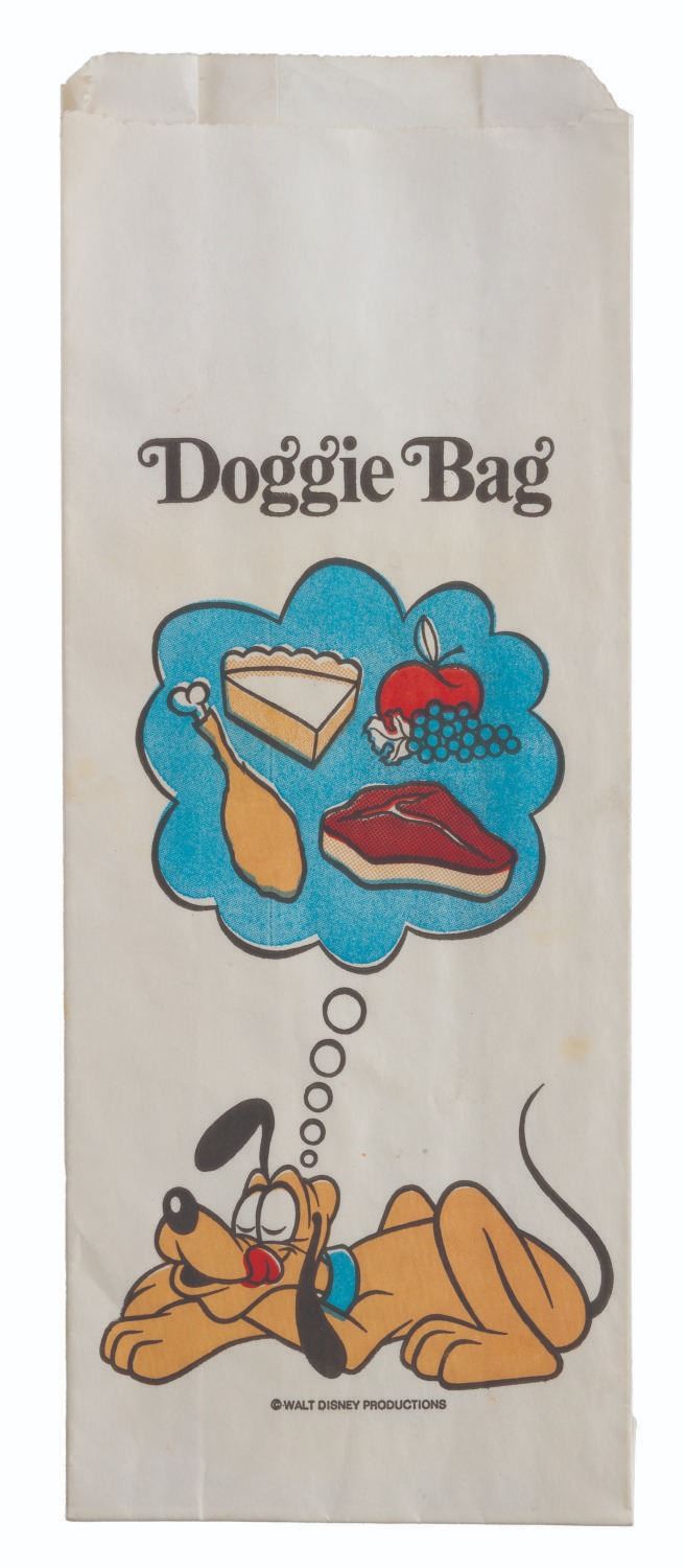 (Disneyland, 1980s) A Disneyland"Doggie Bag” featuring Pluto, given to Guests to hold leftovers. Measuring 5” x 12”, the paper bag is in very good unused condition with slight discoloration from age.