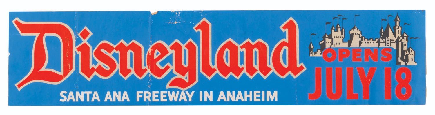 (Disneyland, 1955) An extremely rare bumper sticker promoting Disneyland's Grand Opening to the public on July 18, 1955. Measuring 4" x 17.5", the sticker is in good condition with material loss, scuffs, creases, folds, and edge wear.