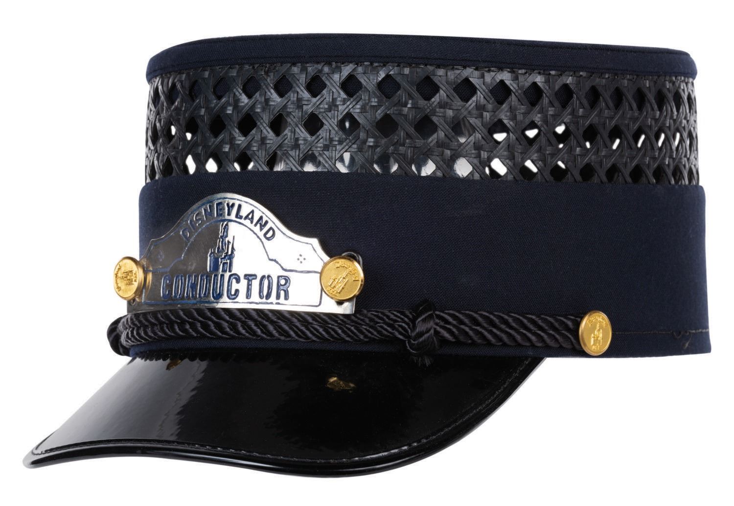(Disneyland, 1980s) A "Disney Double Decker" Hat & Conductor Hat Badge from the Disneyland Railroad. The navy-blue hat features a synthetic wicker and cloth textile crown, a black patent leather squared duck bill, a rare Disneyland Conductor silver metal hat badge with blue enamel fill, gold tone Sleeping Beauty Castle fastener caps, and a black braided rope band. The interior of the crown retains its Midway Cap Company label with "7 1/8" size tag, and annotation reading "Main." The piece is in fine condition with a few loose threads and light wear from handling and use.