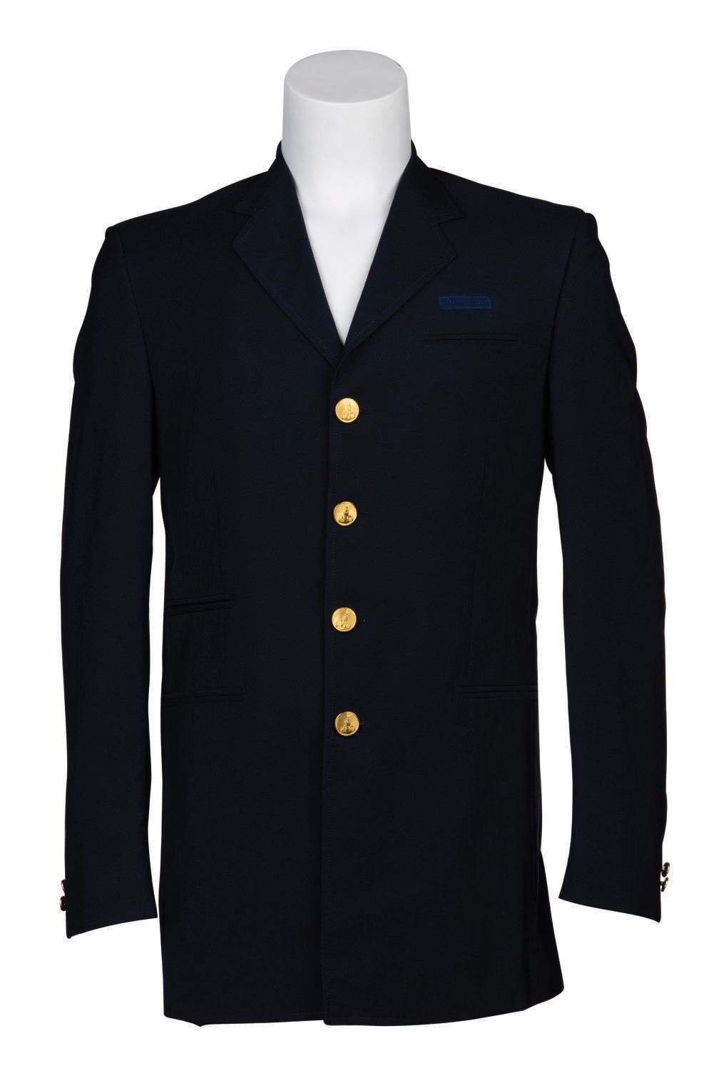 (Disneyland, 1990s) A jacket worn by Hosts and Hostesses of the Disneyland Railroad Main Street Station. Measuring a size 38L, the four-button jacket is accented with Sleeping Beauty Castle buttons and in overall fine condition, exhibiting light wear.