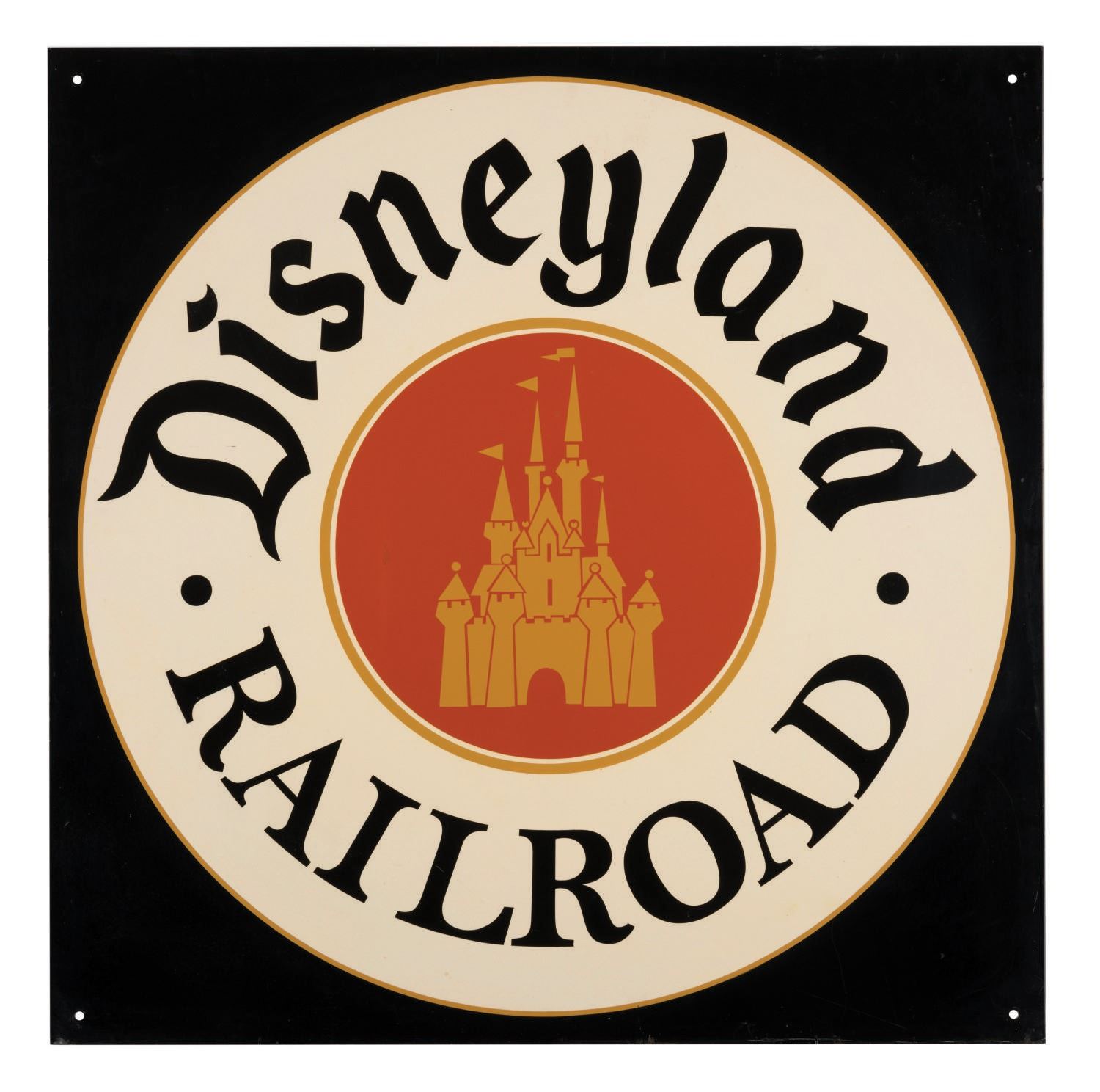 (Disneyland, 2000s) A large metal sign for the Disneyland Railroad at Disneyland. The iconic sign features Sleeping Beauty Castle with the words: "Disneyland Railroad." This style of sign was created in various sizes, for intended display on Station Buildings and the sides of train cars of the Disneyland Railroad. Measuring 32"x32", this large sign was used on a station building and has four screw holes near the corners for mounting. The piece is in fine condition, despite a few slight scuffs from Park display.