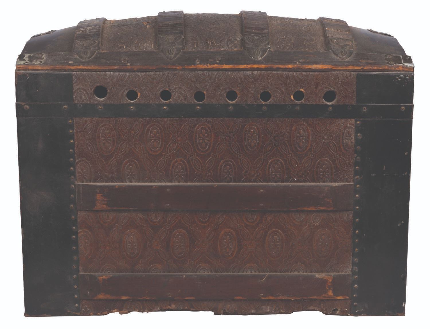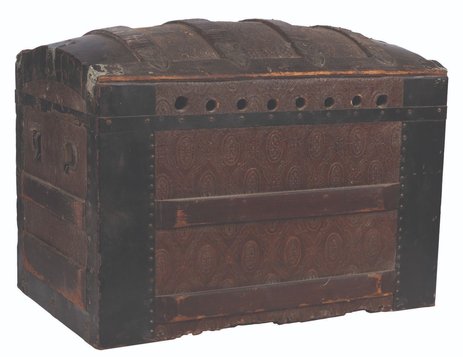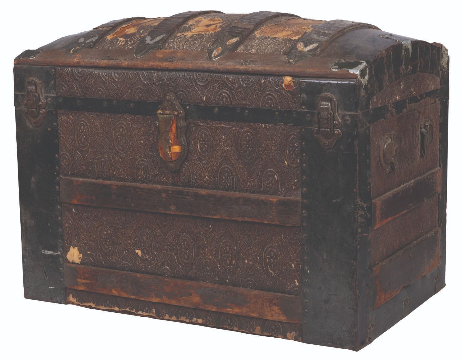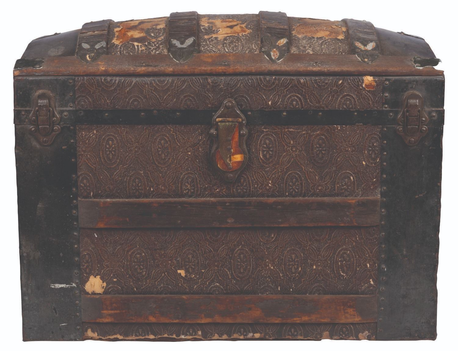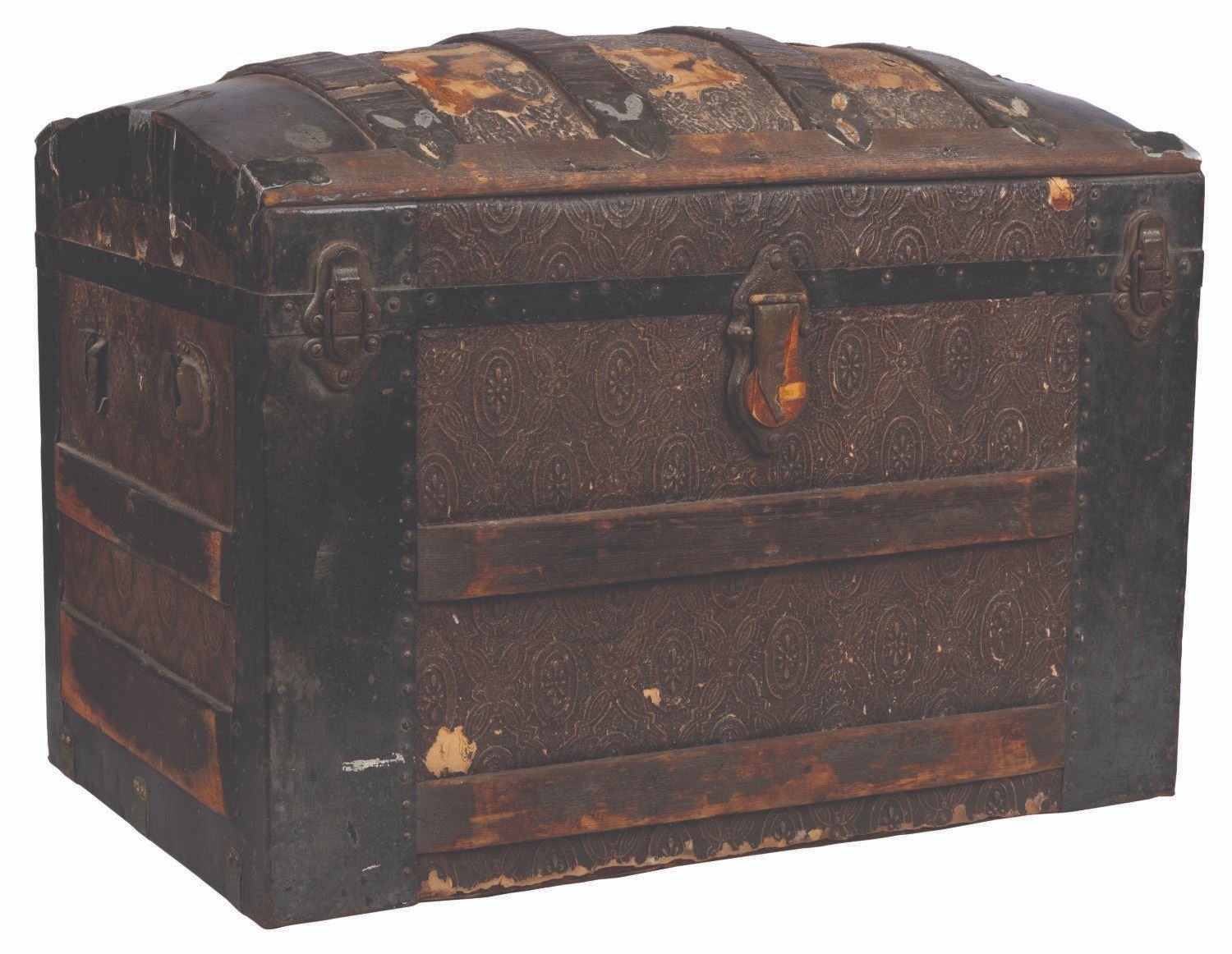 (Disneyland, 1974-1990s) The trunk cover used on the Disneyland Railroad’s Lilly Belle Presidential Car. This bottomless steamer trunk was added during renovations in 1974 to cover the batteries on the back of the car, with intentional holes in the trunk to allow heat to escape. Measuring 15.25” x 21.5” x 13.5” deep, the wooden trunk cover is in fair condition with chipping, weathering, stains, burn marks inside from battery exposure, a broken faux lock, and heavy wear from Park use.