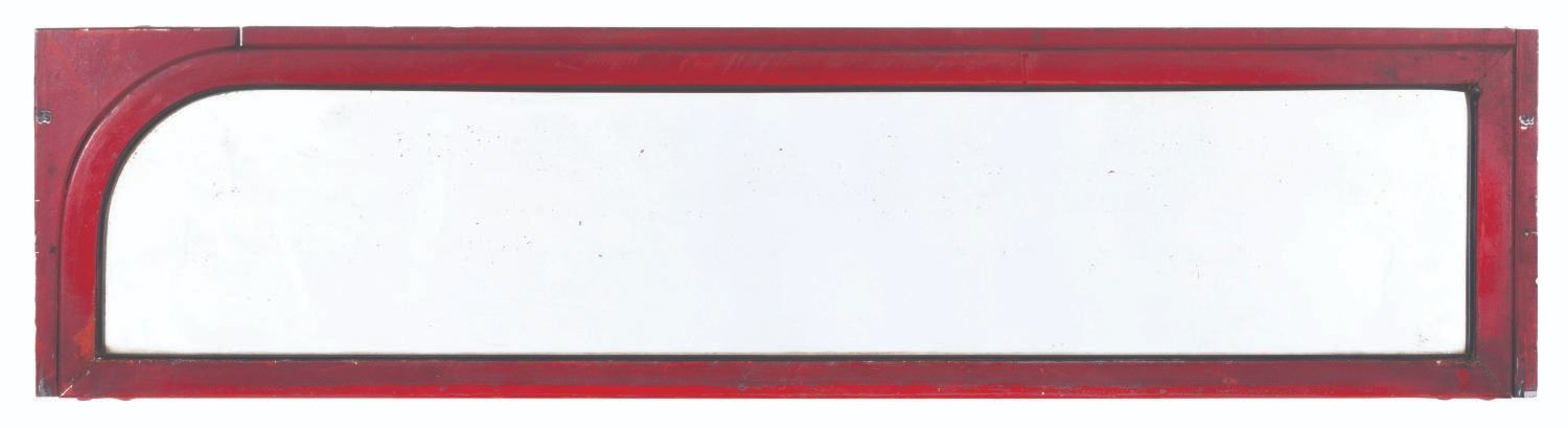 (Disneyland, 1955-2006) A window panel from the Lilly Belle car, removed during a rehabilitation in 2006. The former Grand Canyon car had a different layout to the windows than the regular passenger cars, with six sets of large double windows instead of 12 small windows. This narrow panel was the top of one of the large windows with the straight edge facing its match and curved edge towards the next pair. This window was a part of Disneyland history from the very beginning, on board the train Walt drove into Main Street Station in the “Dateline Disneyland” television broadcast on July 17, 1955. Measuring 25.5” x 6.5” with a glass size of 23.25” x 4.5”, the window is in very good condition, with expected wear and soiling from its long service in the Park.