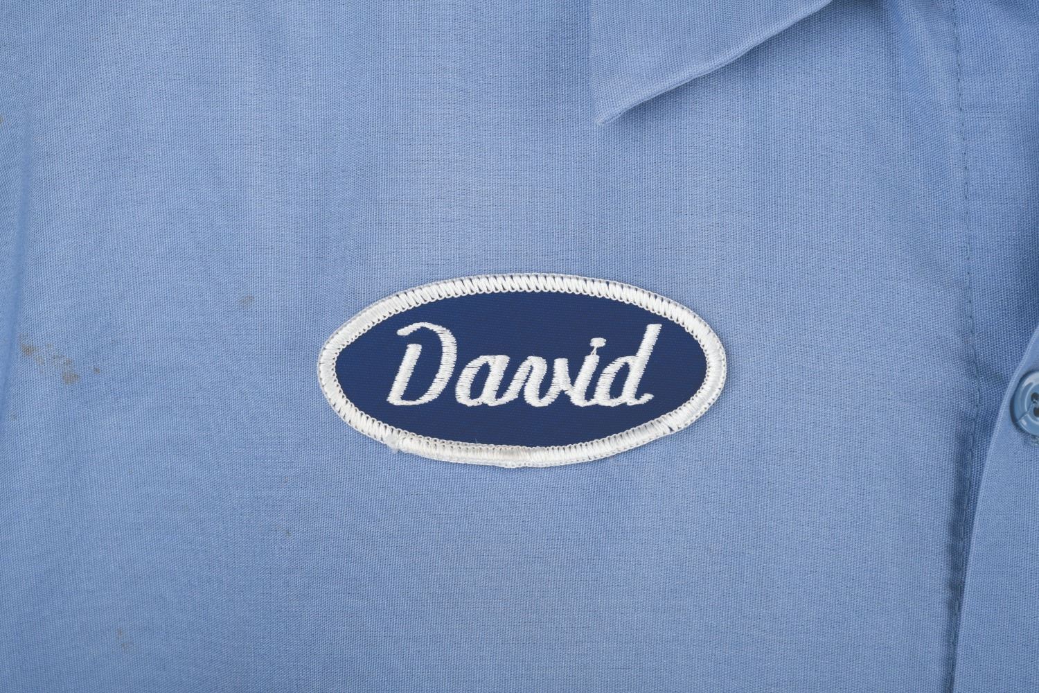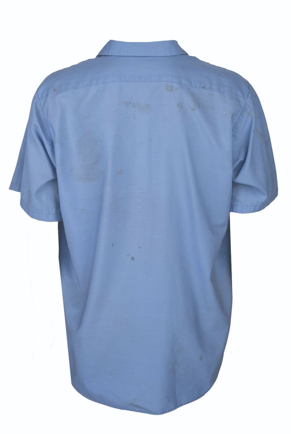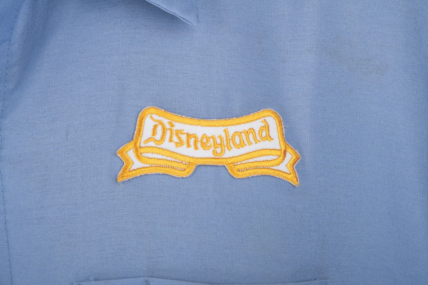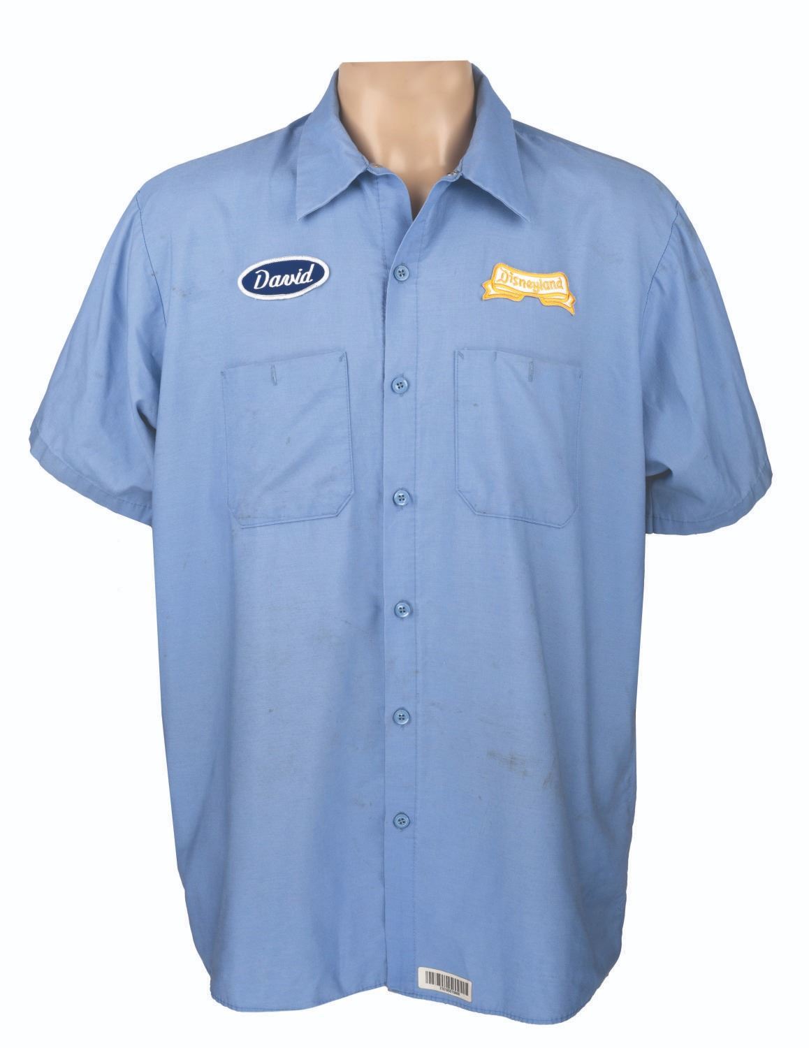 (Disneyland, 1960s-1980s) An original shirt worn by a Disneyland Maintenance Division Cast Member who worked in the Disneyland Railroad and Monorail Roundhouse. Measuring a size extra-large, this button-down shirt is in good condition with wear from Cast use, and retaining its original property control labels.