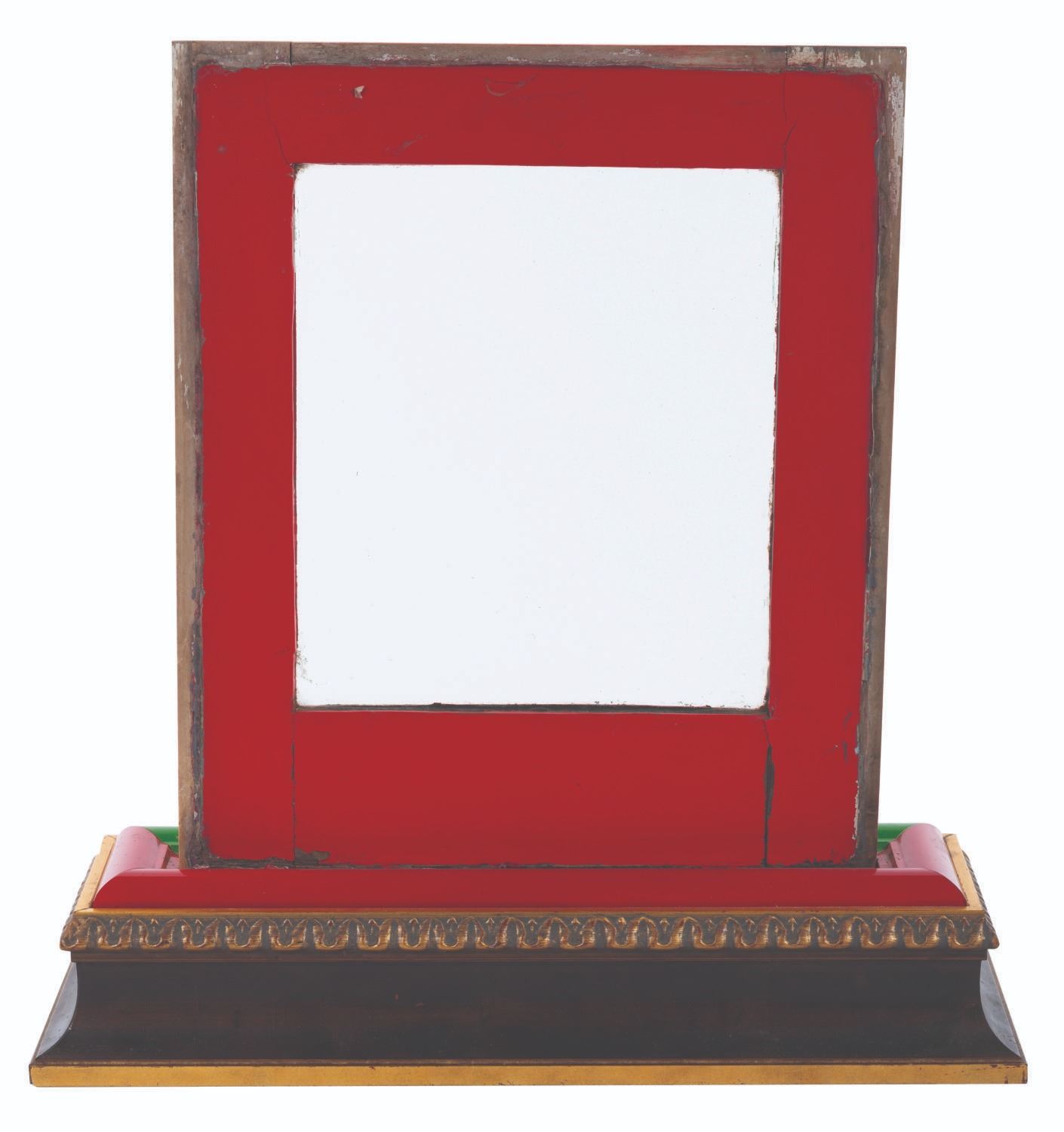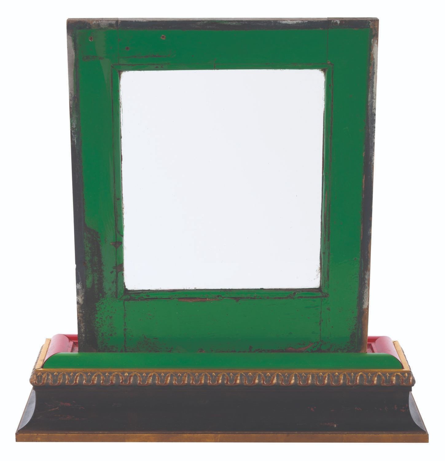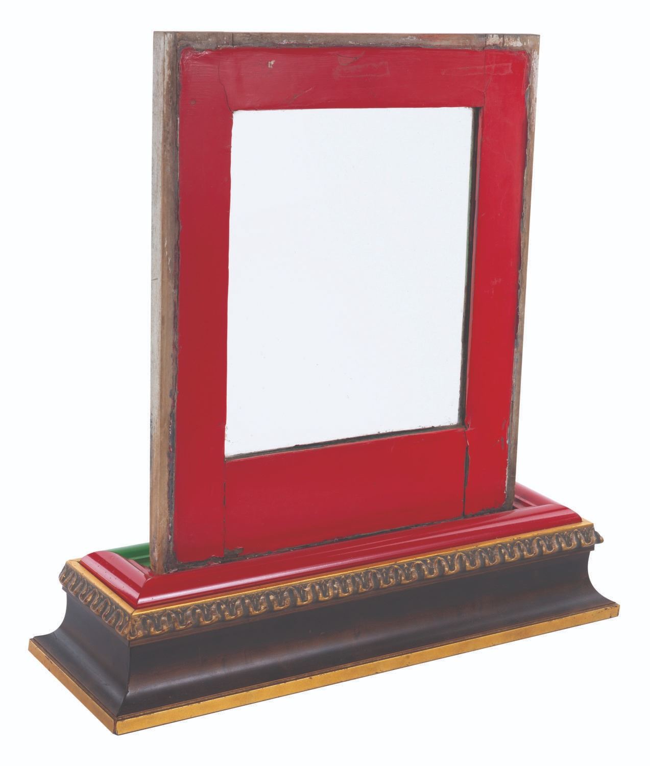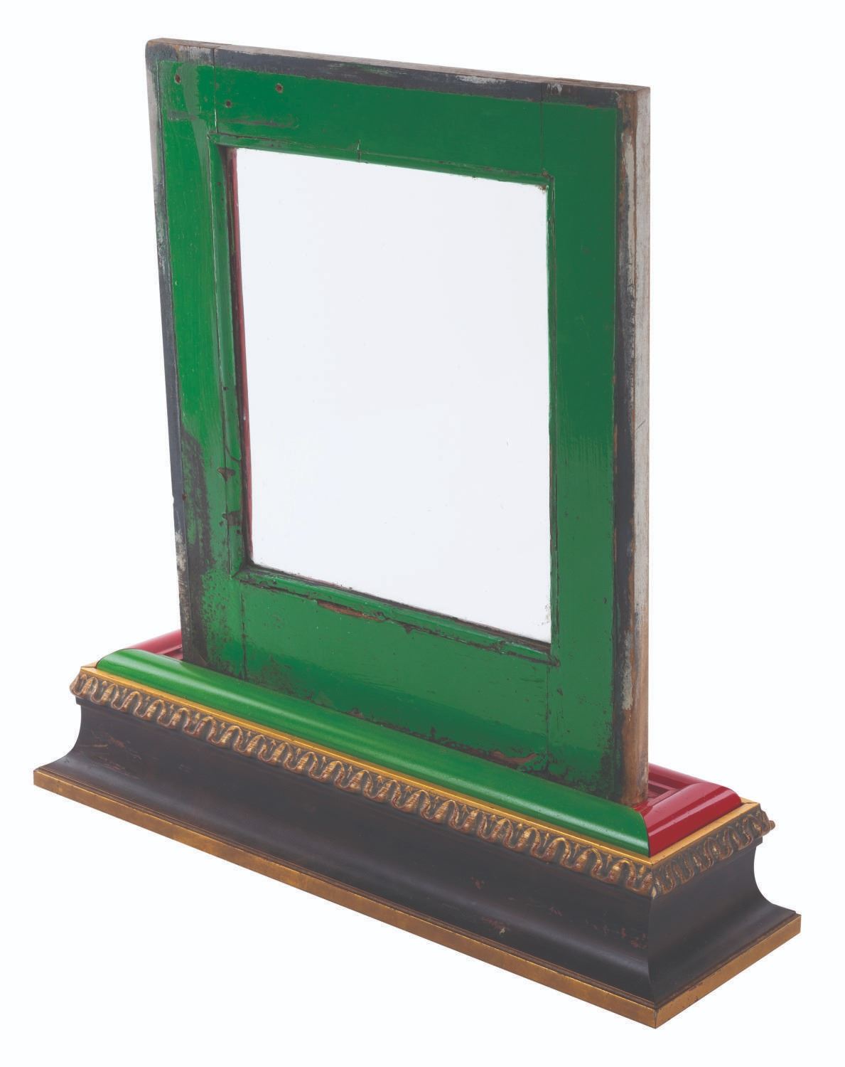 (Disneyland, 1980s-2000s) An original window from a Disneyland Railroad locomotive. The hand-painted window features the Guest-facing red color on one side and the green interior on the reverse. Measuring 15" x 0.75" x 18" and 21" x 6.75" x 21" tall, with its custom display, the window is in fair condition with heavy wear from Park use, including chipping, paint loss, stains, intentional holes, and discoloration from age.