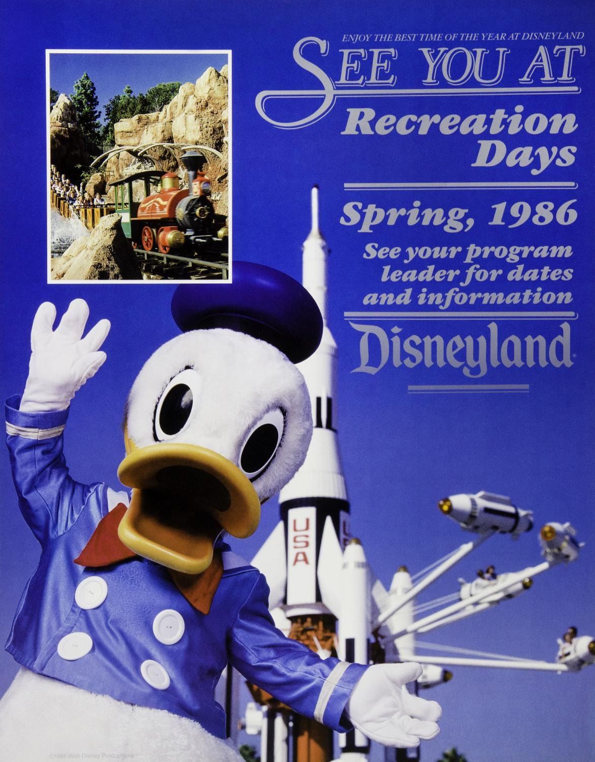 (Disneyland, 1986) A poster promoting Disneyland's Recreation Days events in Spring 1986 featuring Donald Duck with the Rocket Jets whirling behind him. Measuring 22" x 17", the poster is in very good condition with very light wear.