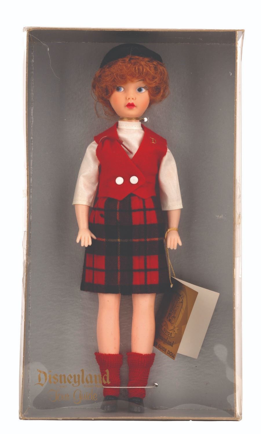 (Disneyland, 1960s) A souvenir tour guide doll in the original box and featuring the famous Park Tour Guide attire. Measuring 12" tall, the doll is in very good condition with a light tackiness to the plastic shoes and legs from age. The box measures 7" x 12.5" and is in fair condition with the plastic top having some tears and tape repairs.