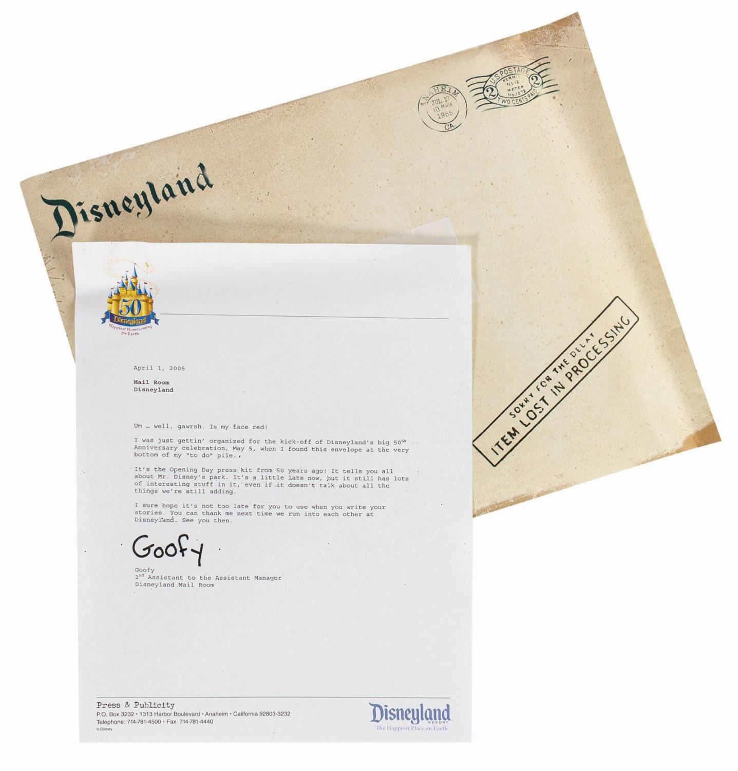 (Disneyland, 2005) A rare sealed reissue of the Disneyland Grand Opening press kit, created in honor of the Park's 50th anniversary. This packet includes a letter from Goofy, photos of Walt Disney and the developmental Park map, and 26 pages of information about entertainment and facilities in the Park's opening year. This kit is still sealed its original envelope, and accompanied by its introductory letter. Measuring 10"x13", the envelope and contents are in fine condition with minor edge wear.