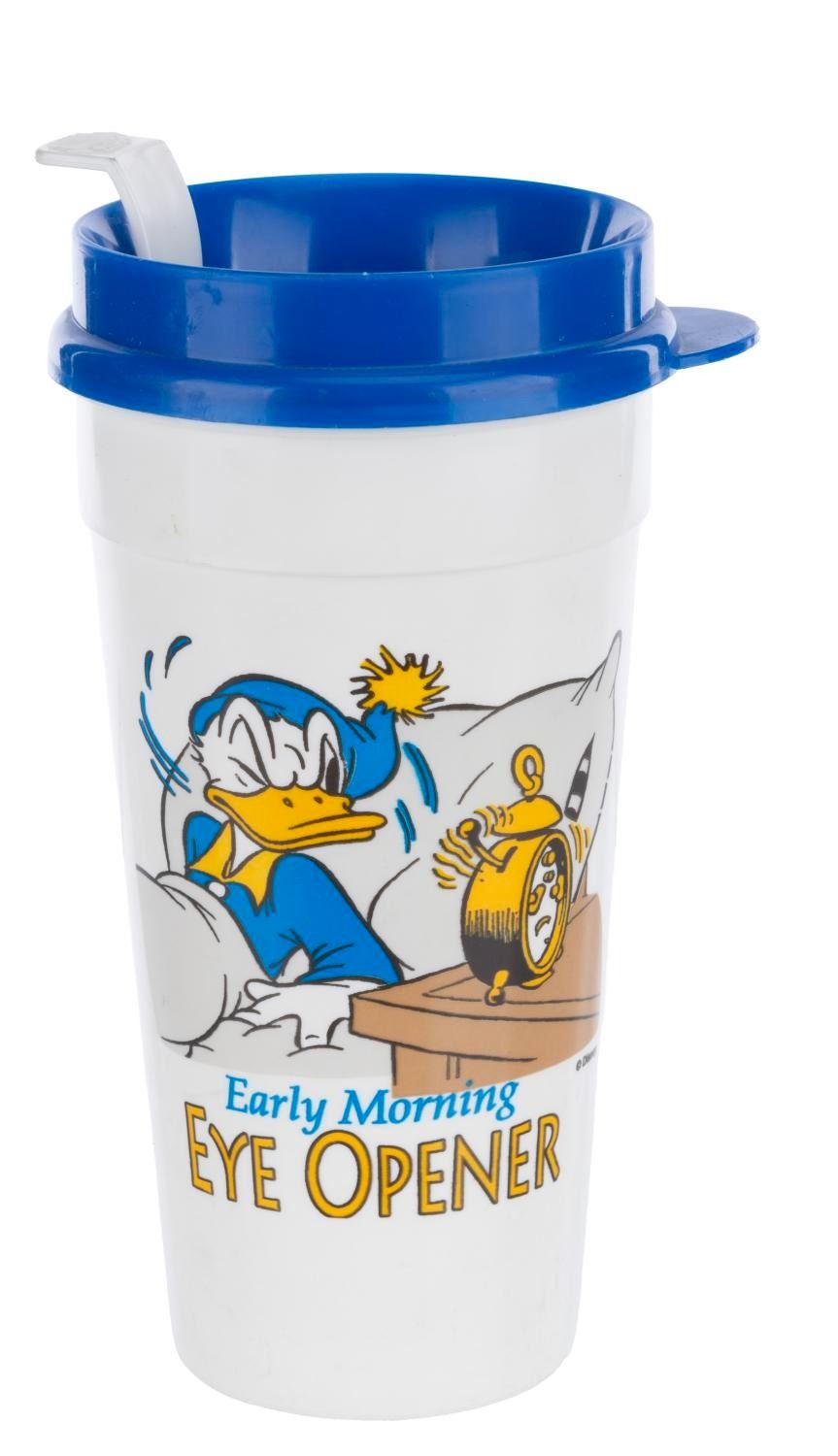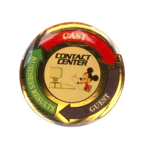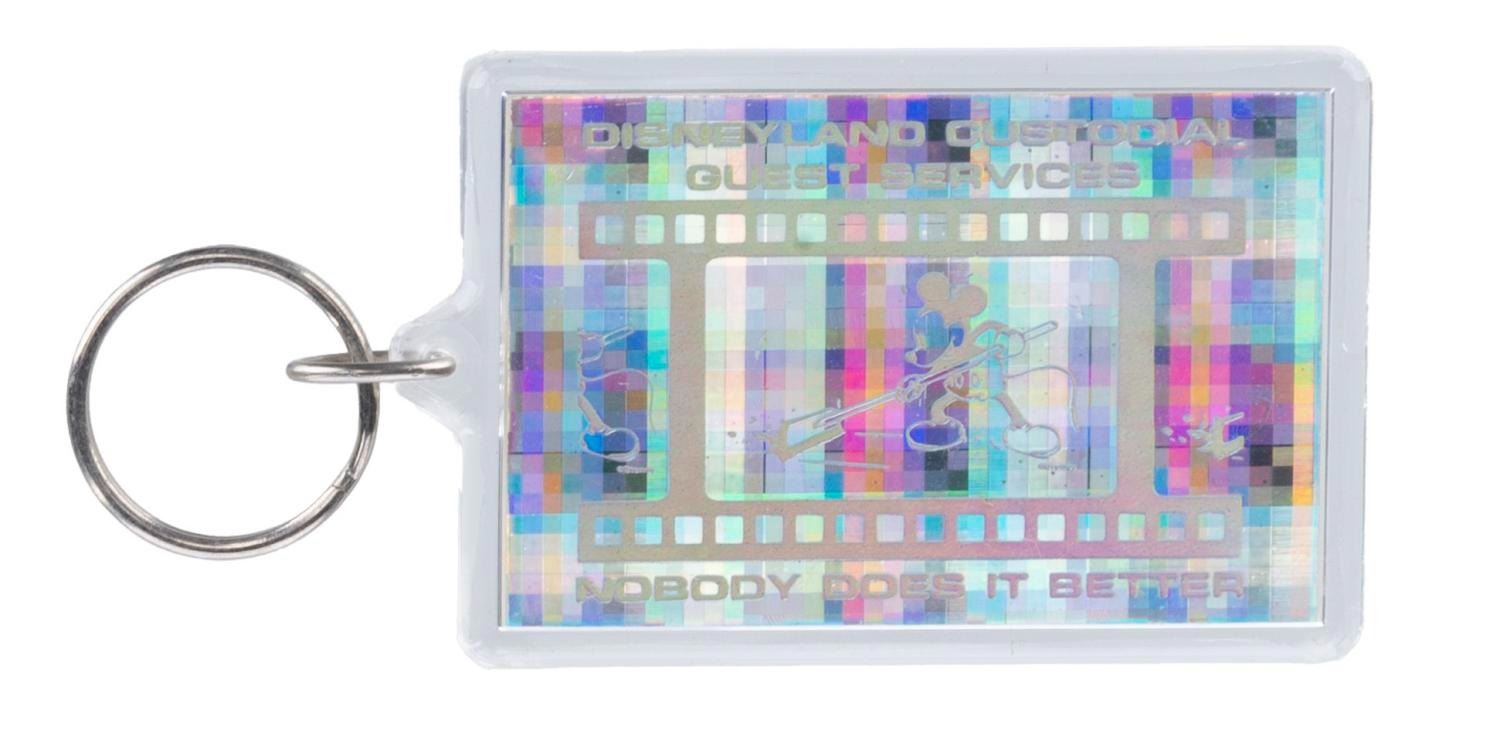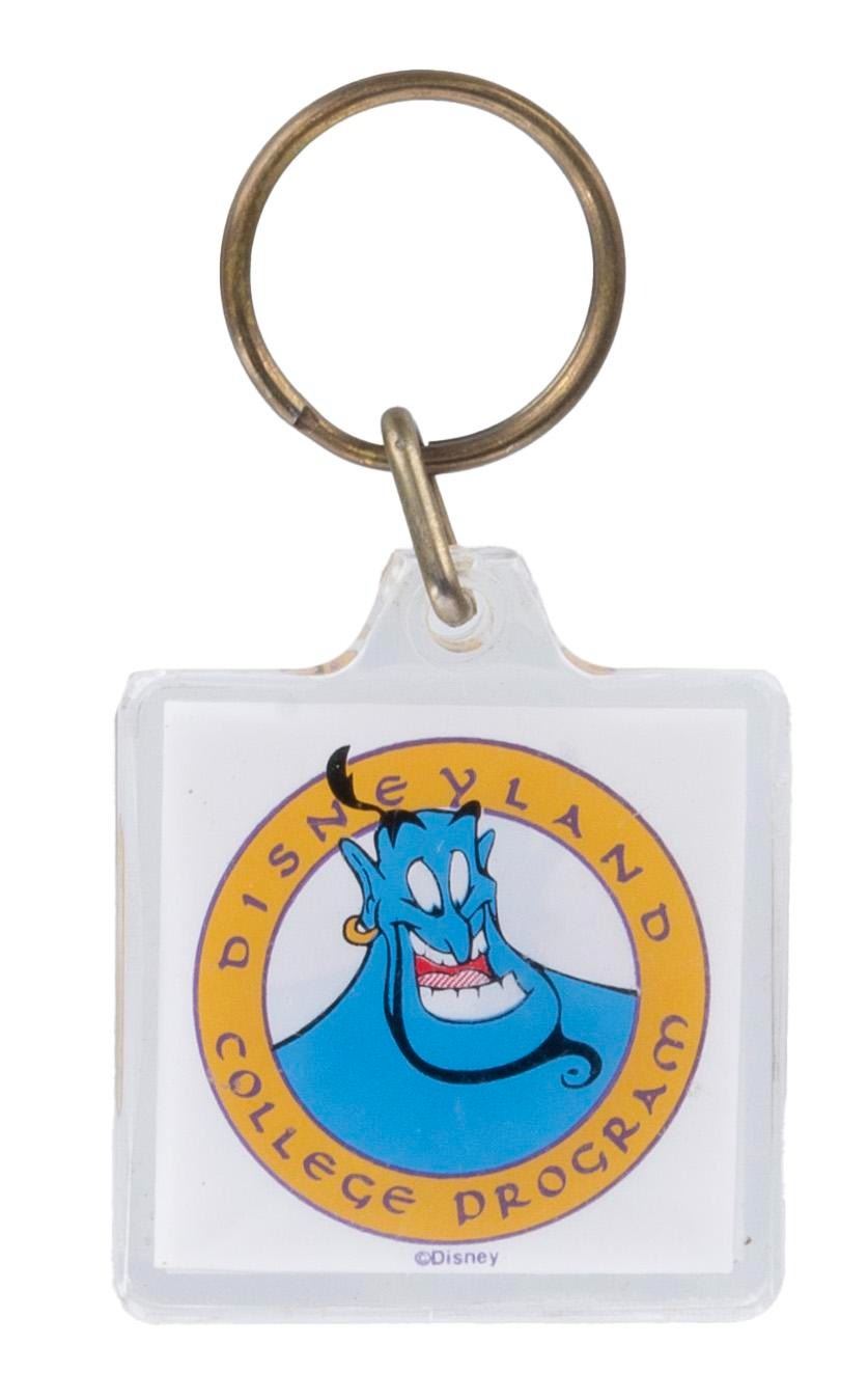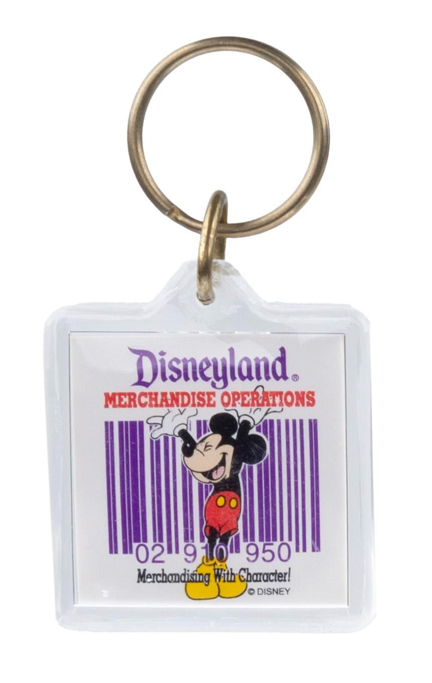 (Disneyland, 1990s) A Disneyland Resort Cast Member souvenir collection including five keyrings, one travel tumbler, and one pin. Measuring from 1" in diameter to 6.75" tall and 4" in diameter, each souvenir is in very good condition exhibiting fading, scuffs, and wear to some pieces.