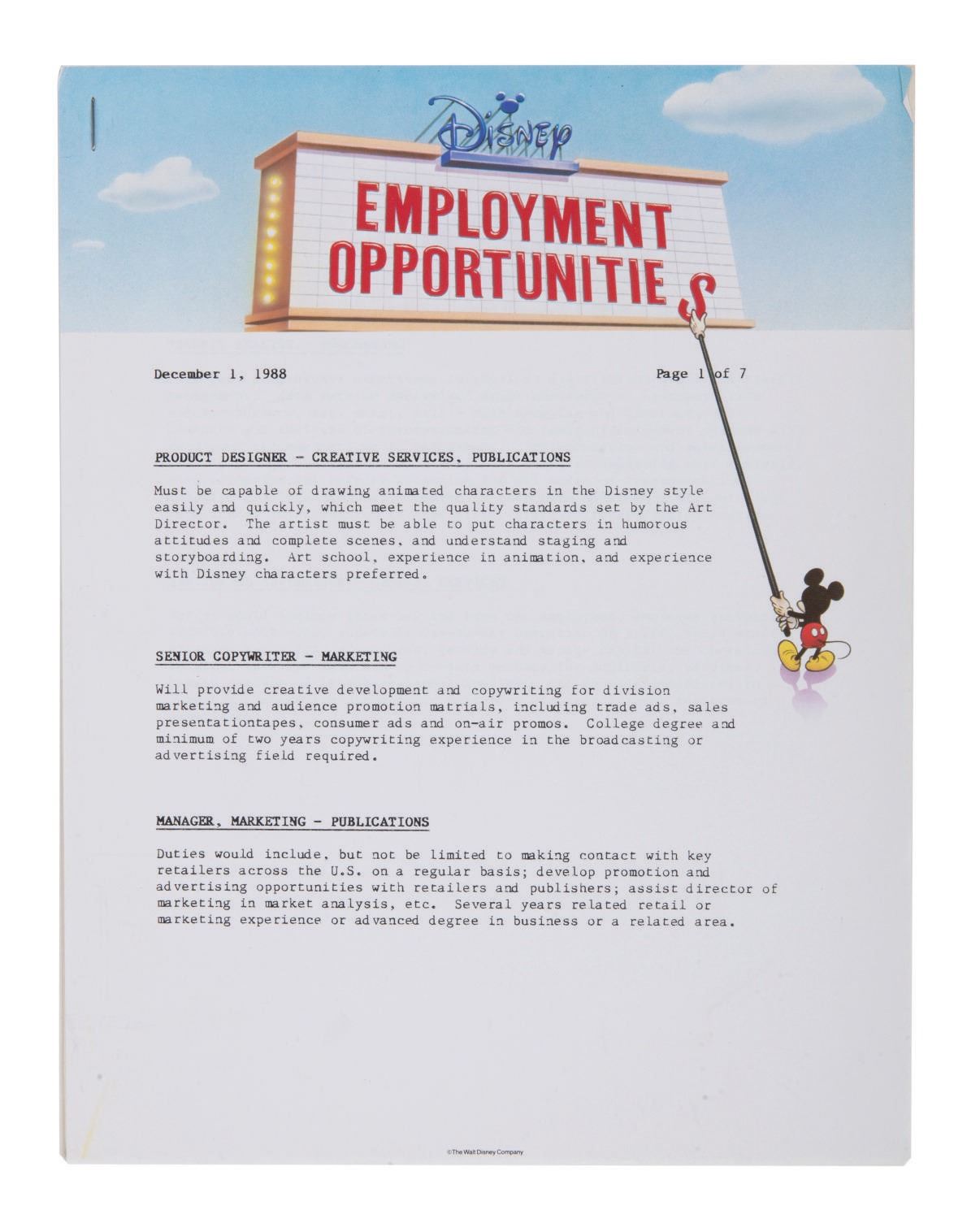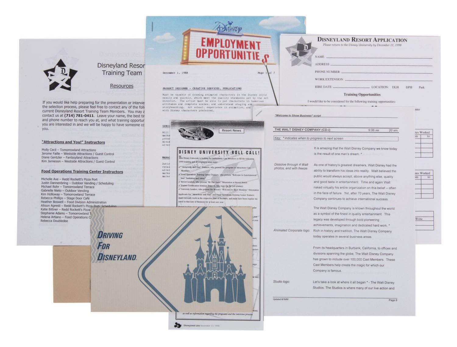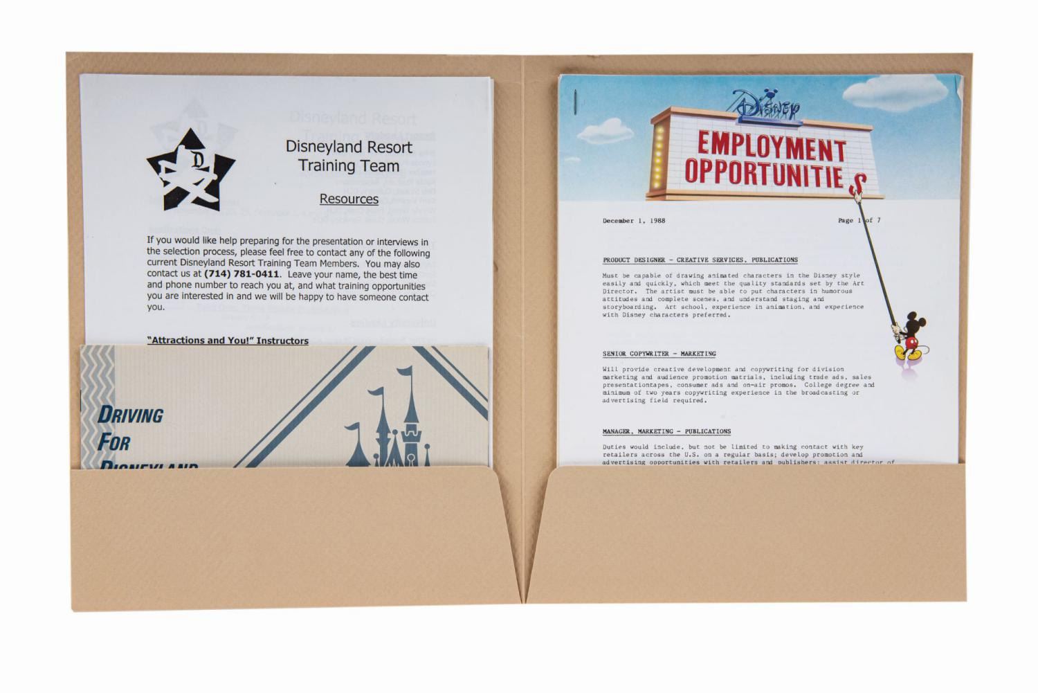 (Disneyland,1980s) An embossed Disney folder containing employment information prepared by Disney University for Disneyland Cast Members. The unique collection of Park employment ephemera includes a 7-page Disney Employment Opportunities pack dated "December 1, 1988," a Welcome to the Show Business orientation script, a "Driving for Disneyland" brochure, (3) pages pertaining to the Disneyland Resort Training Team, a Disney University Roll Call sheet, and a Disneyland Resort application. Contained in the 11.75"x9.5" folder, the documents are in very good condition with minor creases, folds, and surface wear.