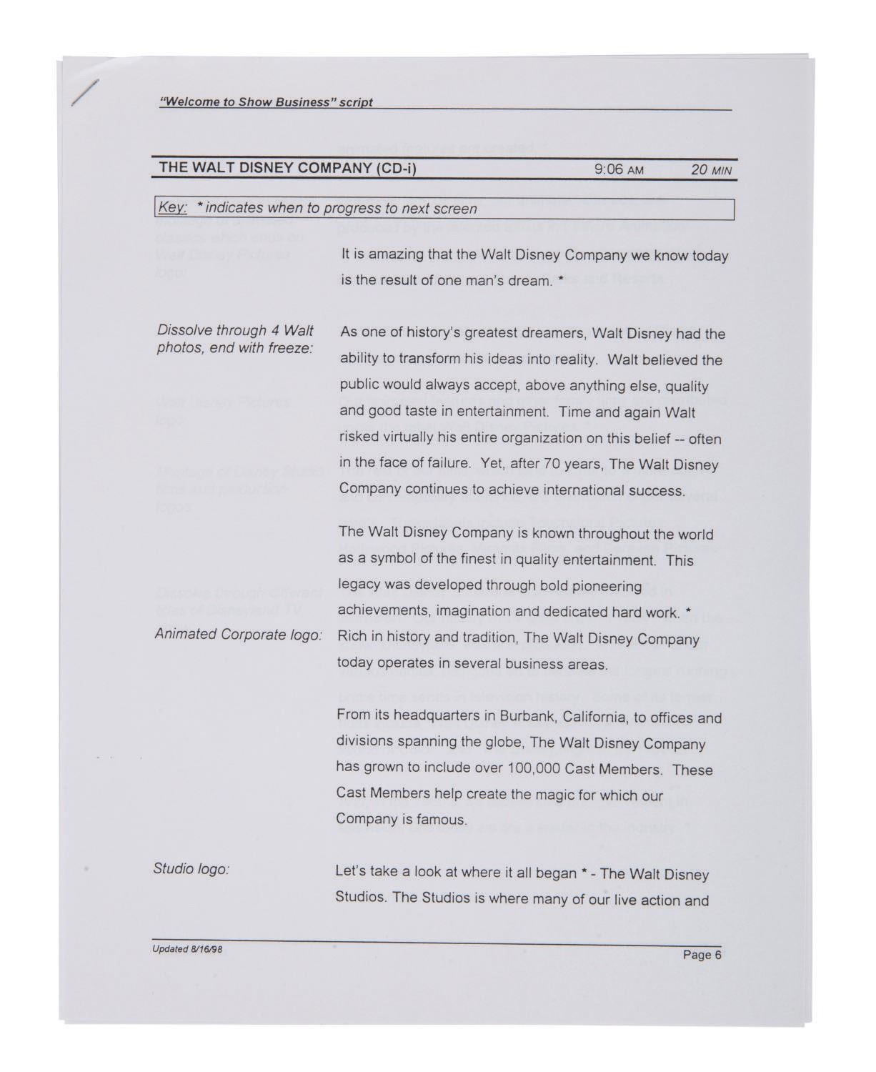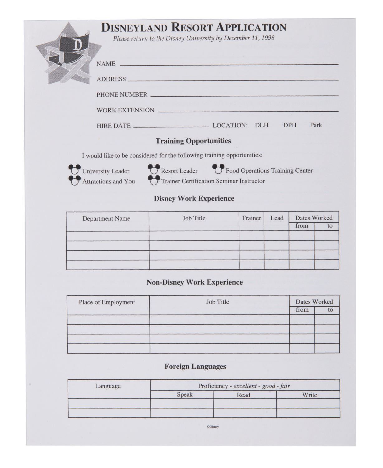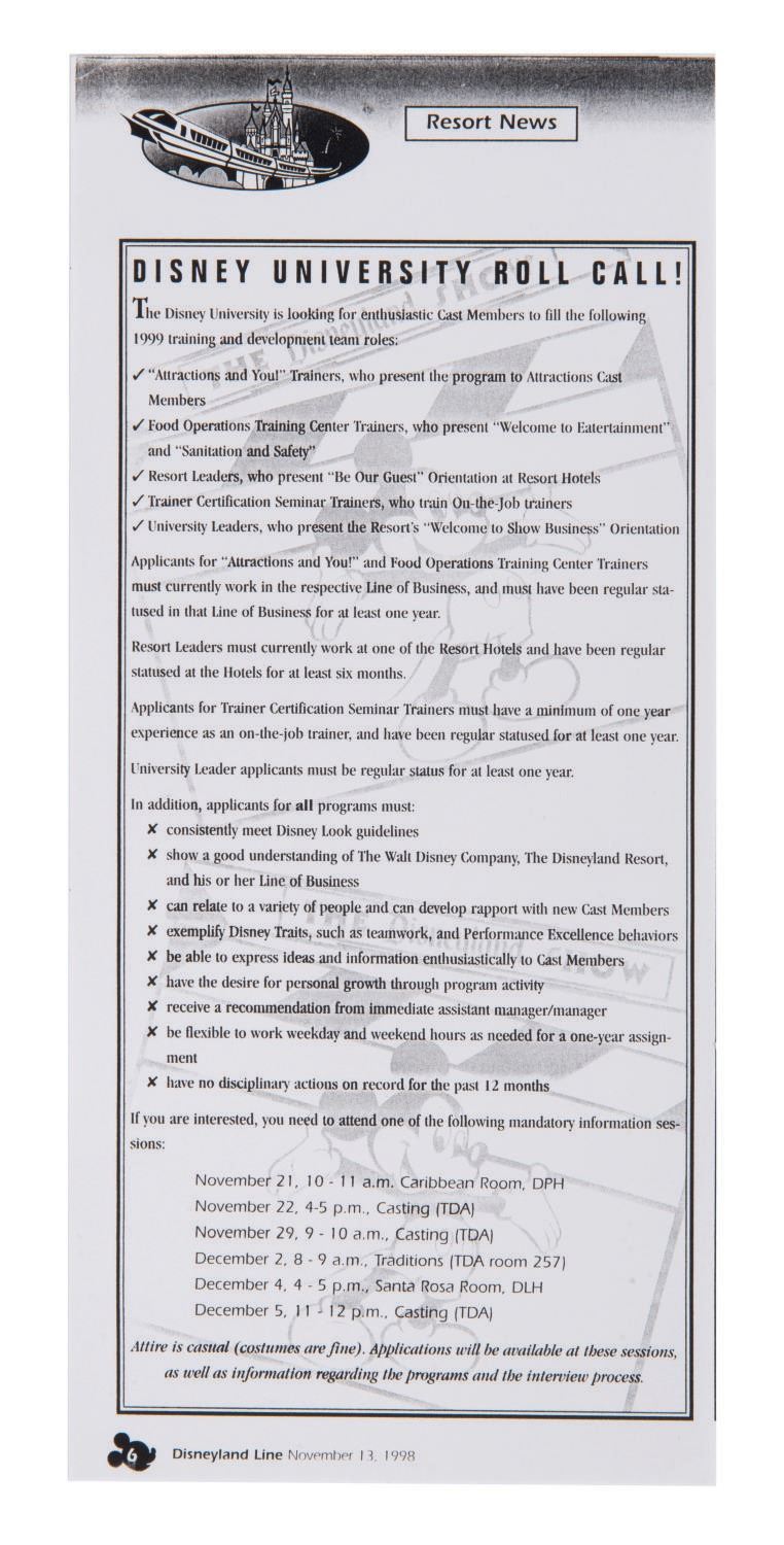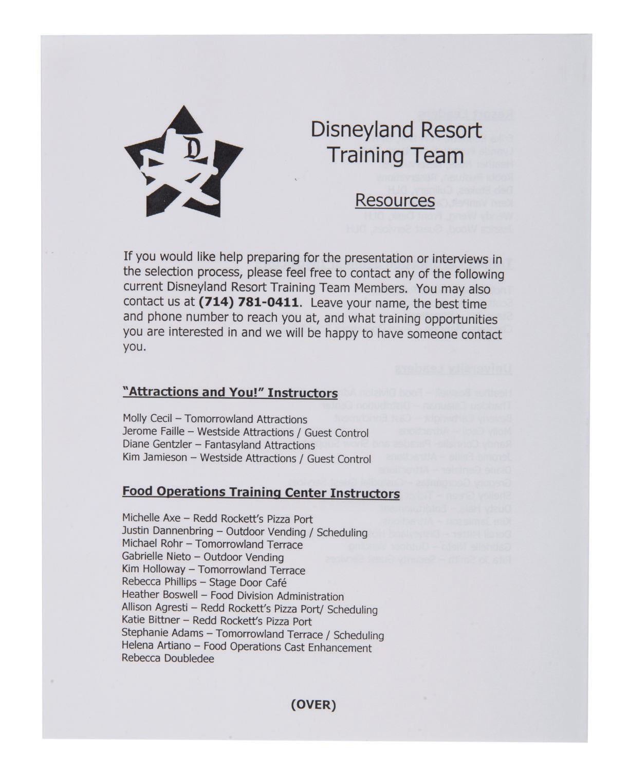 (Disneyland,1980s) An embossed Disney folder containing employment information prepared by Disney University for Disneyland Cast Members. The unique collection of Park employment ephemera includes a 7-page Disney Employment Opportunities pack dated "December 1, 1988," a Welcome to the Show Business orientation script, a "Driving for Disneyland" brochure, (3) pages pertaining to the Disneyland Resort Training Team, a Disney University Roll Call sheet, and a Disneyland Resort application. Contained in the 11.75"x9.5" folder, the documents are in very good condition with minor creases, folds, and surface wear.