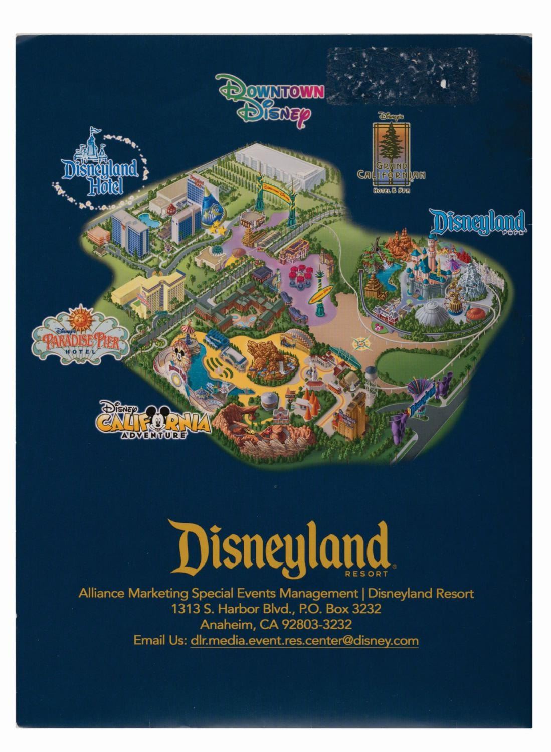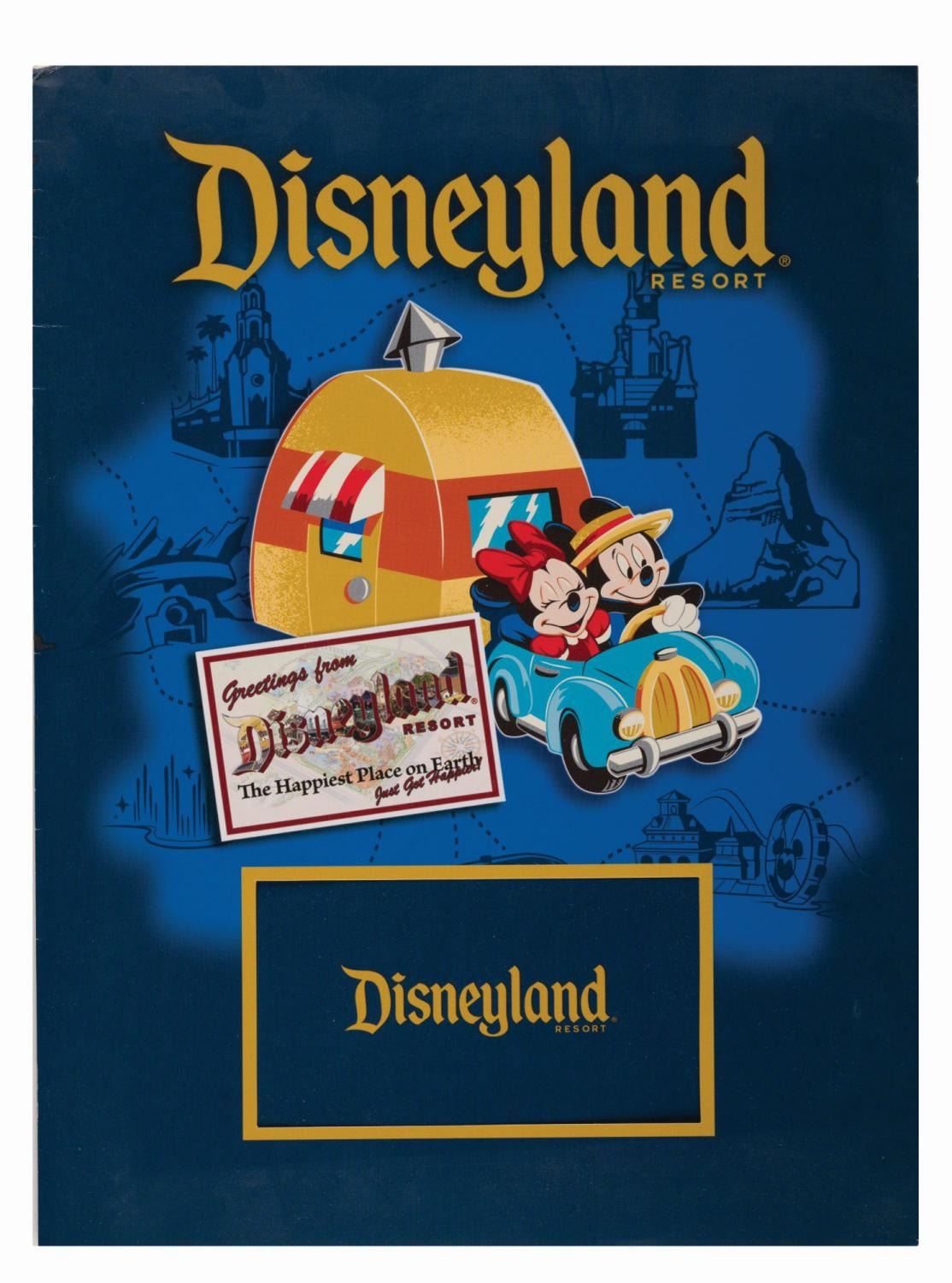 (Disneyland, 2010s) A Disneyland Resort special events folder with artwork of Mickey and Minnie. Included are a matching card and a compass sticker. The folder is in good condition with light handling wear.