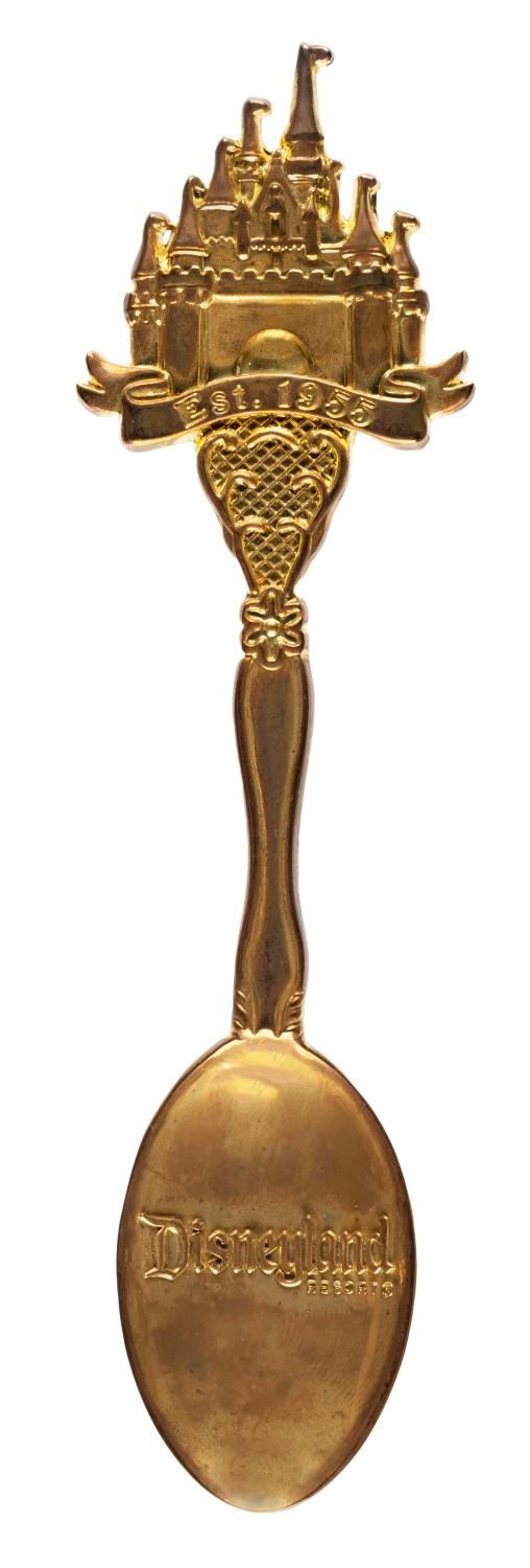 (Disneyland, 2005-06) A Disneyland Resort "Disney Treasures" gold-plated teaspoon with a relief of Sleeping Beauty Castle. Measuring 5.25" long, this spoon is in very good condition with tarnish and minor wear.