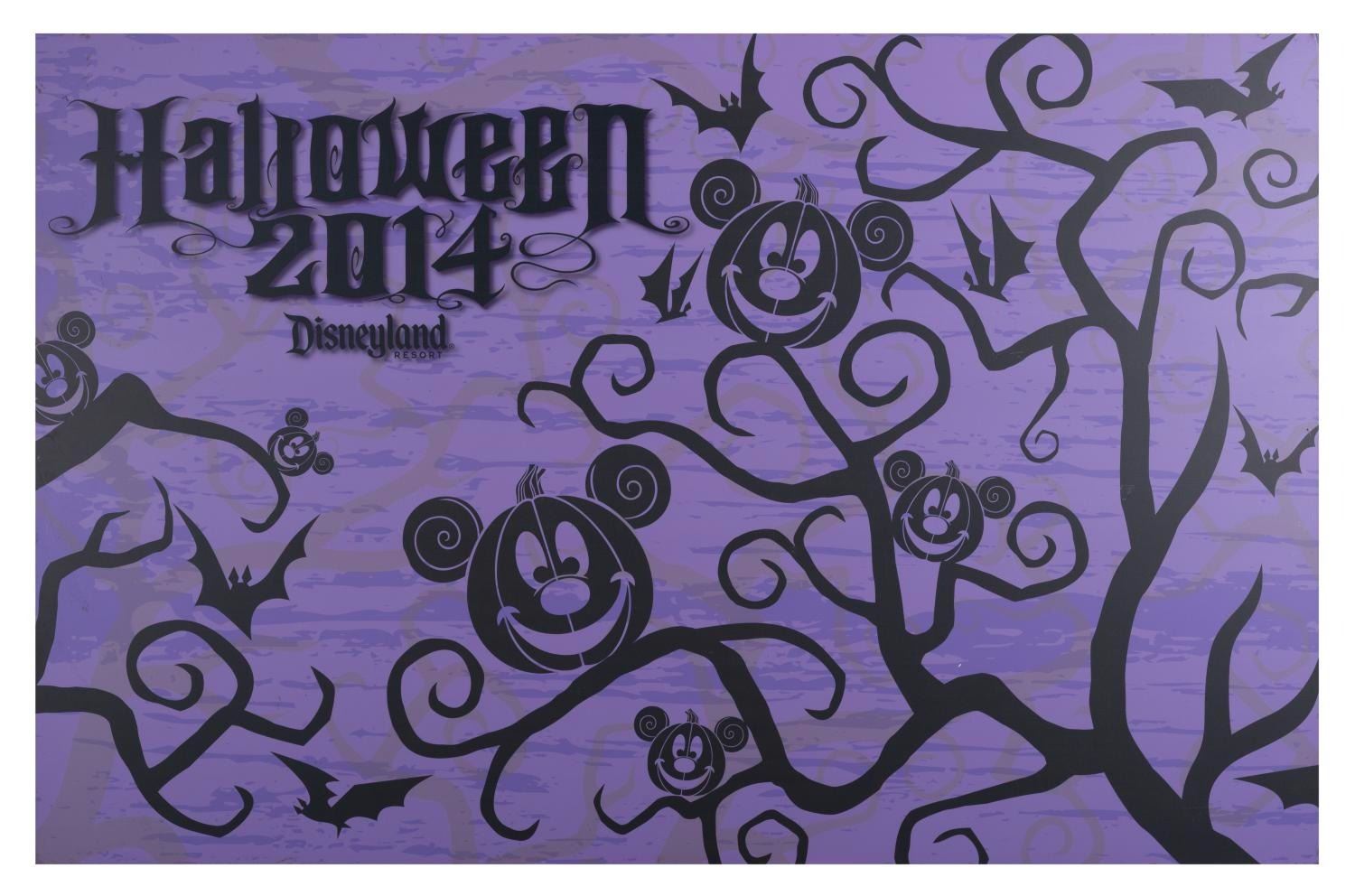 (Disneyland, 2014) A Halloween 2014 sign from Disneyland Resort with a Mickey Mouse Jack-O-Lantern motif. Measuring 46"x30", this durable foamboard sign is in very good condition exhibiting scuffs and wear from Resort display.
