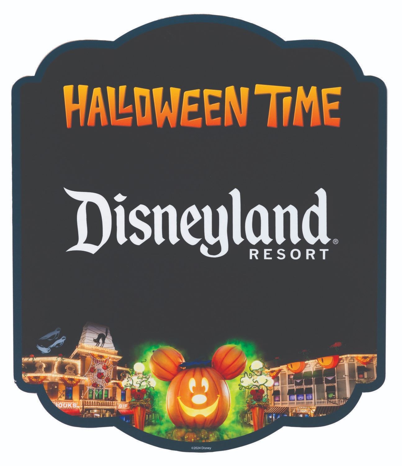 (Disneyland, 2024) A"Halloween Time" sign used to celebrate Halloween throughout the park. The plastic sign has velcro on the reverse for mounting. Measuring 18" x 21.24" the sign is in very good, Park-used condition with minimal scuffs and scratches.
