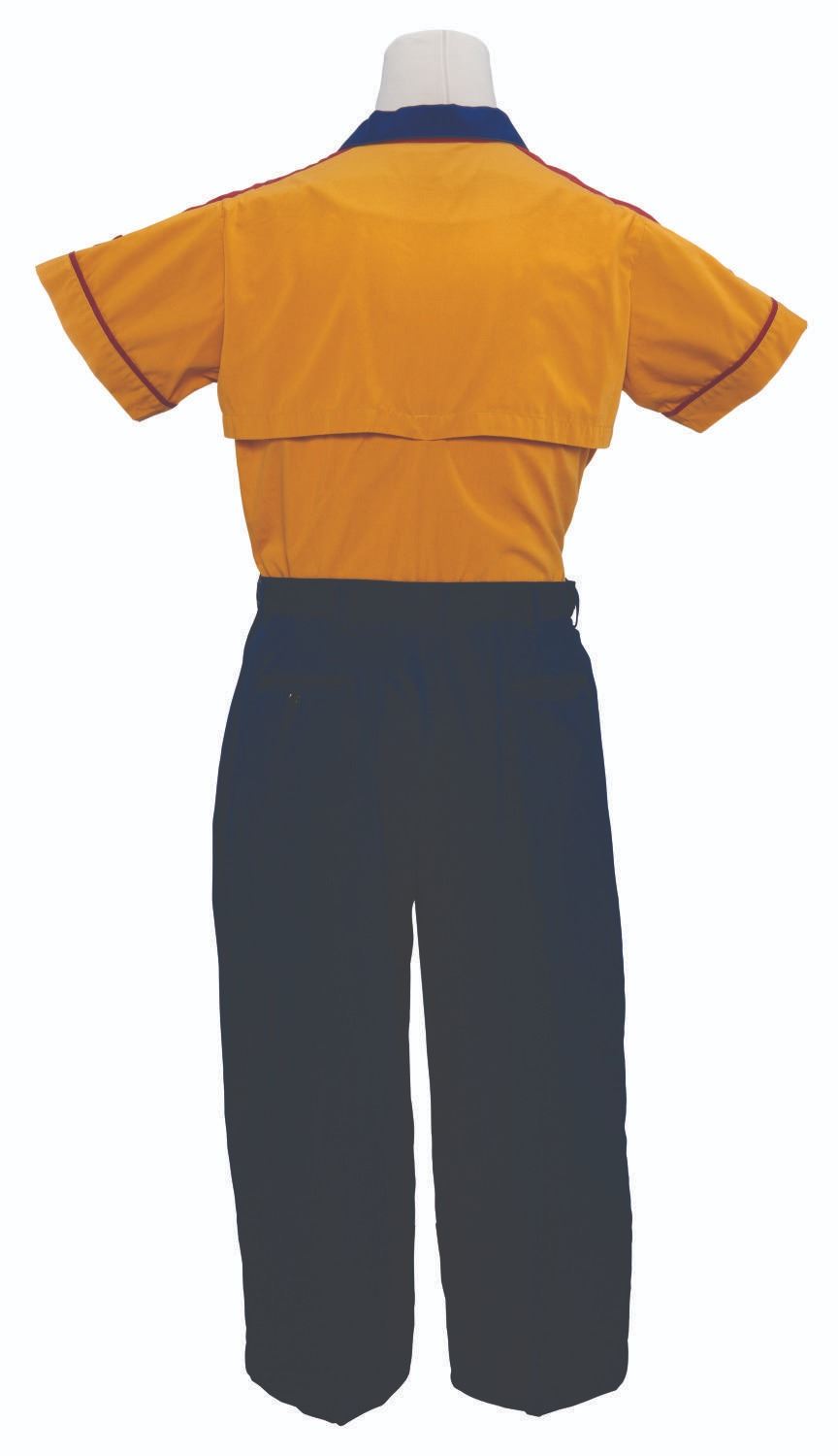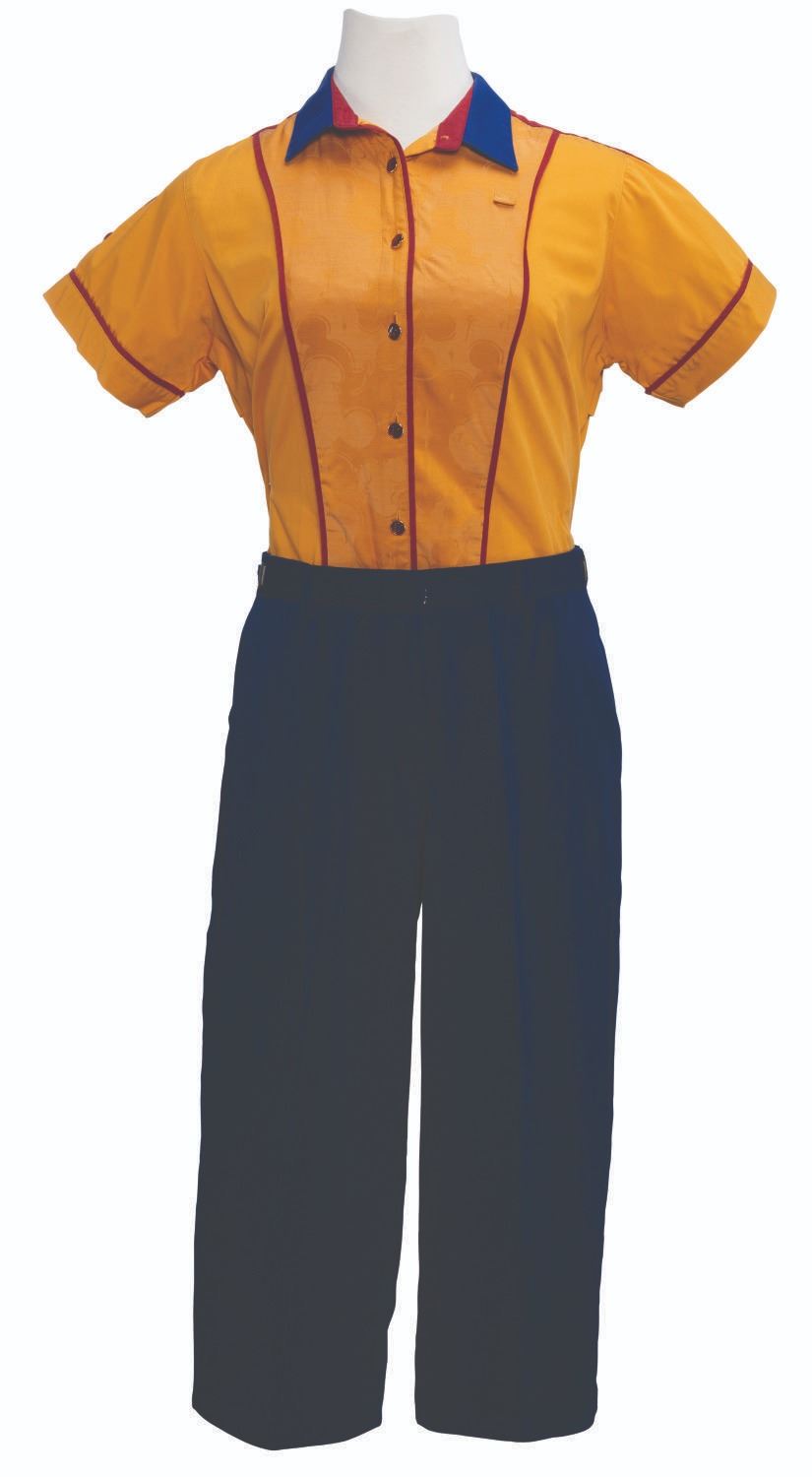 (Disneyland, 2000s) A Disneyland Resort Hostess costume worn by Main Gate Cast Members. The shirt measures an extra large and the pants are a size 42-44. Each piece is in good Park-used condition exhibiting wear from use.