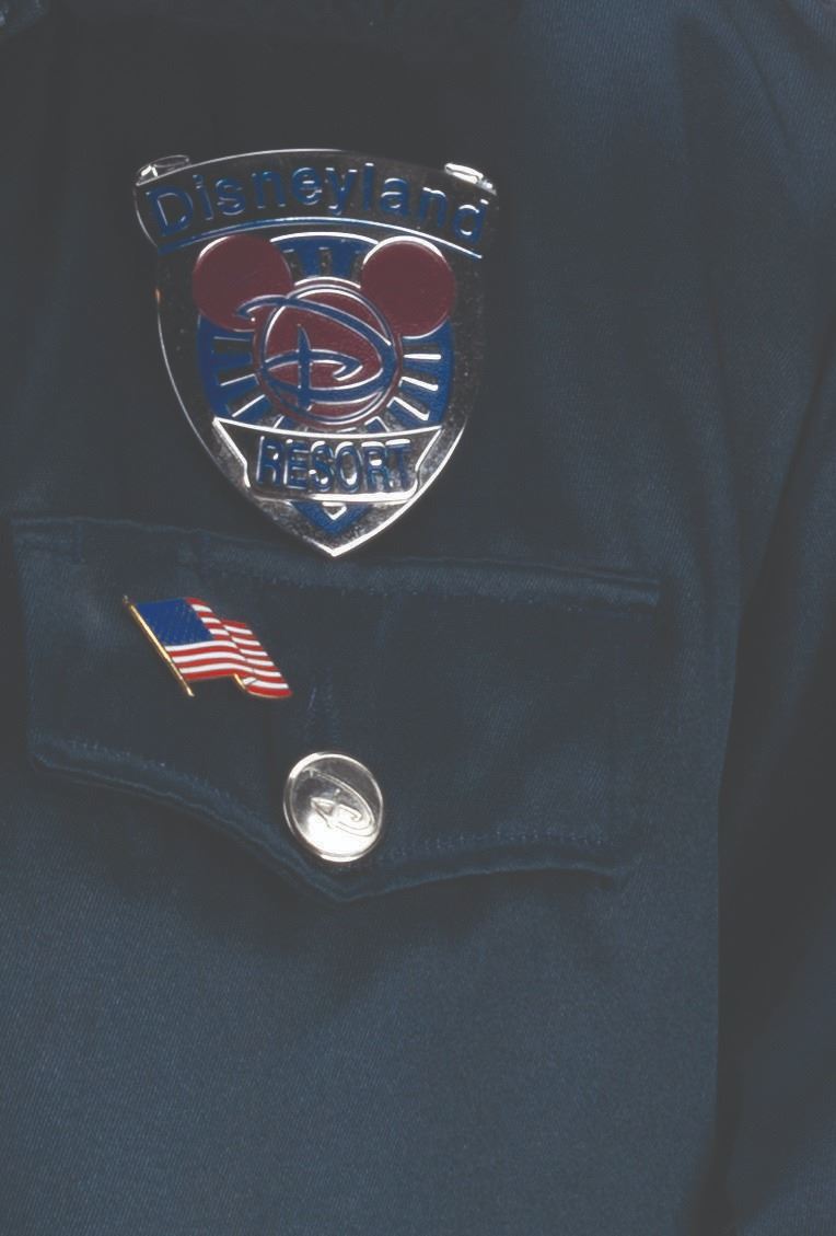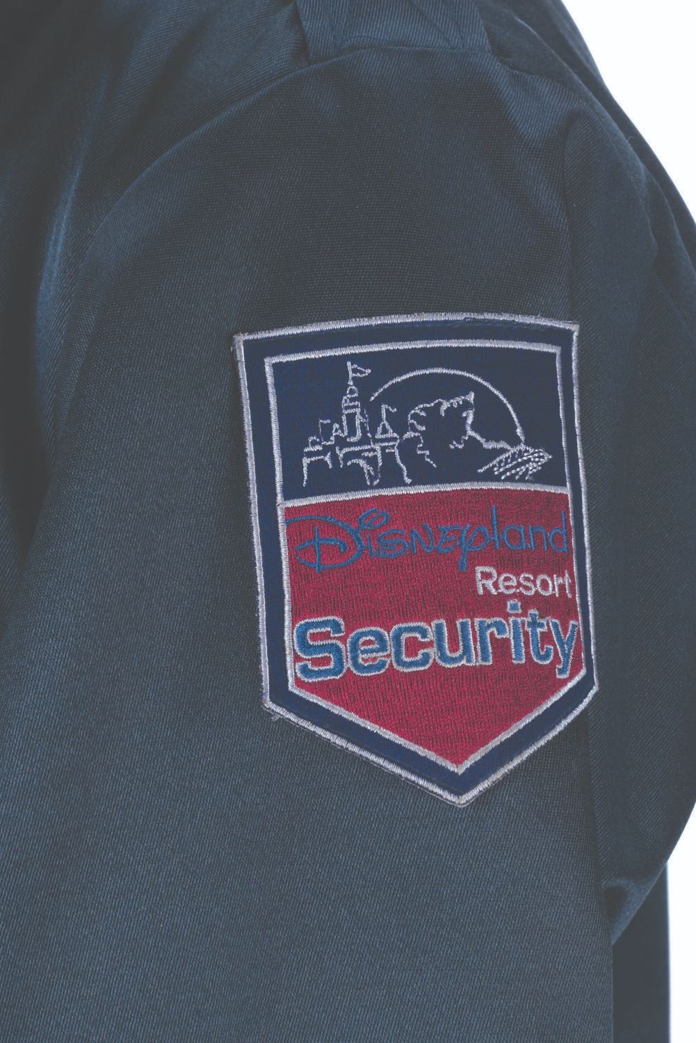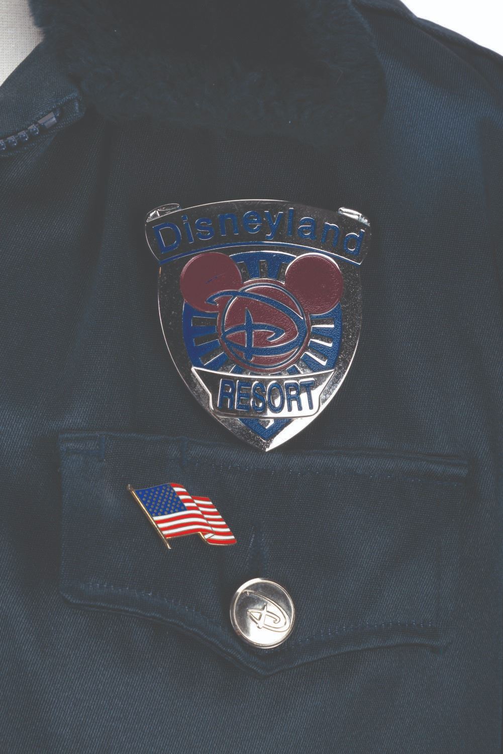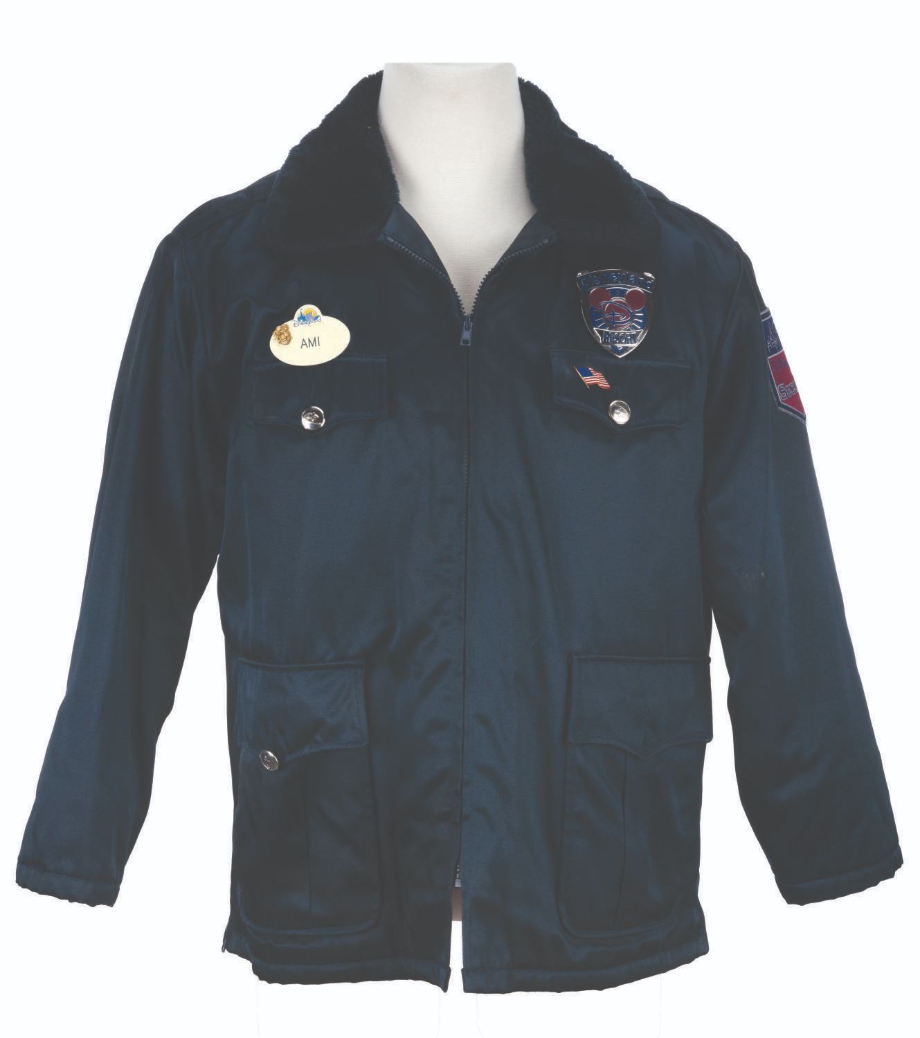 (Disneyland, 2000s) A Security Host uniform coat worn by a Cast Member at the Disneyland Resort. The heavy insulated coat features a security badge, an American flag pin, a one-year of service pin, and an “Ami” nametag, with a Disneyland Resort Security patch sewn onto the left arm. Labeled a unisex M, the coat is in good condition with stains on the left sleeve, scuffs, and wear from Resort use.