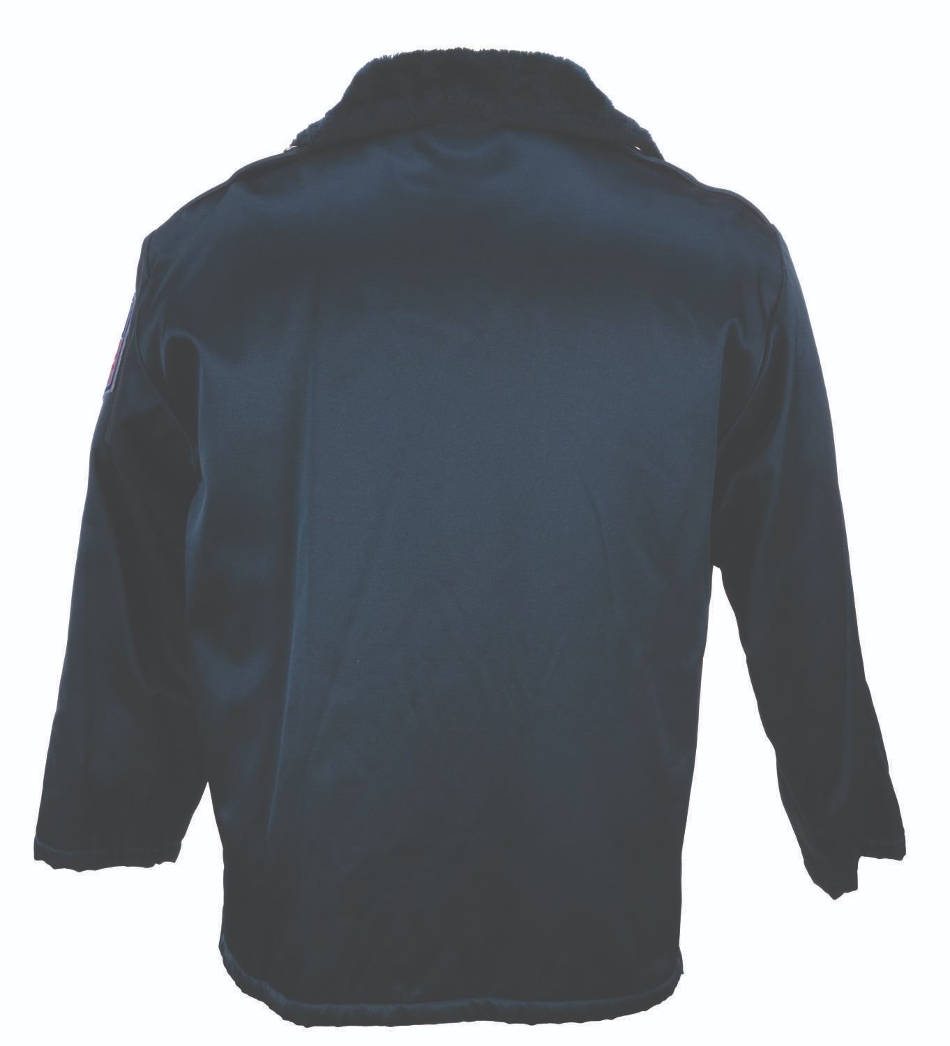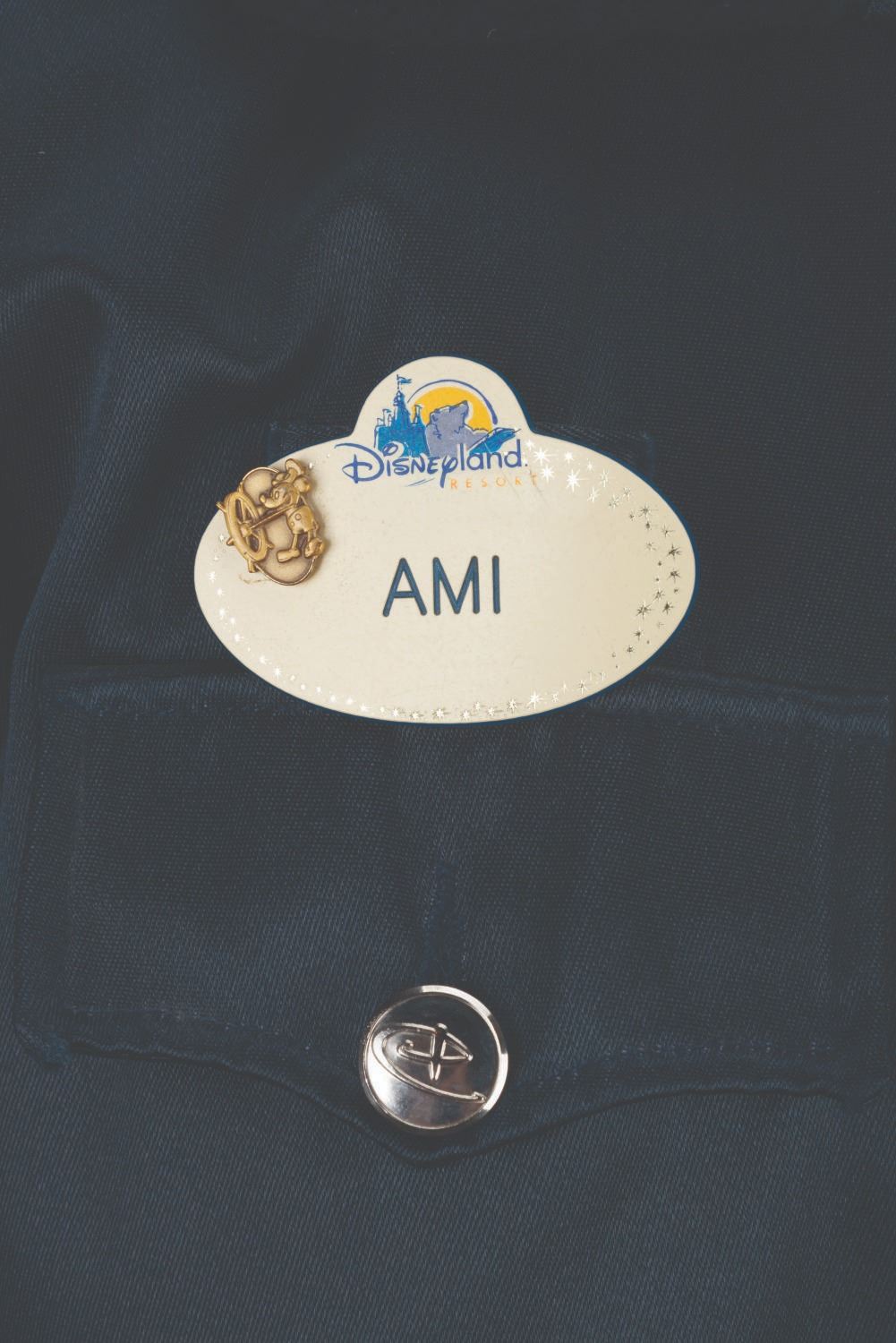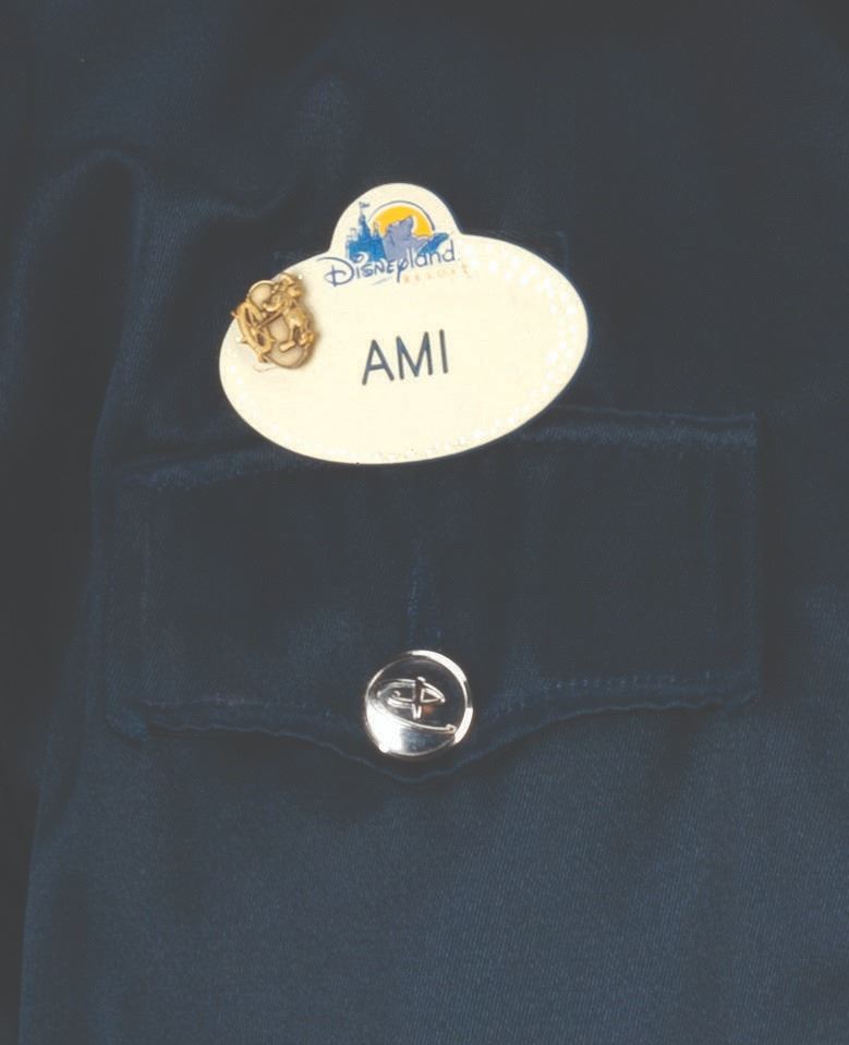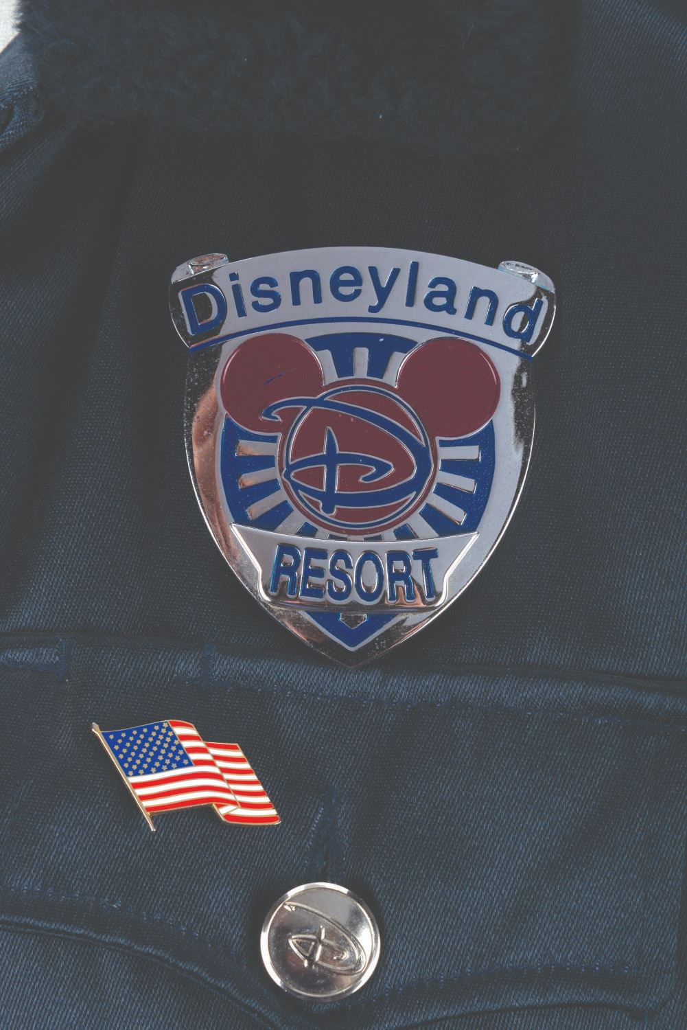 (Disneyland, 2000s) A Security Host uniform coat worn by a Cast Member at the Disneyland Resort. The heavy insulated coat features a security badge, an American flag pin, a one-year of service pin, and an “Ami” nametag, with a Disneyland Resort Security patch sewn onto the left arm. Labeled a unisex M, the coat is in good condition with stains on the left sleeve, scuffs, and wear from Resort use.