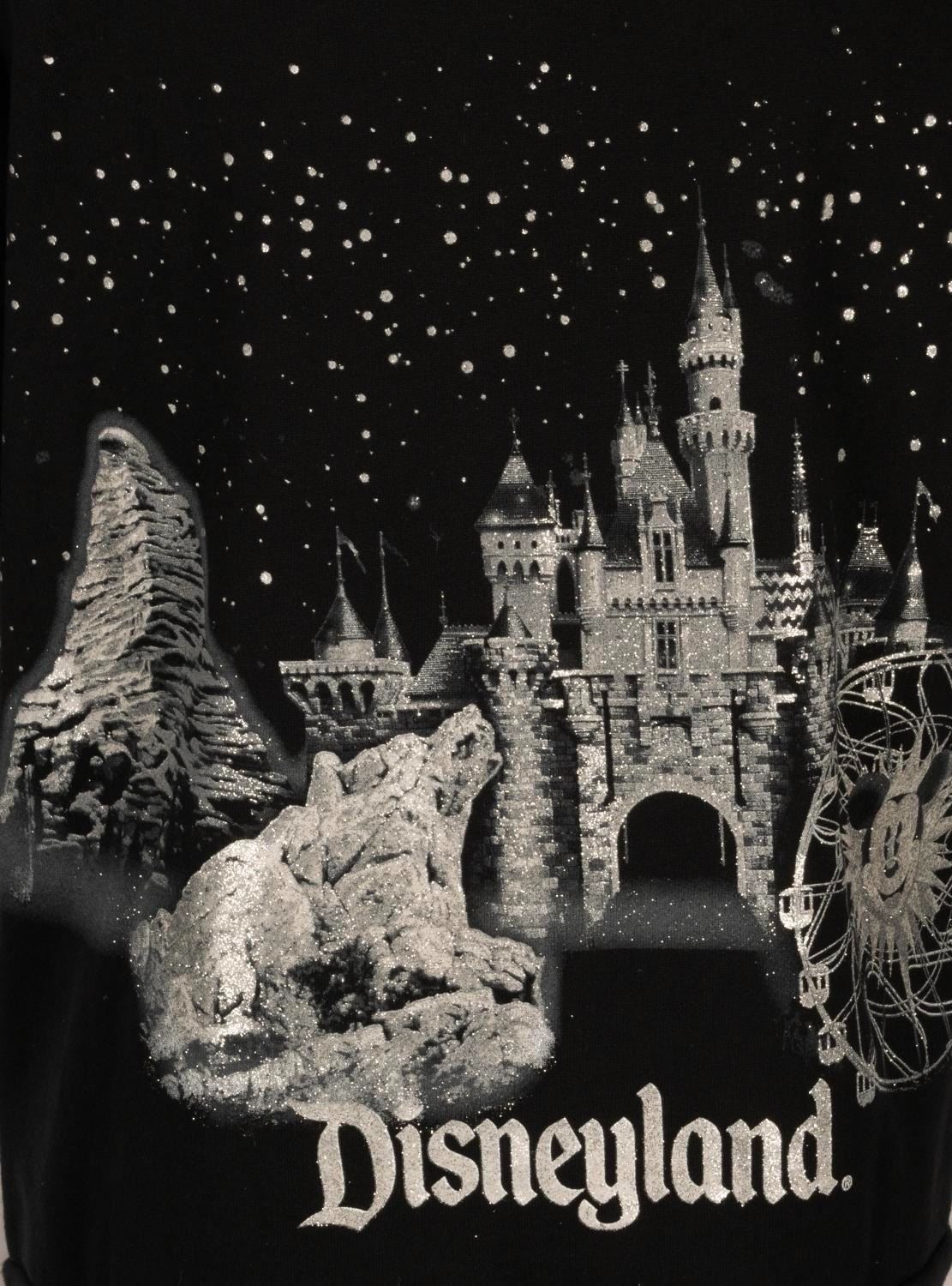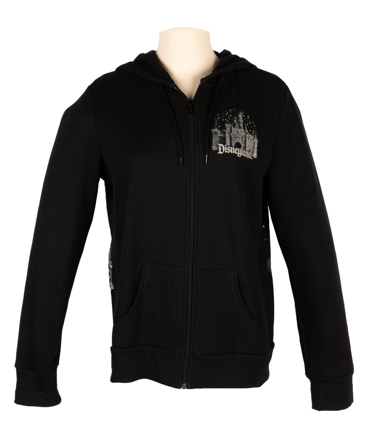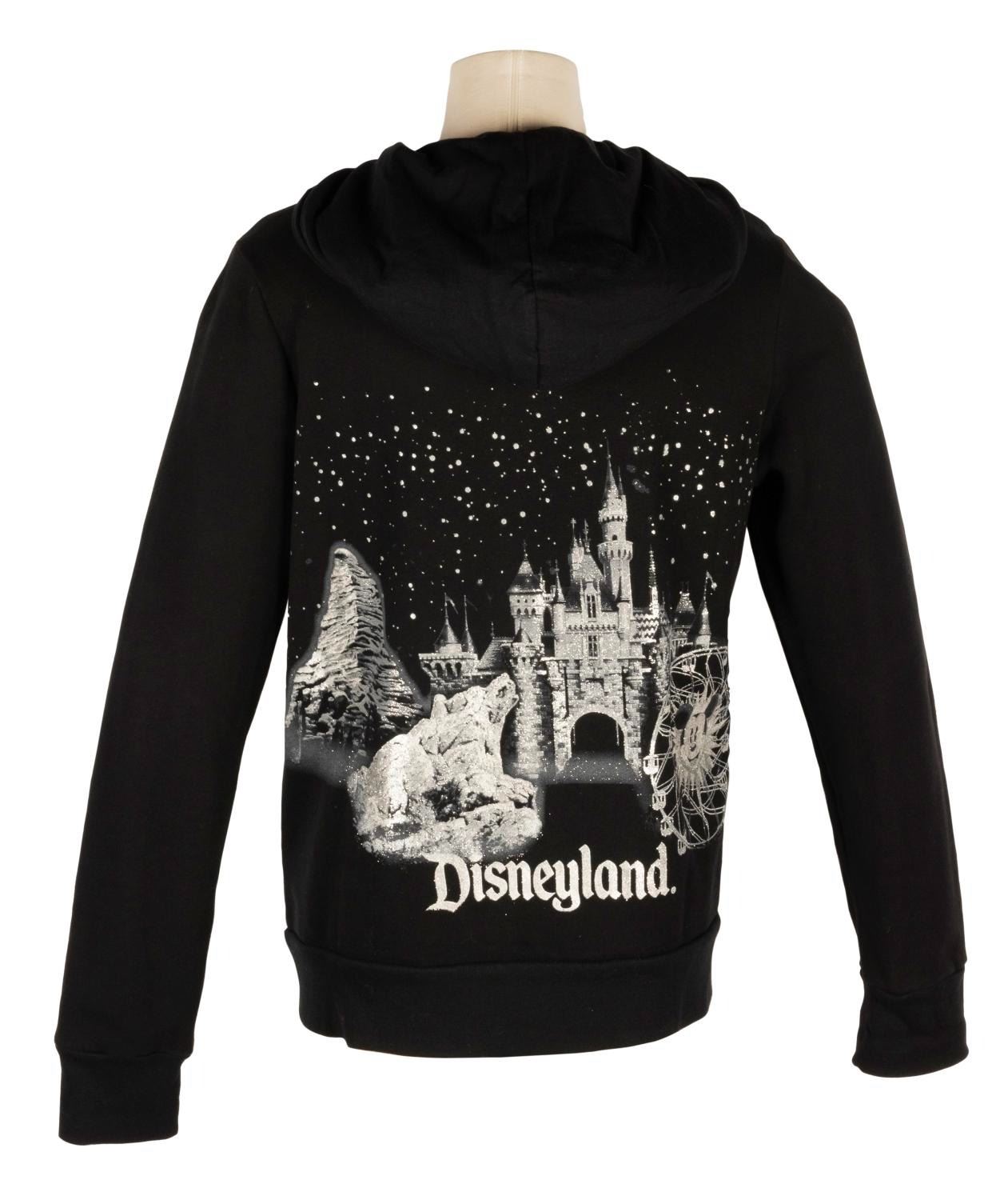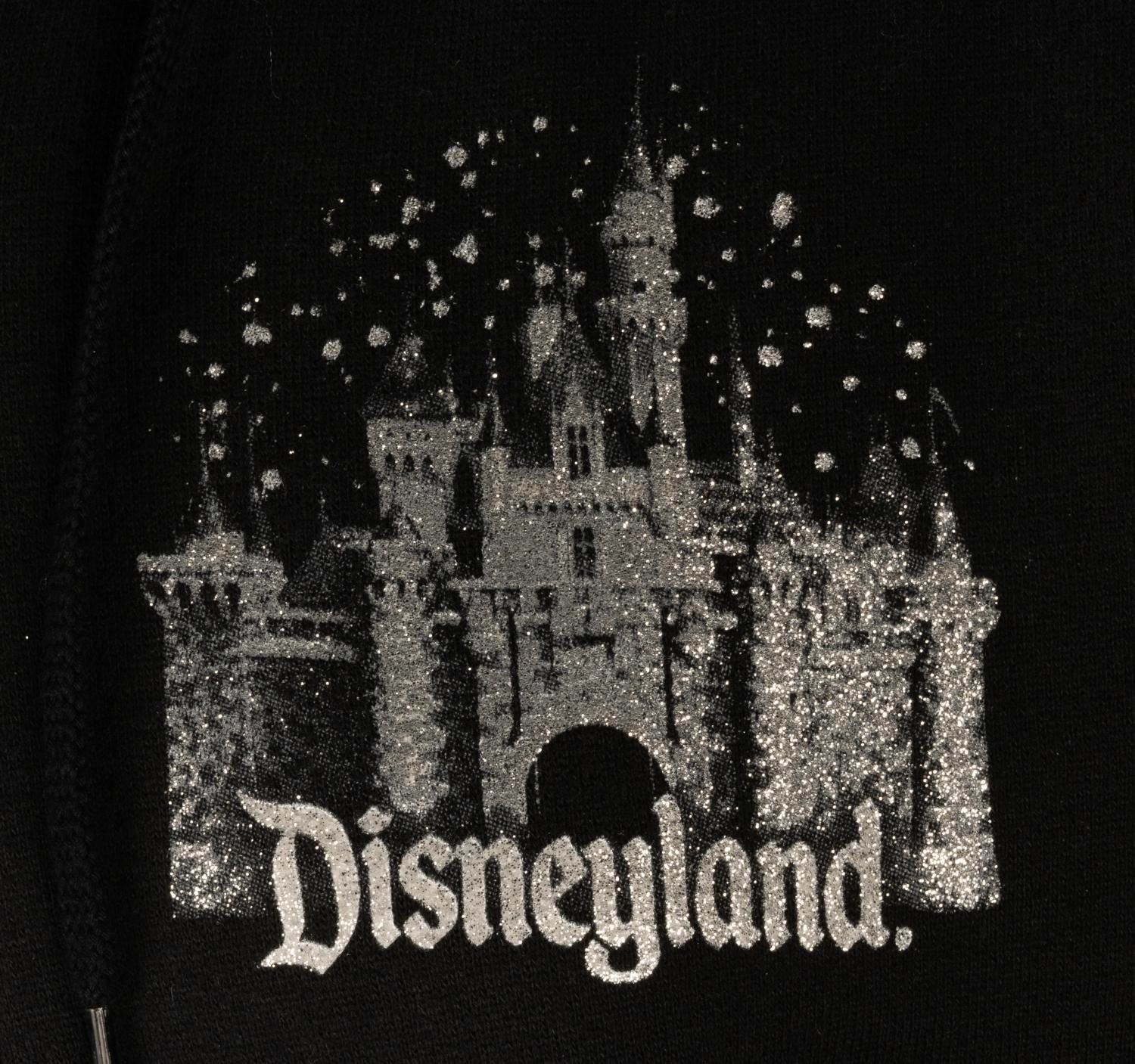 (Disneyland Resort, 2000s) A Disneyland Resort hoodie featuring shiny, glitter-covered iconography from both Disneyland and Disney’s California Adventure. Labeled a size L, the hoodie is in very good condition with light wear.