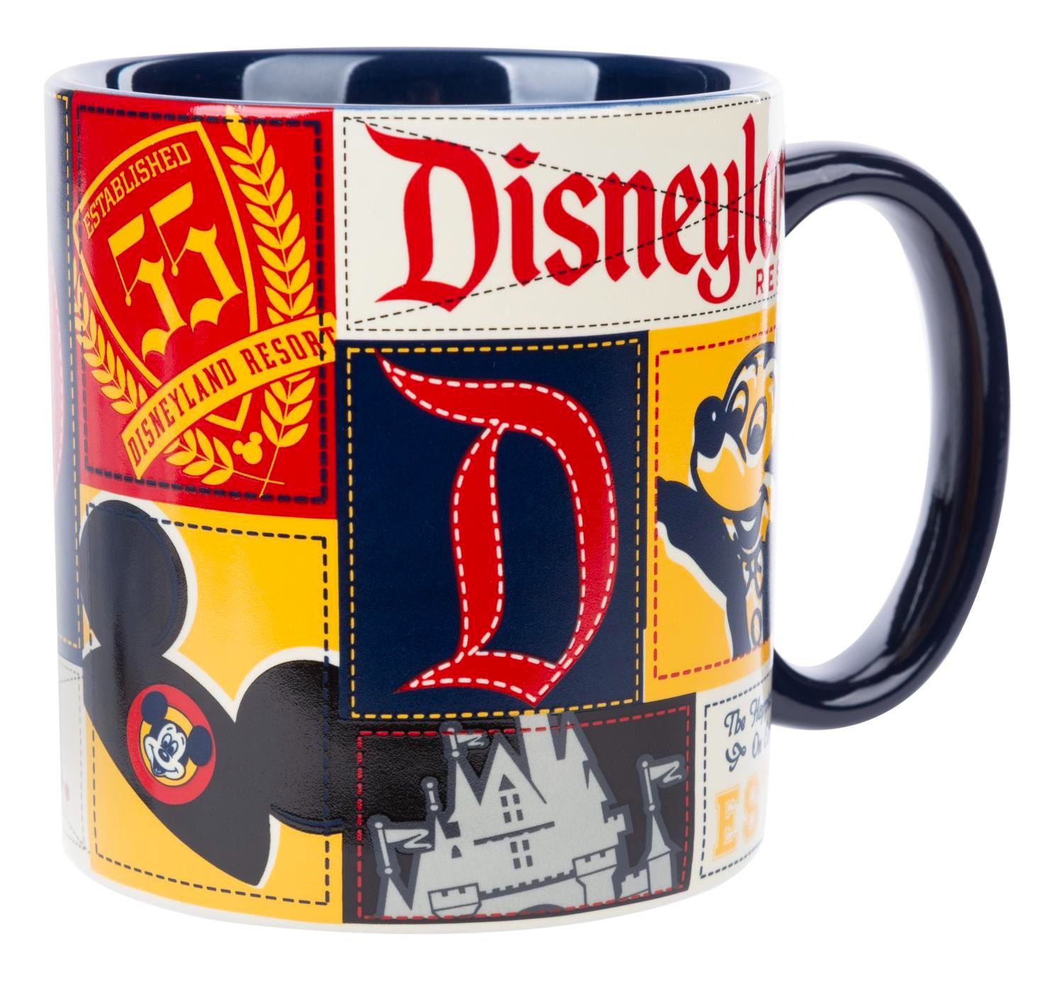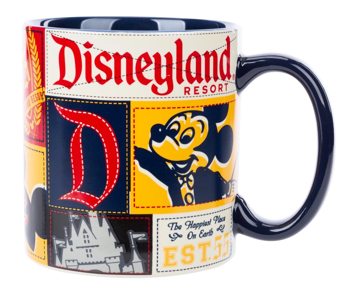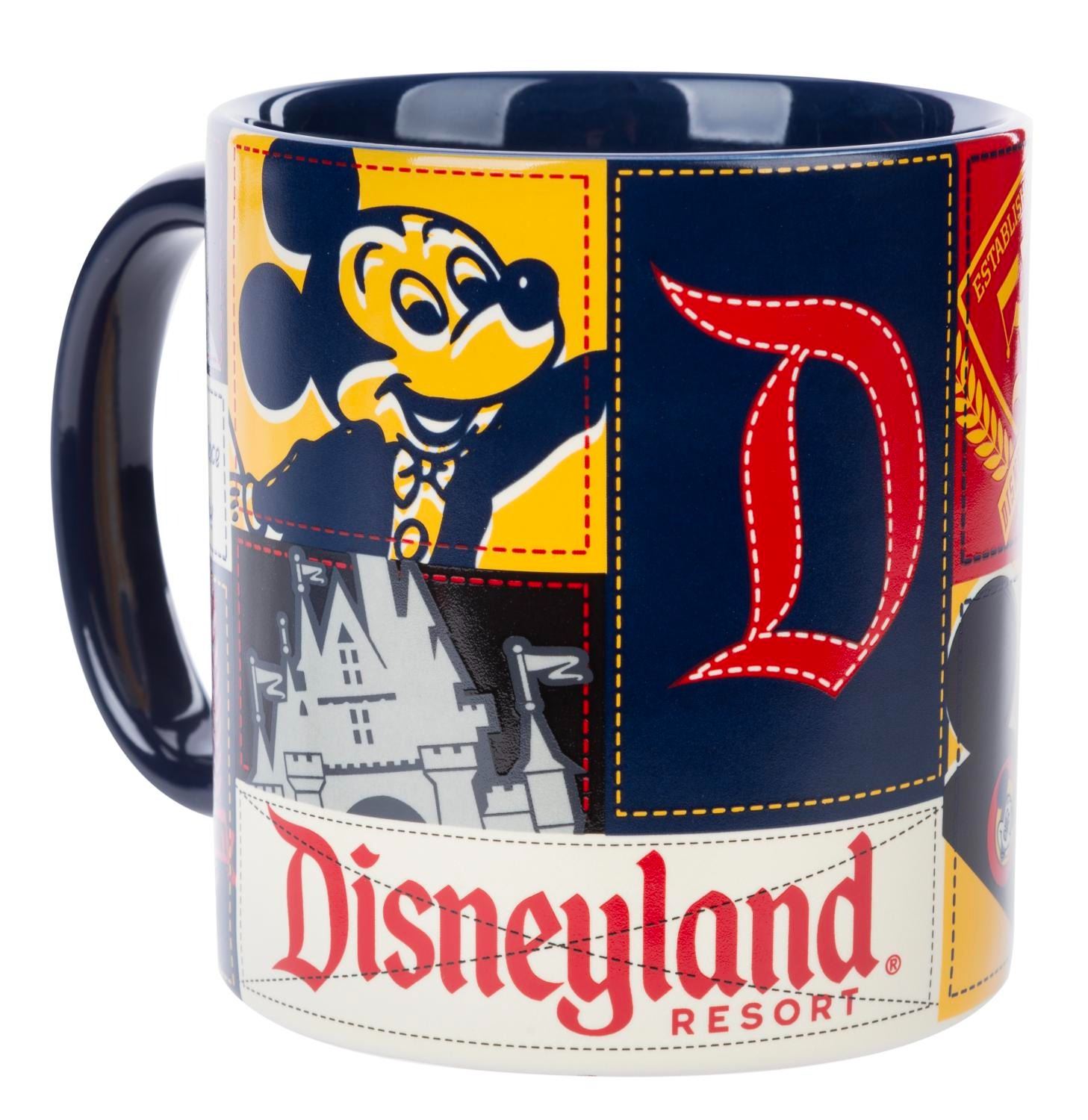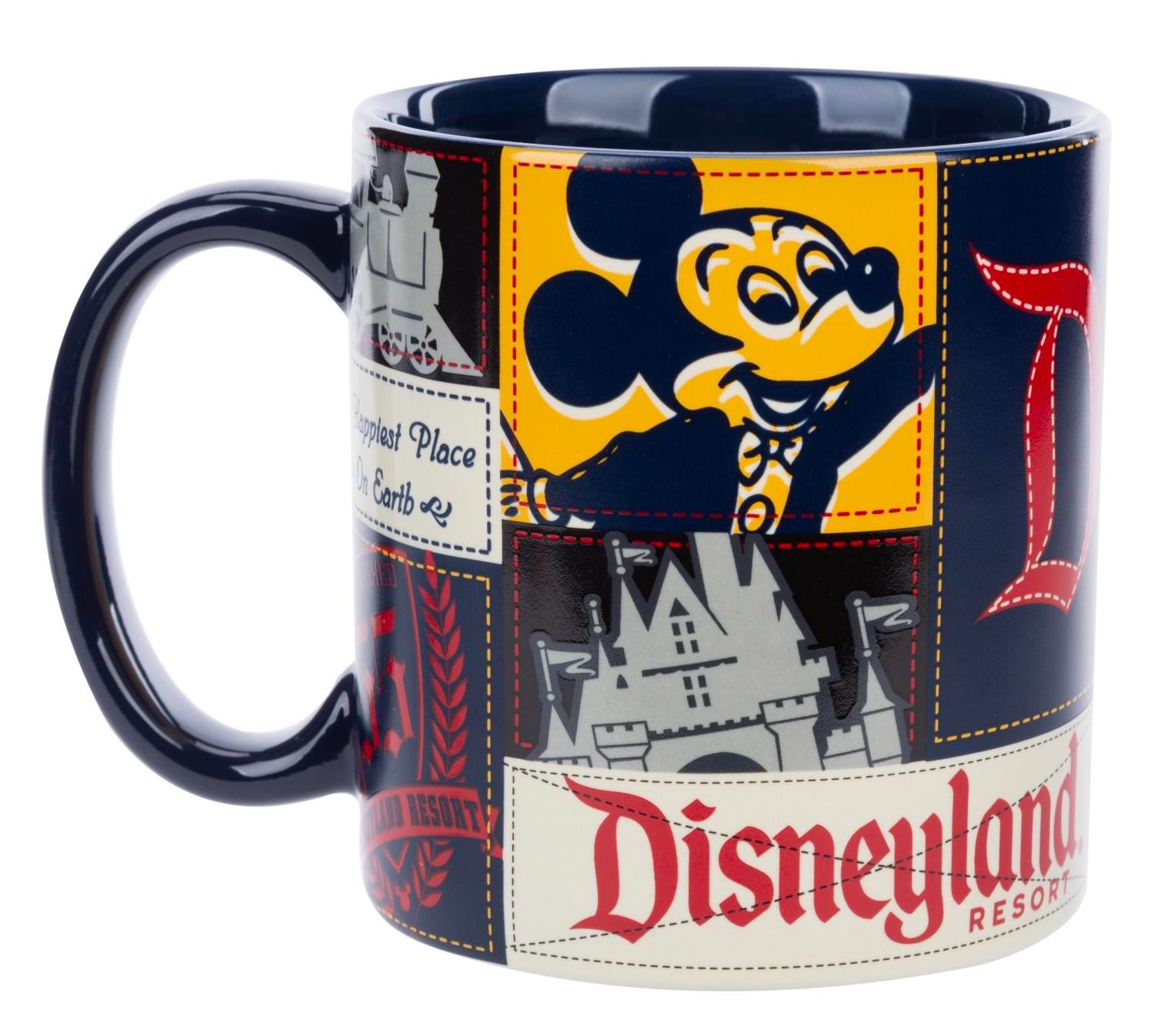 (Disney Parks, 2000s) A Disneyland Resort souvenir mug with three-color retro images of Sleeping Beauty Castle, a train, and Mickey Mouse. Measuring 4" tall and 5.5" in diameter, this cup is in fine condition.
