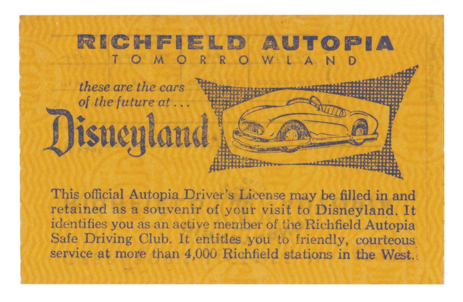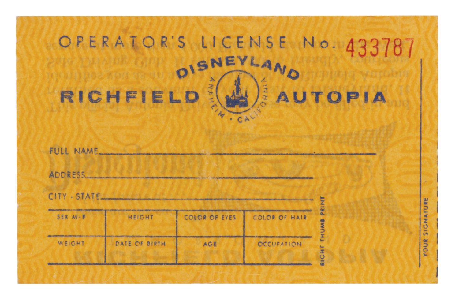 (Disneyland, 1950s-60s) An early Disneyland - Richfield Autopia Driver's License. This souvenir Operator's License was manufactured by Globe Ticket, numbered 433787, and was distributed upon completion of a Senior Autopia course. Measuring 4"x2.75", the vintage souvenir of Disneyland is in fine condition.
