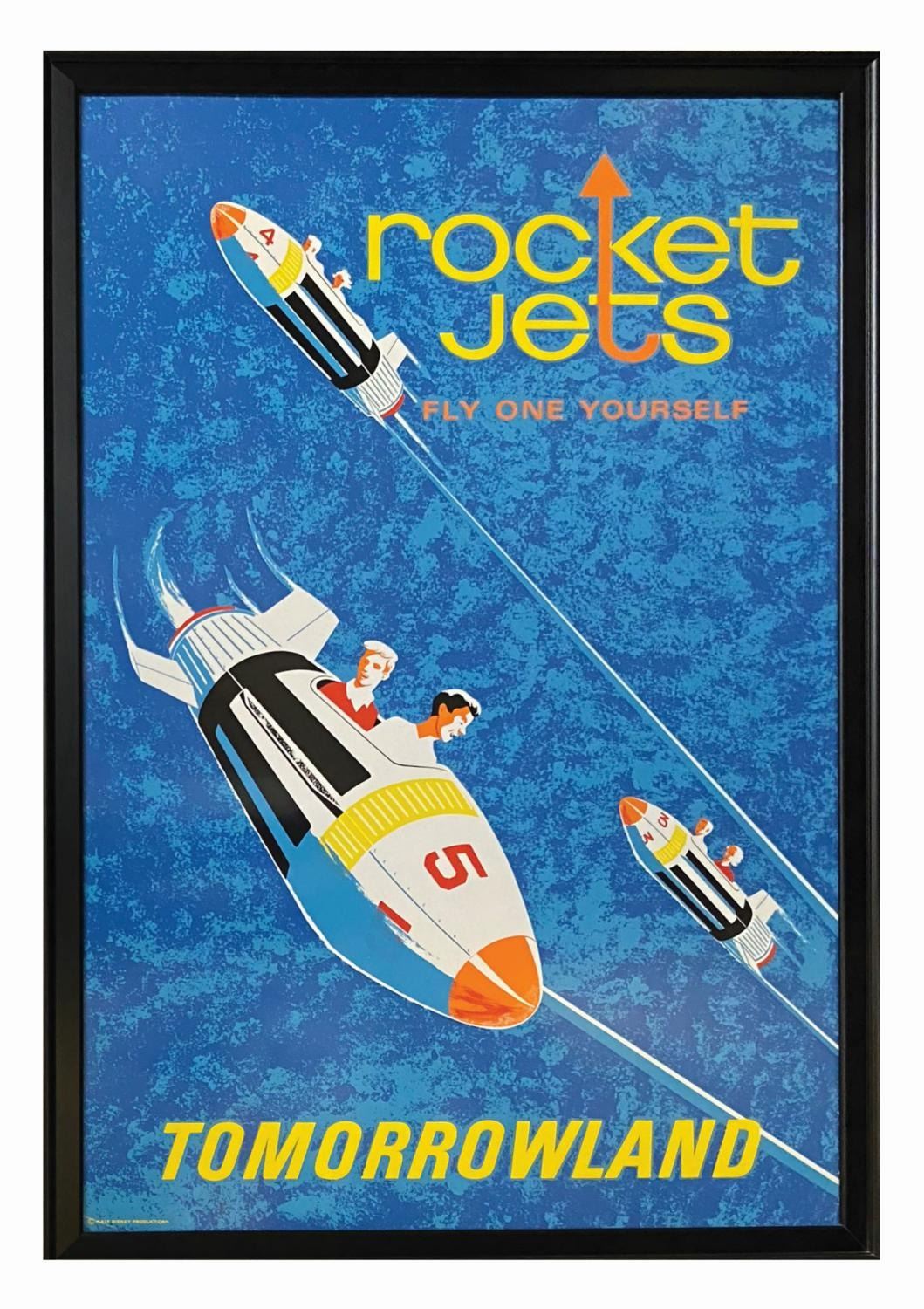 (Disneyland, 1967) An original hand-silkscreened attraction poster for the Rocket Jets in Tomorrowland. The poster was designed by Ken Chapman and borrows heavily from Bjorn Aronson's "Astrojets" poster design, which this attraction replaced in 1967. Measuring 36" x 54", the poster is dry-mounted to foamcore and displays in very good condition with creases, light edge wear, and a 2.5" repaired tear in the bottom left corner. Special shipping arrangements are required. Please inquire before bidding.