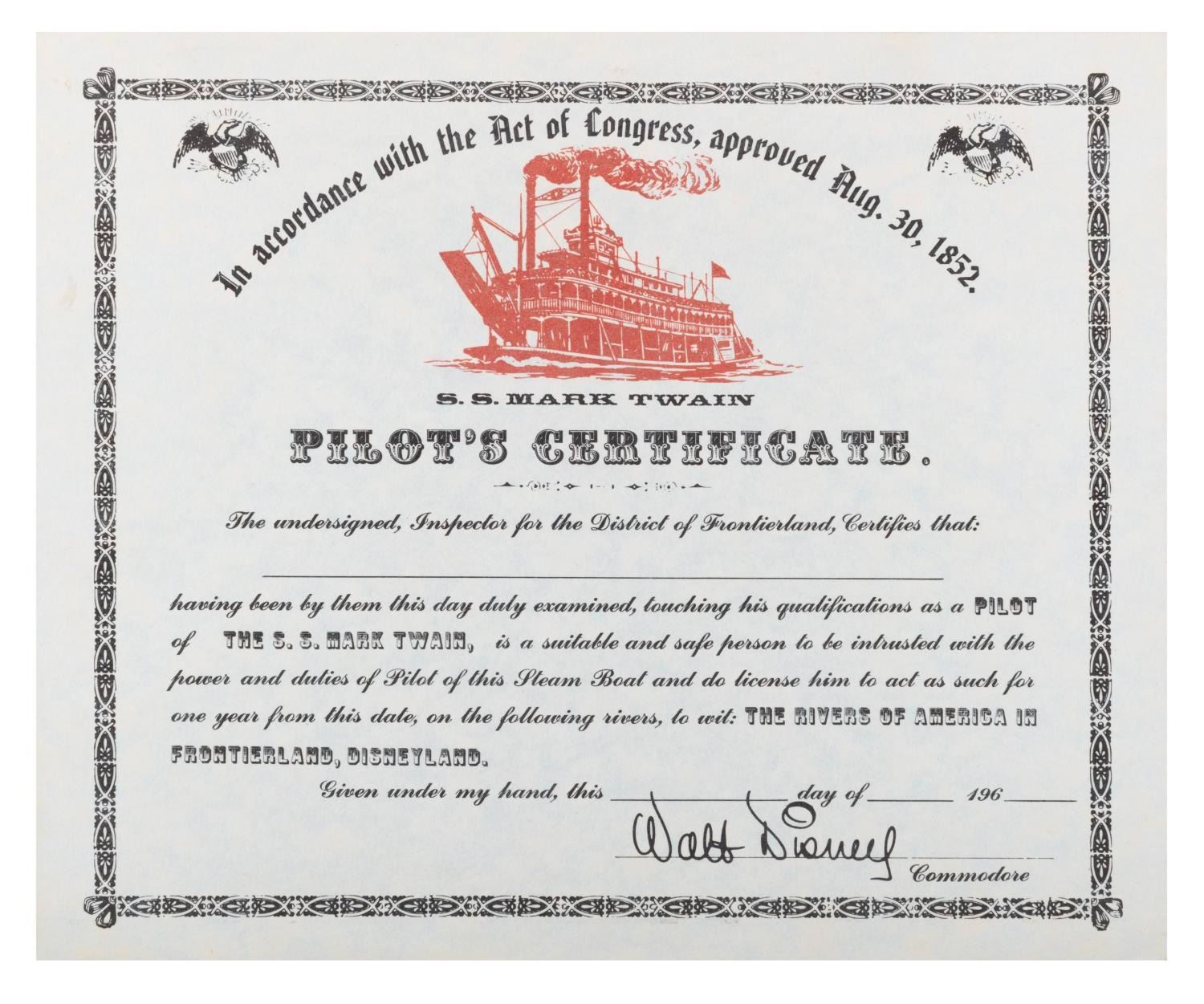 (Disneyland, 1980s) A Mark Twain Pilot's Certificate assuring the bearer is"a suitable and safe person to be entrusted with the power and duties of Pilot of this Steamboat." This souvenir was given to Guests who visited the Mark Twain Wheelhouse. Measuring 8.5" x 7", the certificate is in very good condition with very light handling wear.