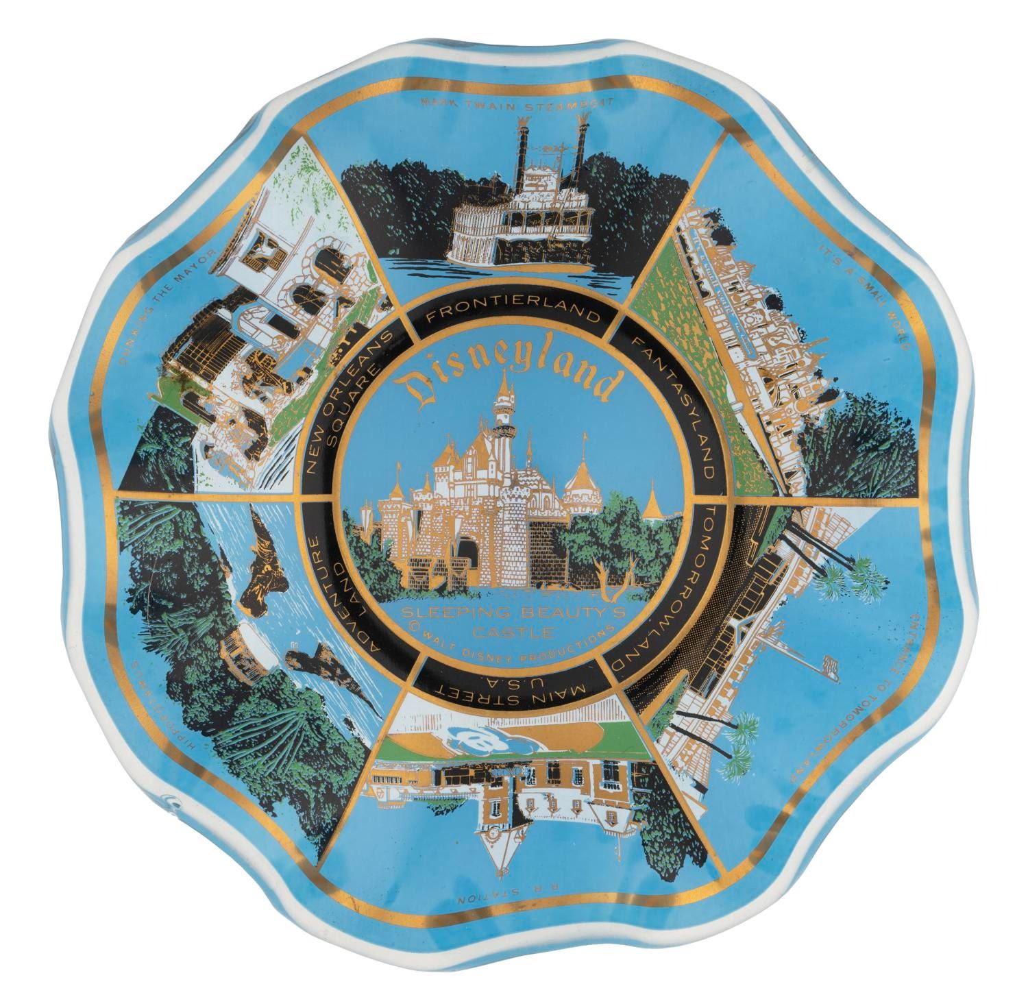 (Disneyland, 1960s) A ruffled glass souvenir dish by Houze Art Productions, depicting Disneyland's six lands including the Pirates of the Caribbean in New Orleans Square. Measuring 7.5" in diameter, this glass dish is in fine condition, exhibiting minor adhesive residue from a price label on its bottom.